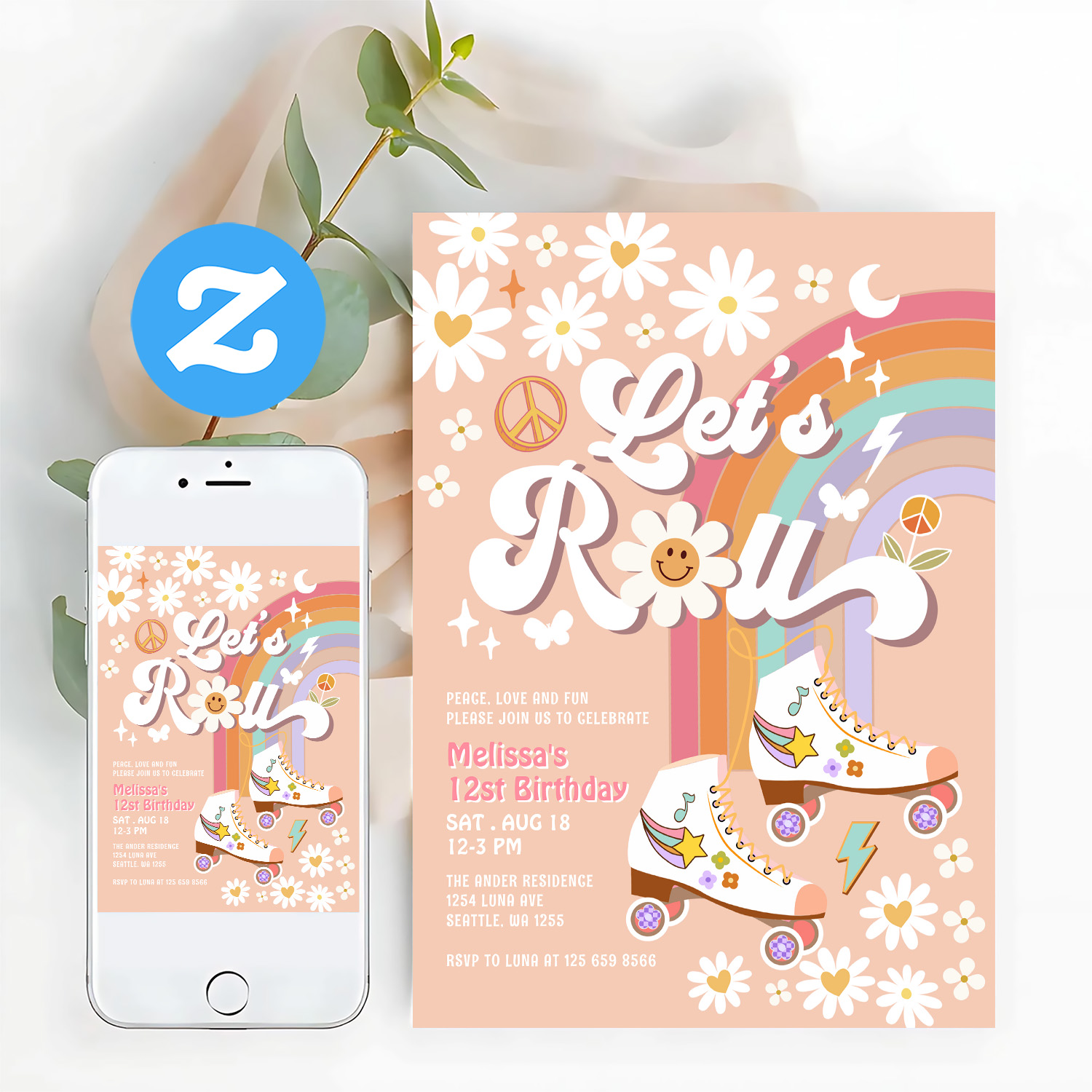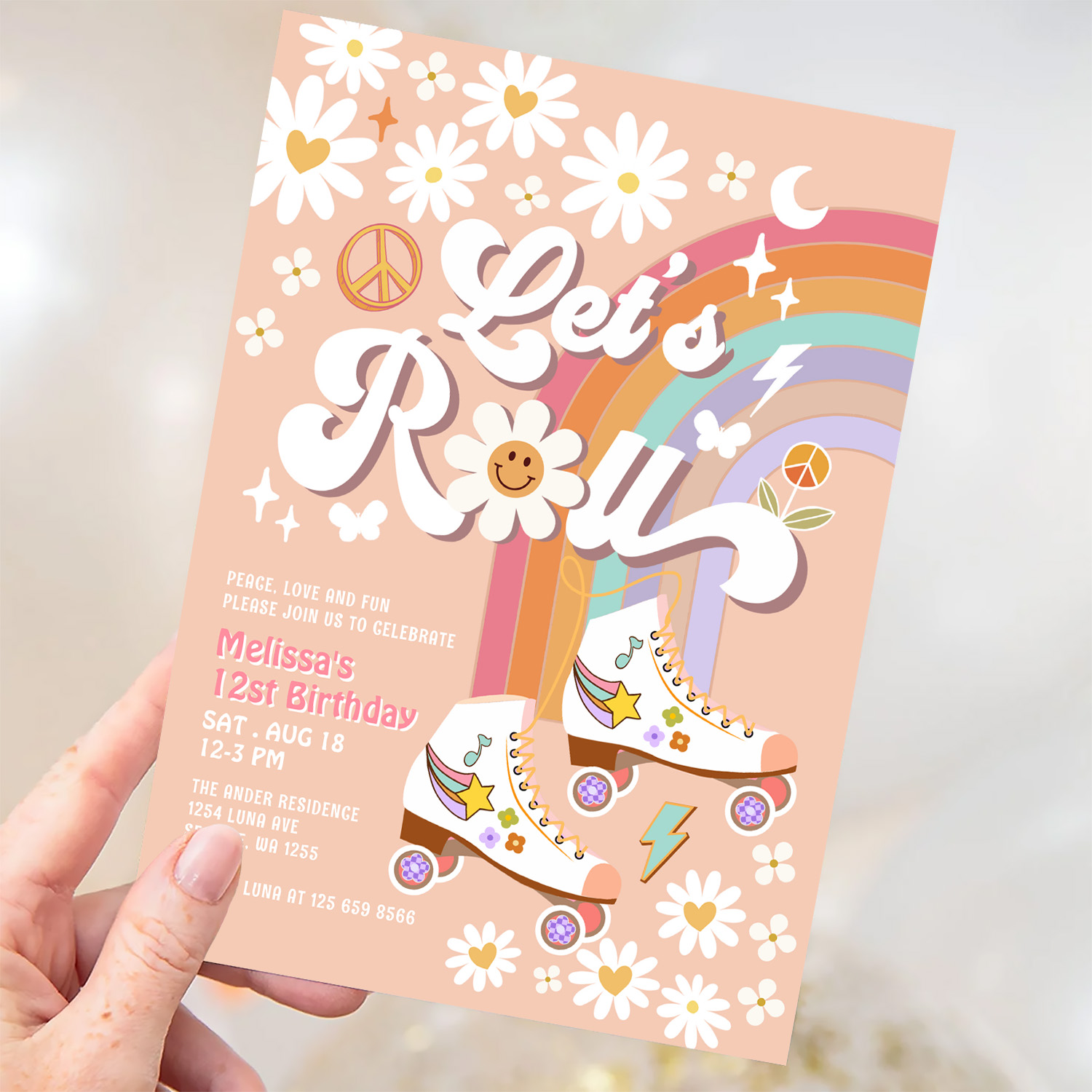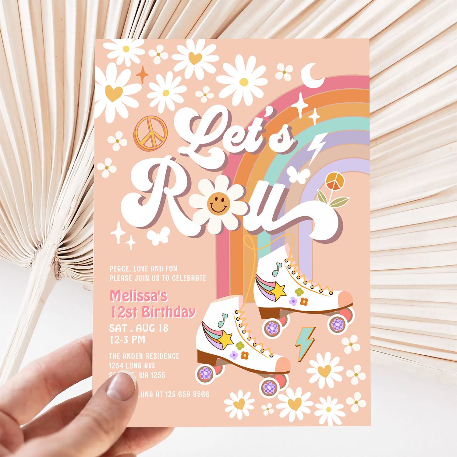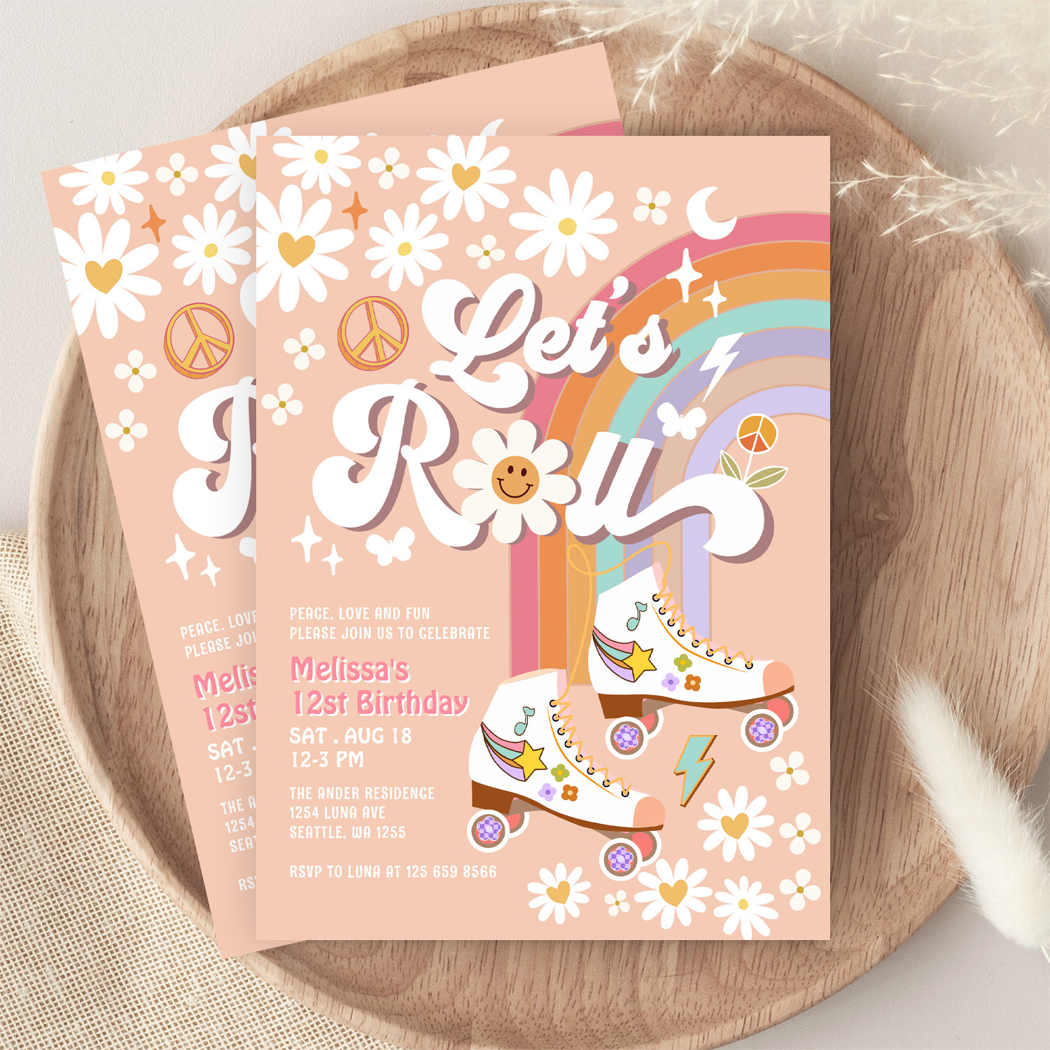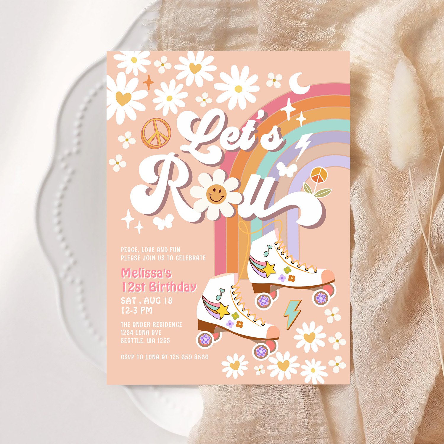 Lets Roll Retro Groovy Roller Skate Daisy Birthday Invitation