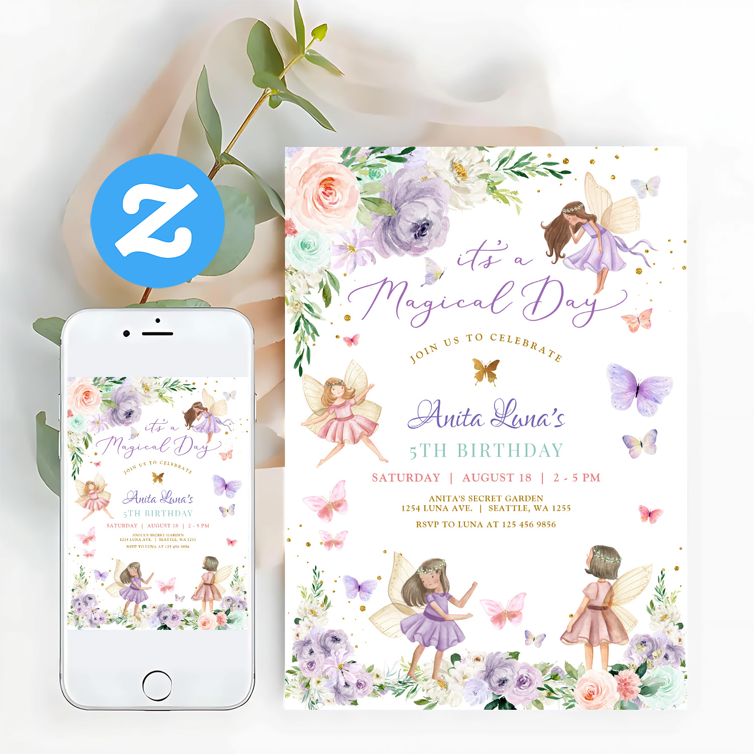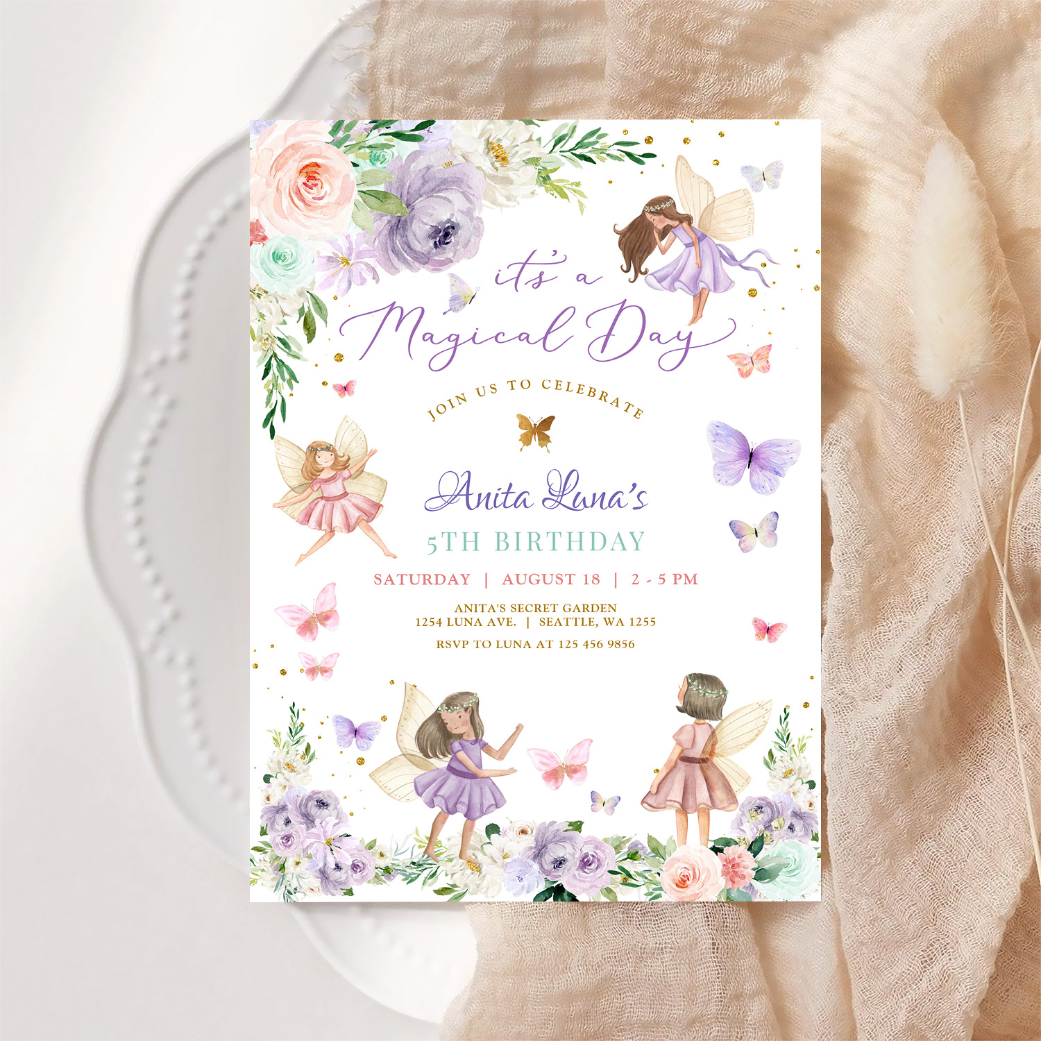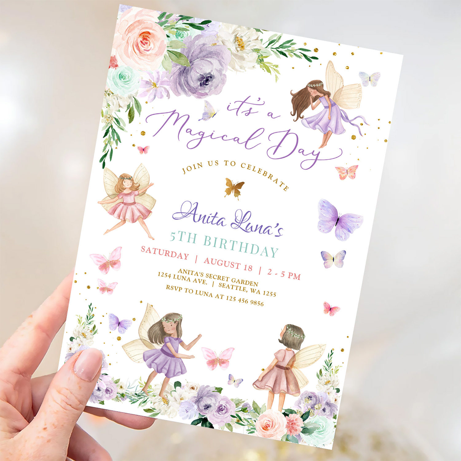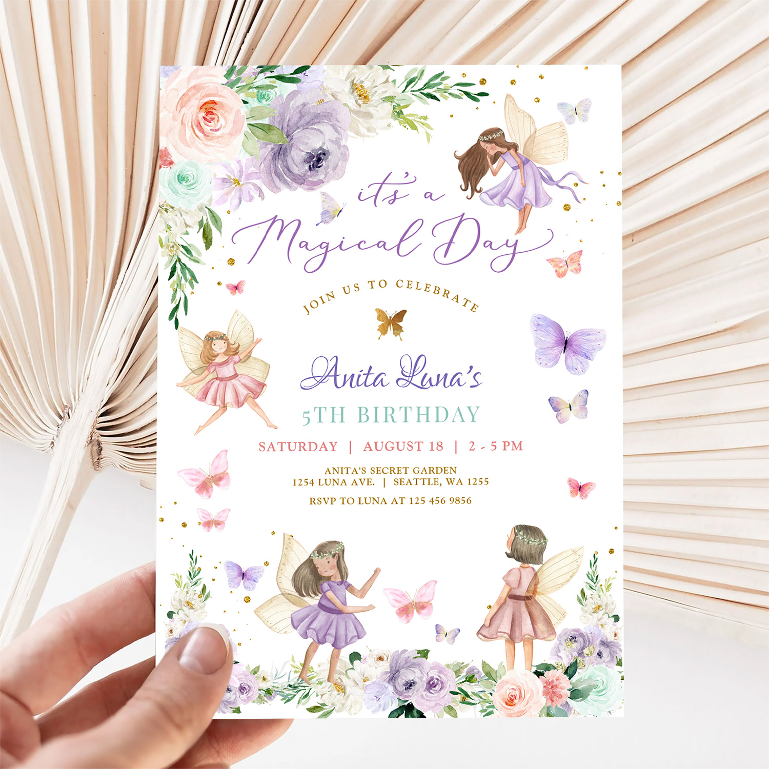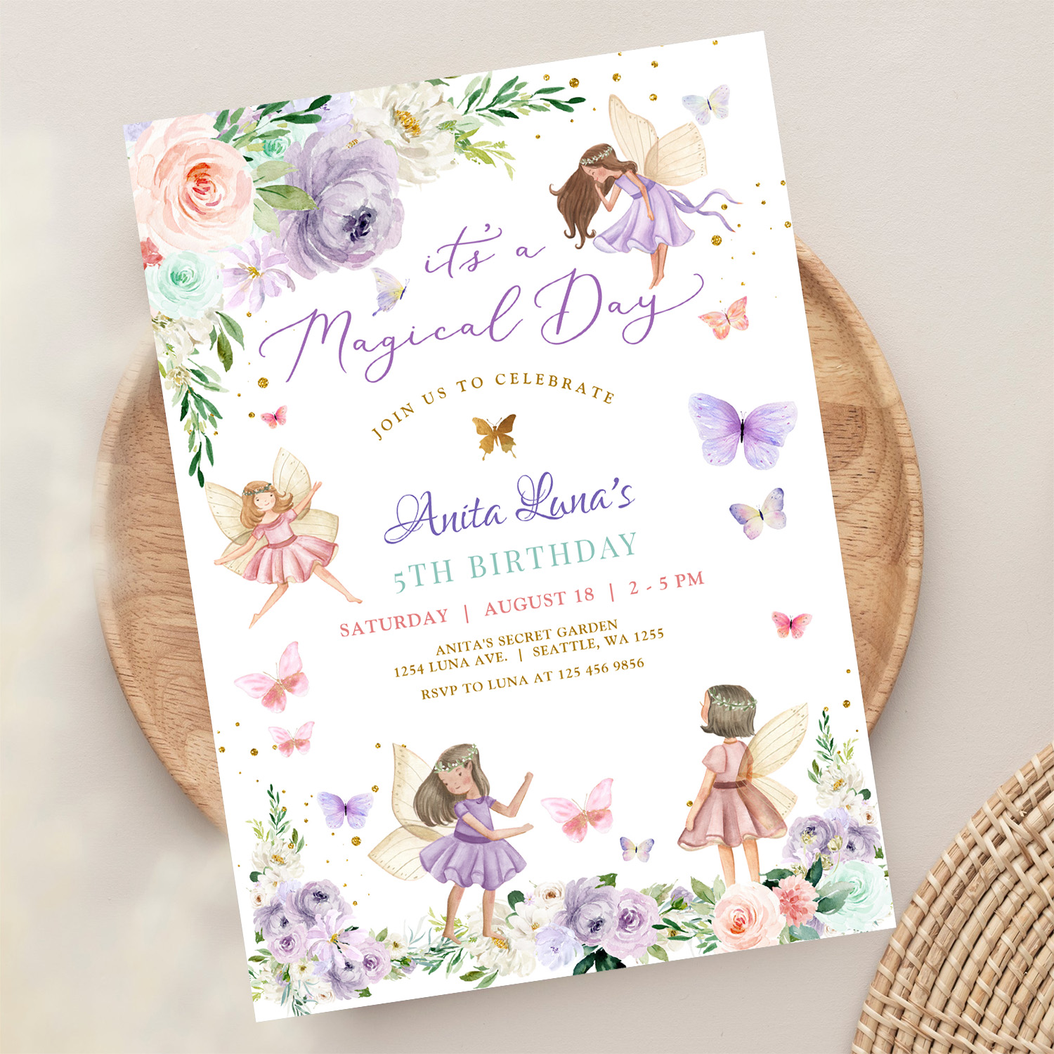 Magic One Purple Pink Fairy Butterfly Birthday Invitation