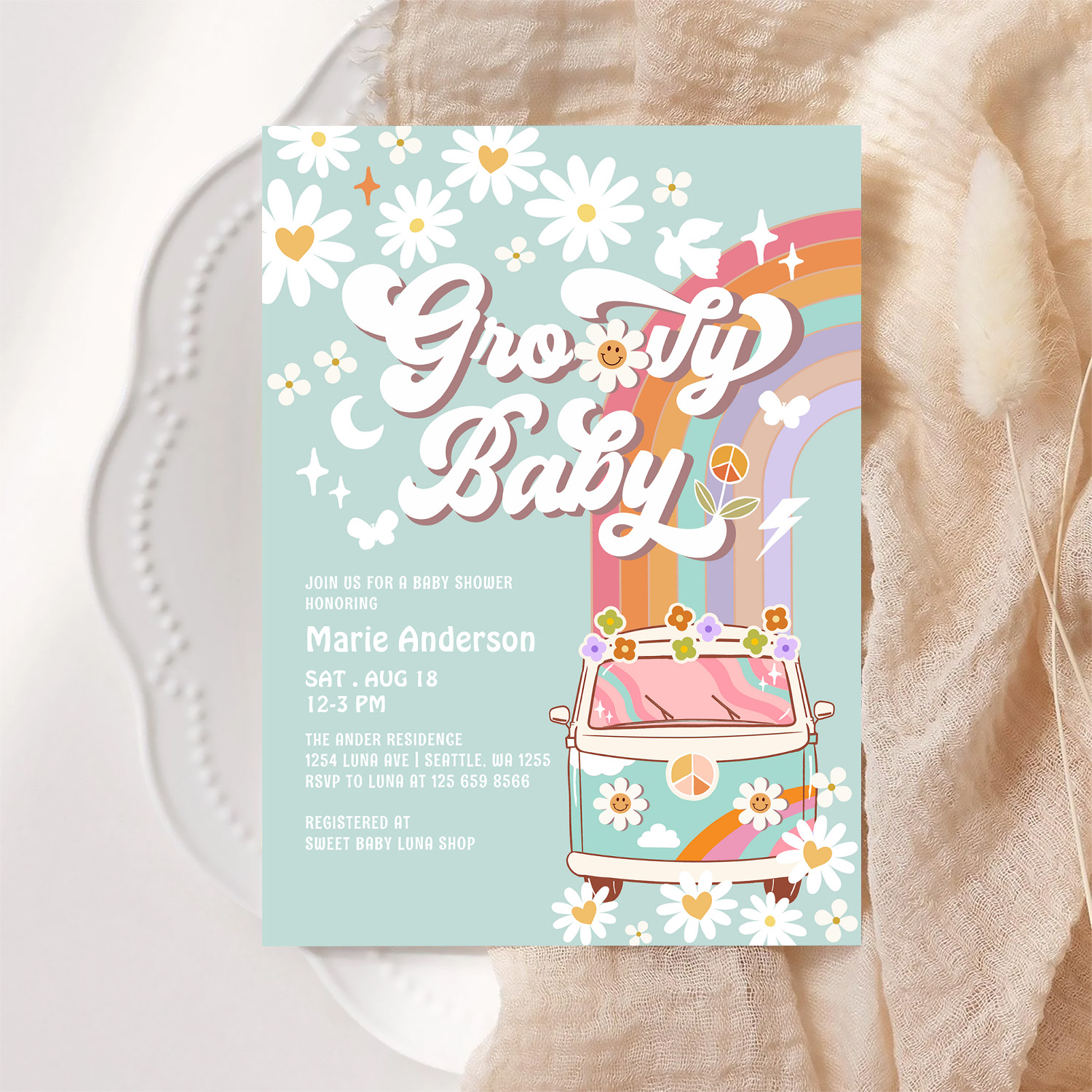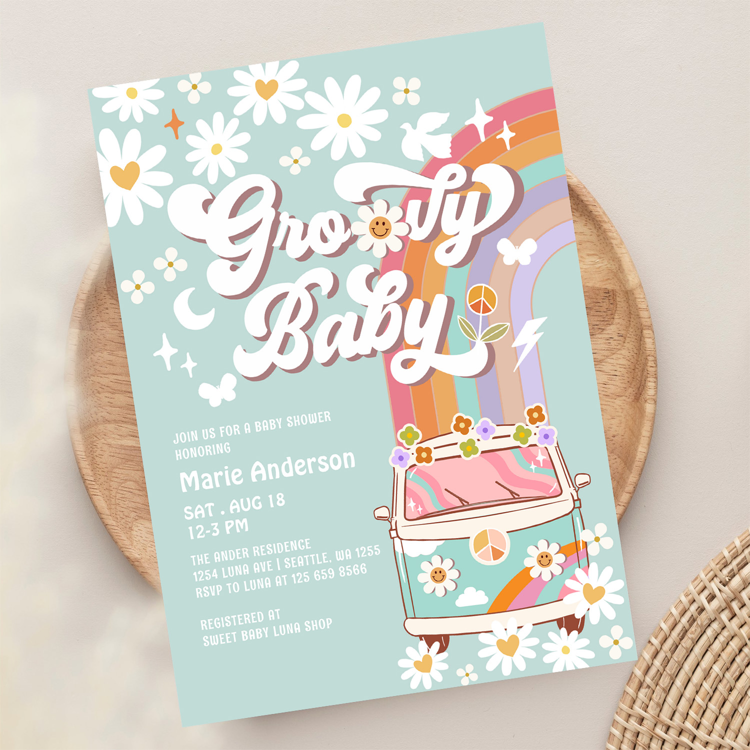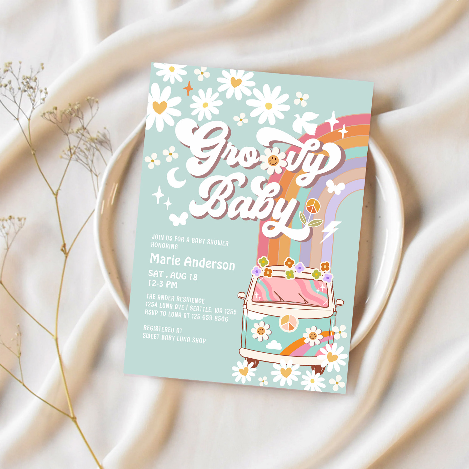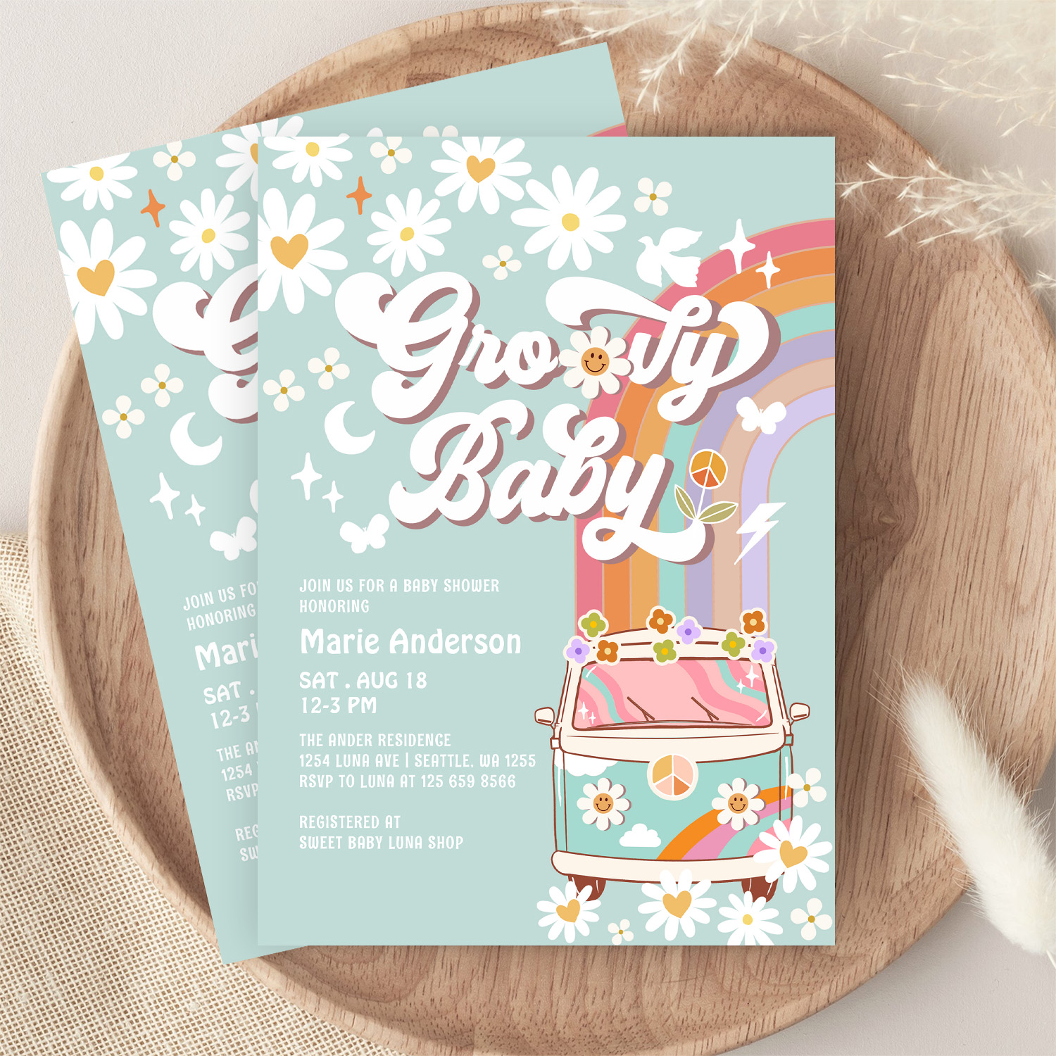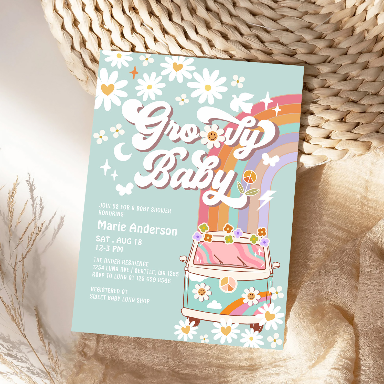 Mint Groovy Daisy Rainbow Hippie 70S Baby Shower Invitation