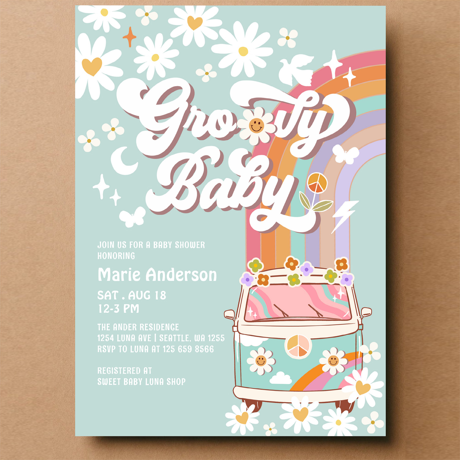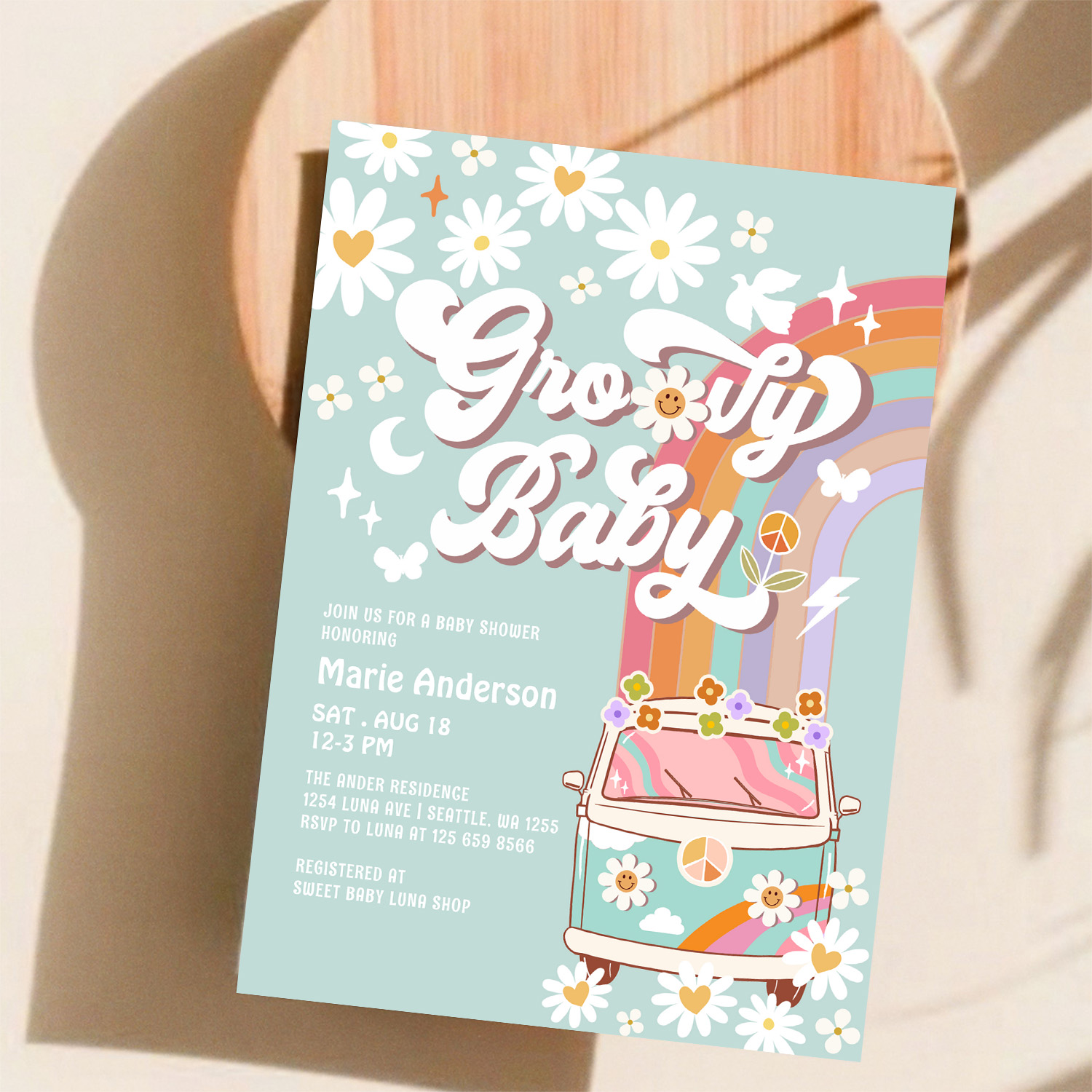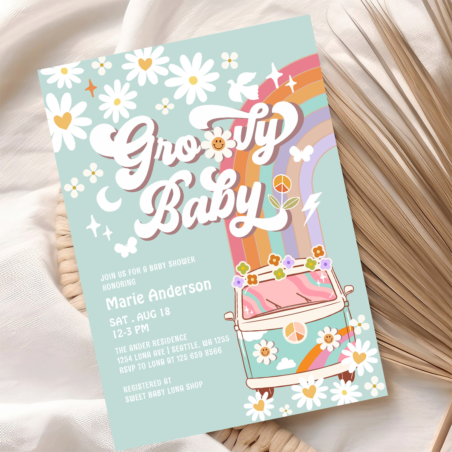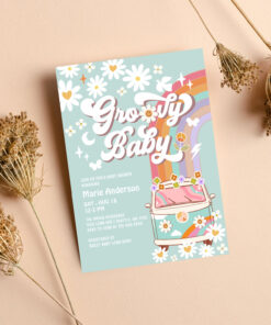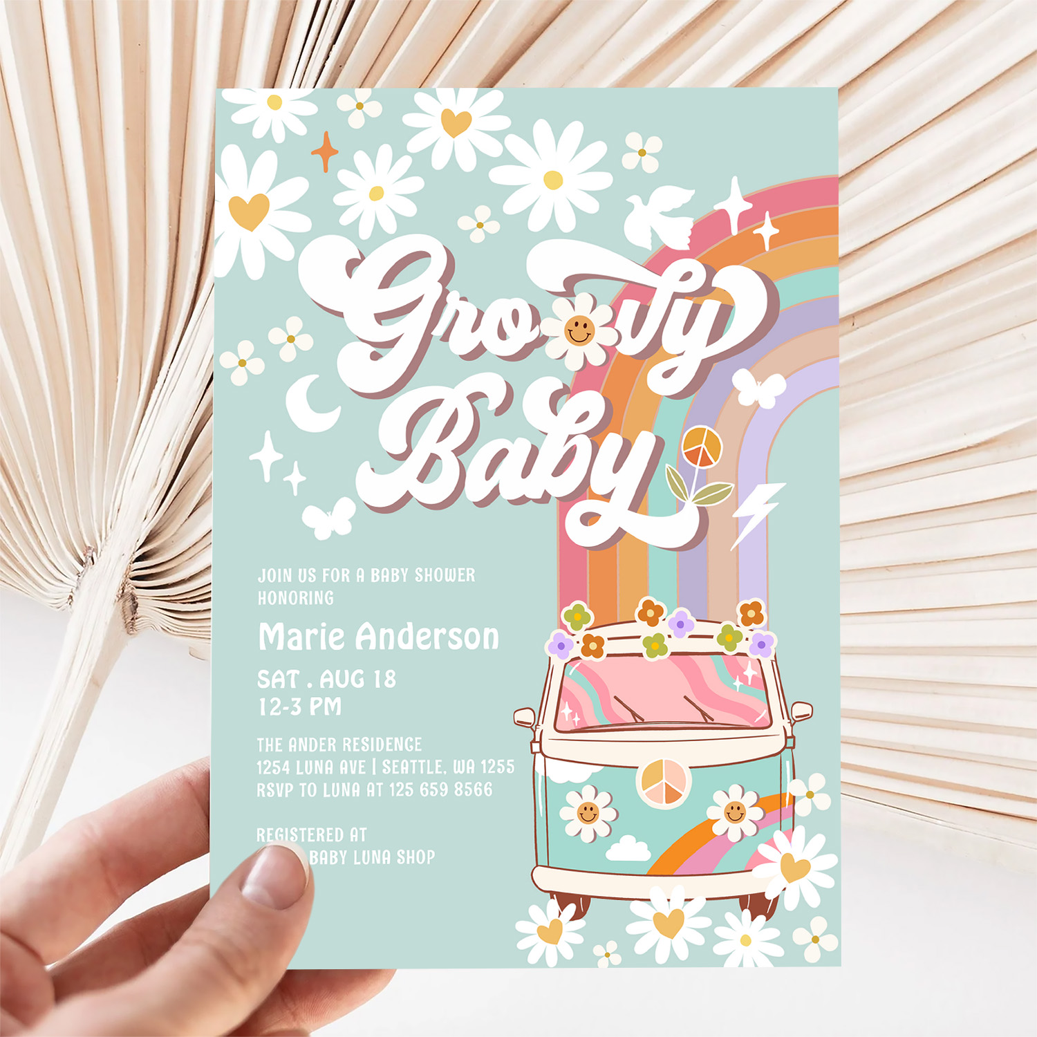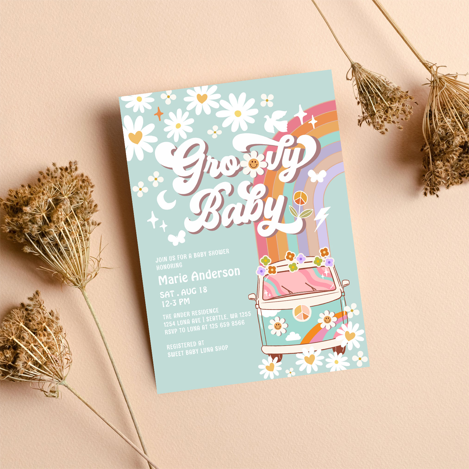 Mint Groovy Daisy Rainbow Hippie 70S Baby Shower Invitation