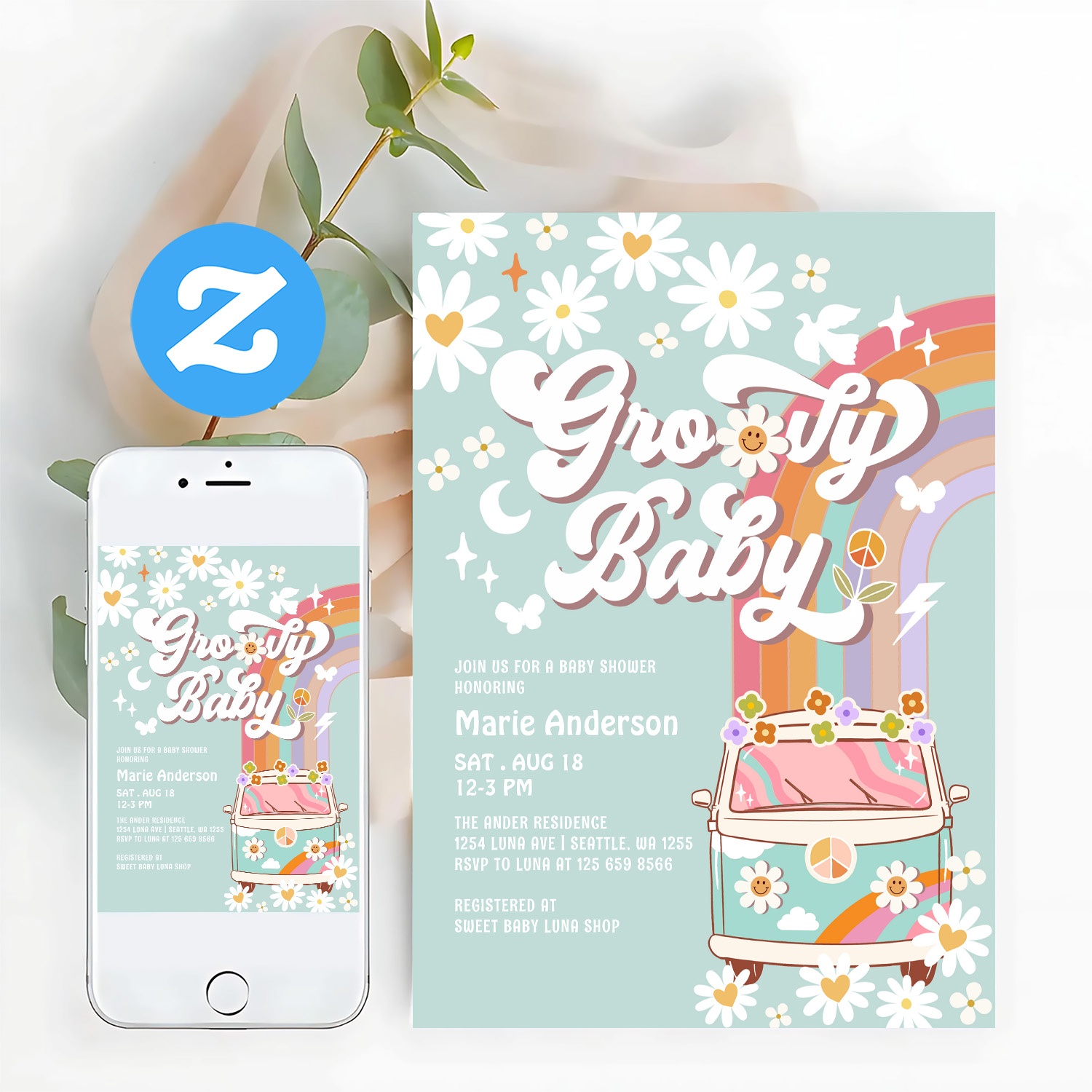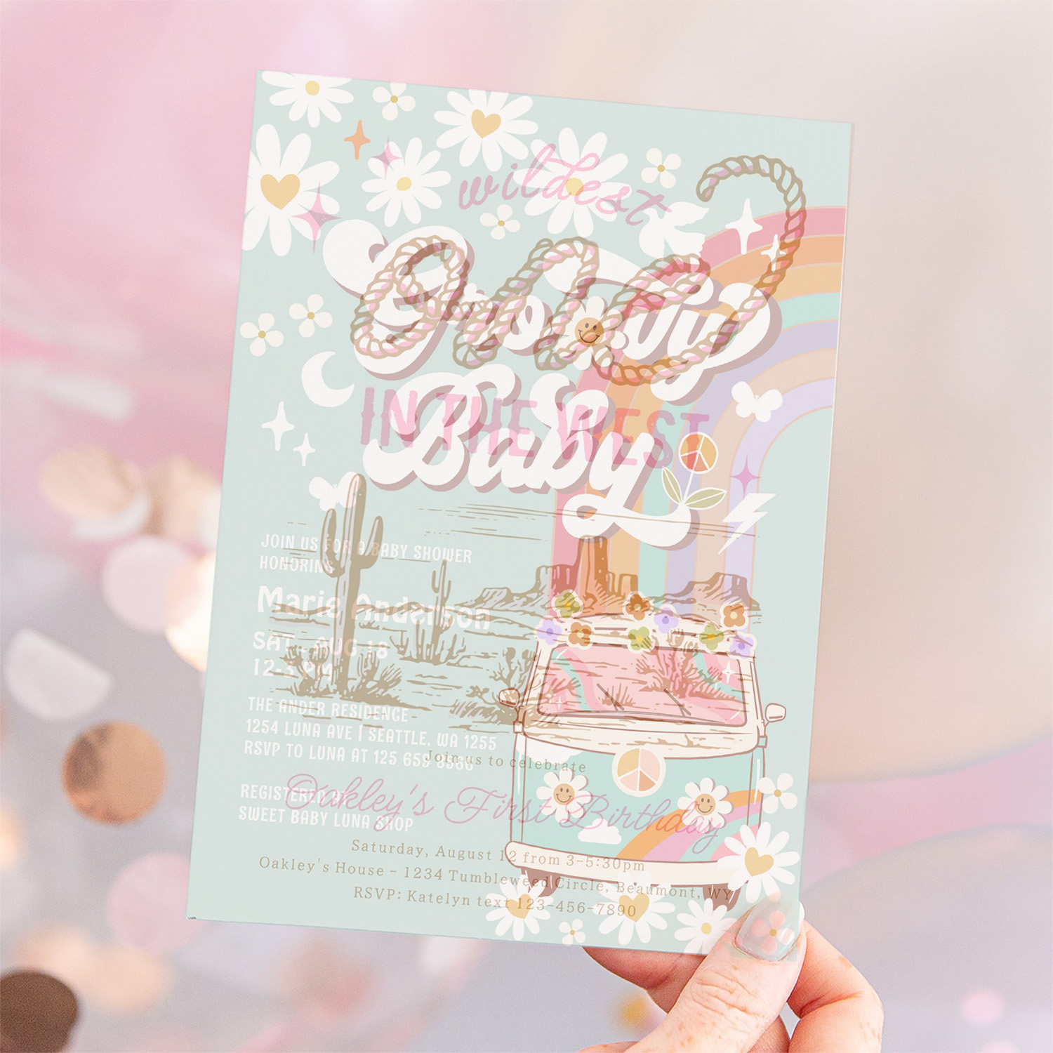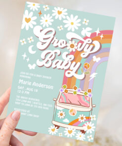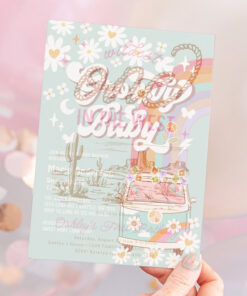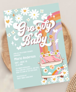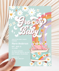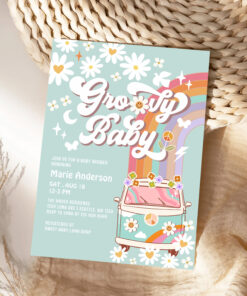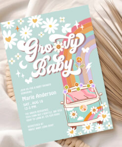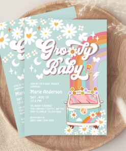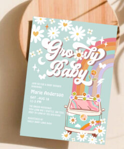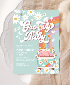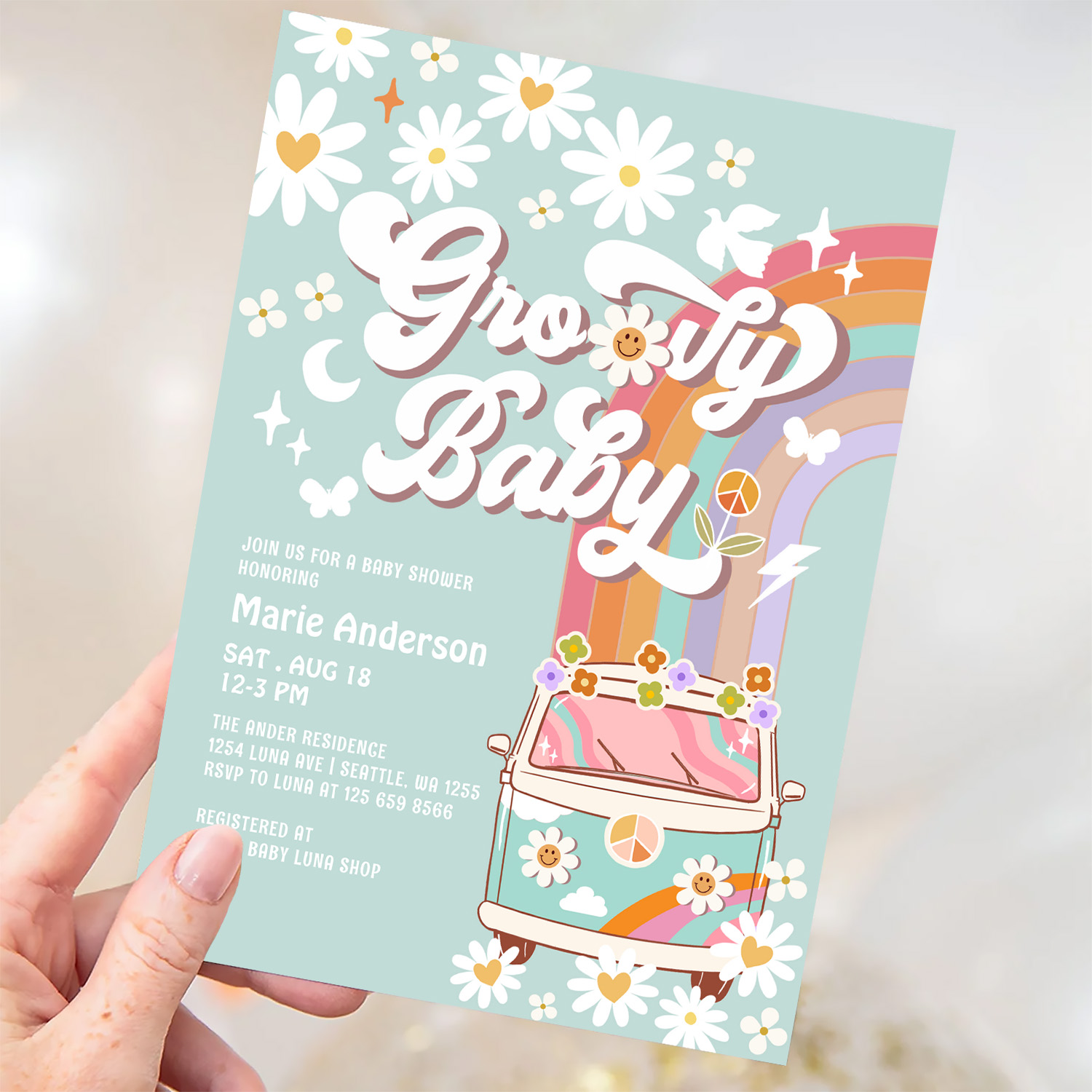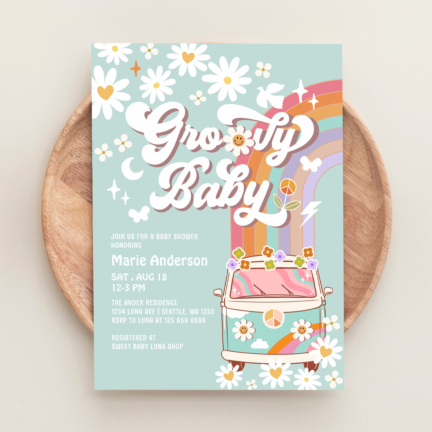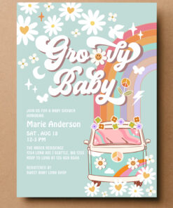 Mint Groovy Daisy Rainbow Hippie 70S Baby Shower Invitation