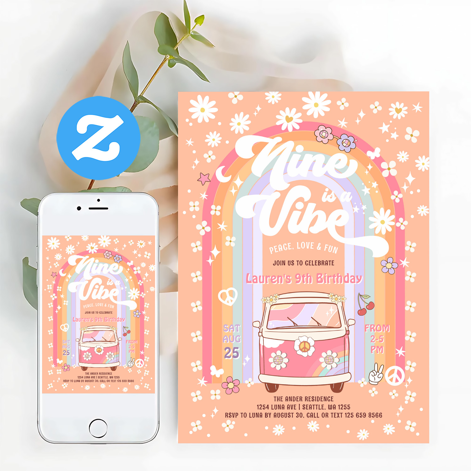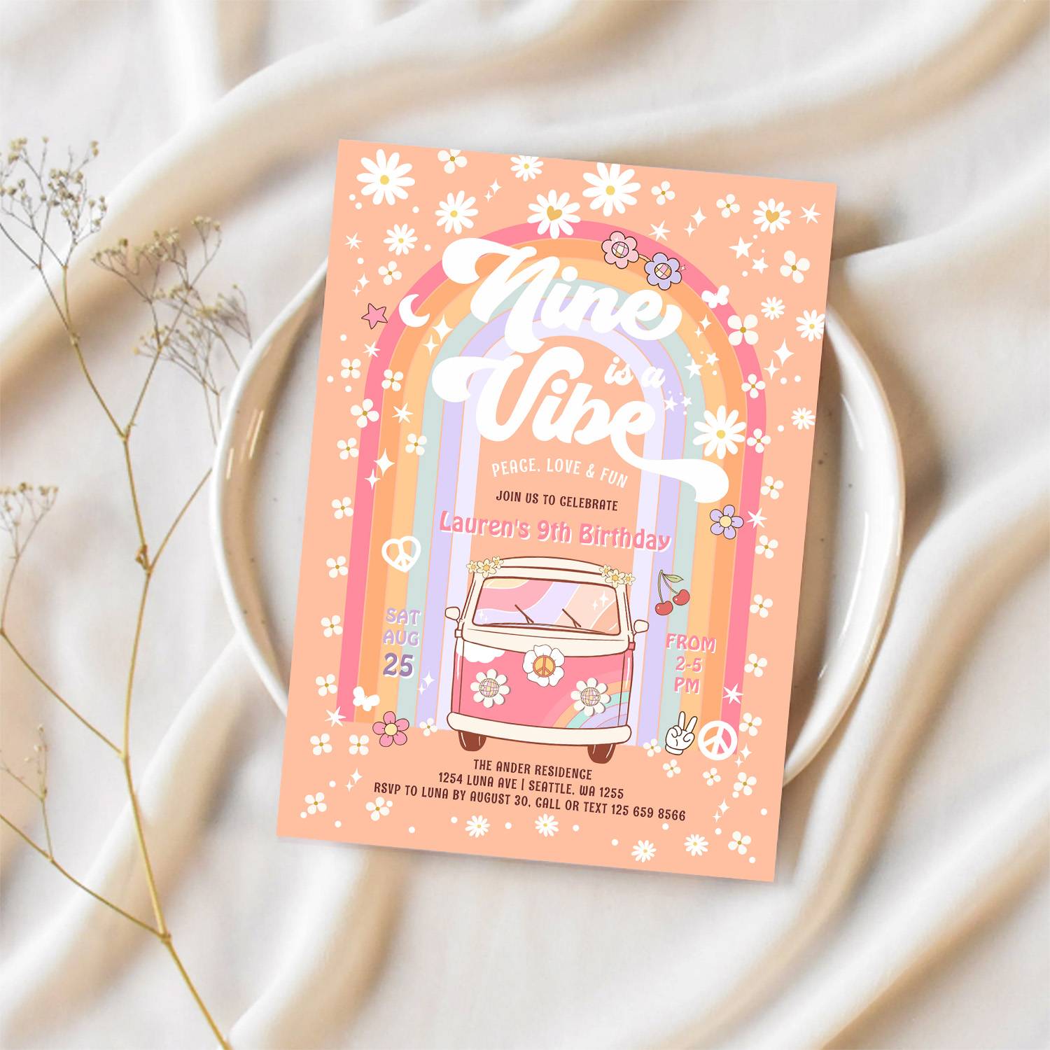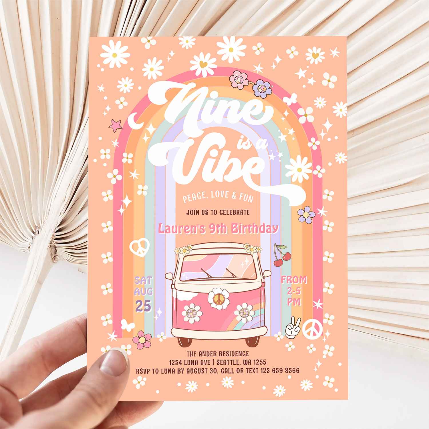 Nine Is A Vibe Daisy Groovy Van 9th Birthday Invitation - Related products