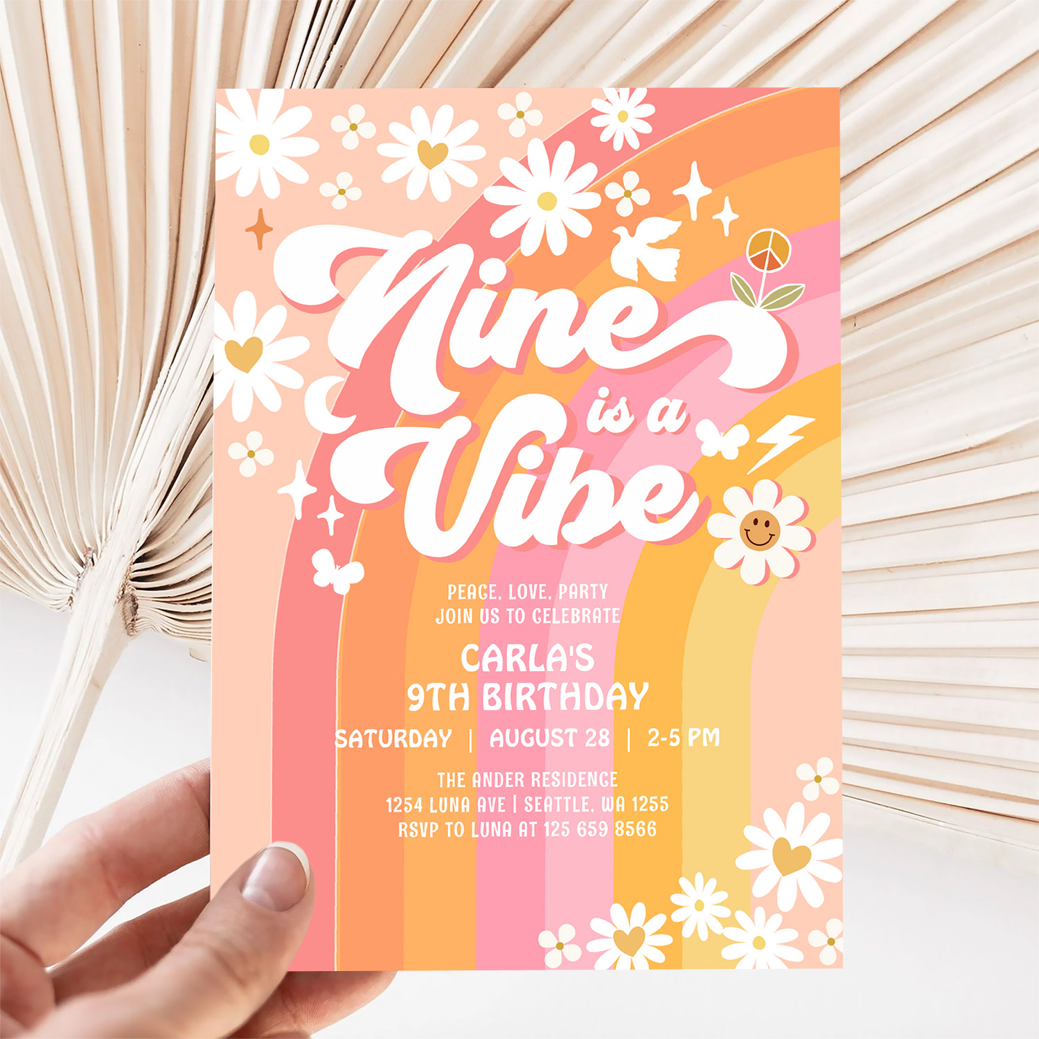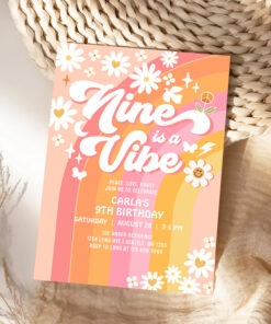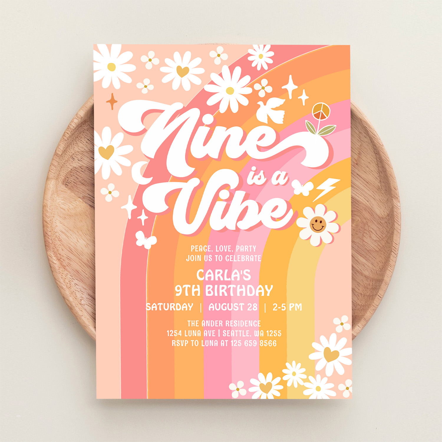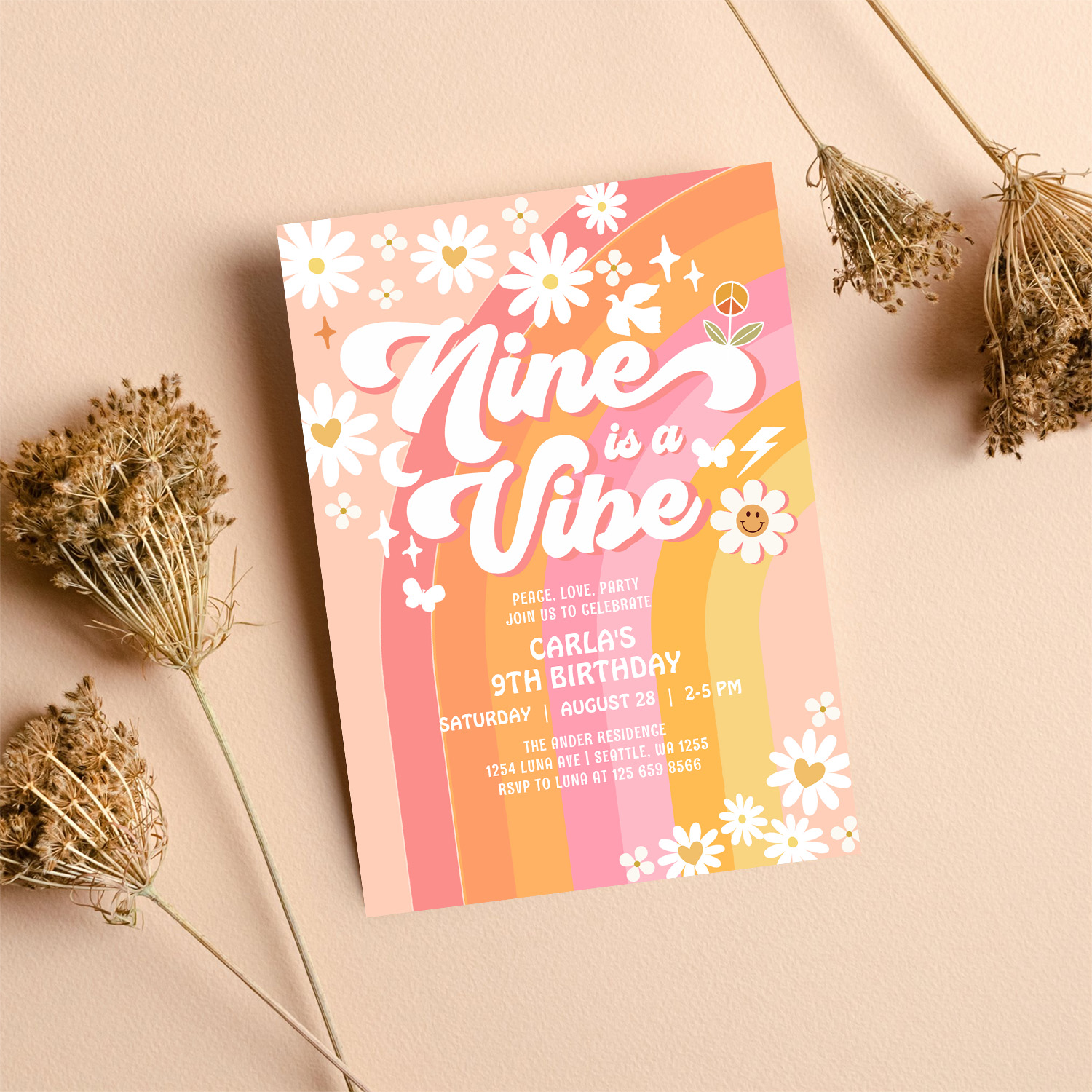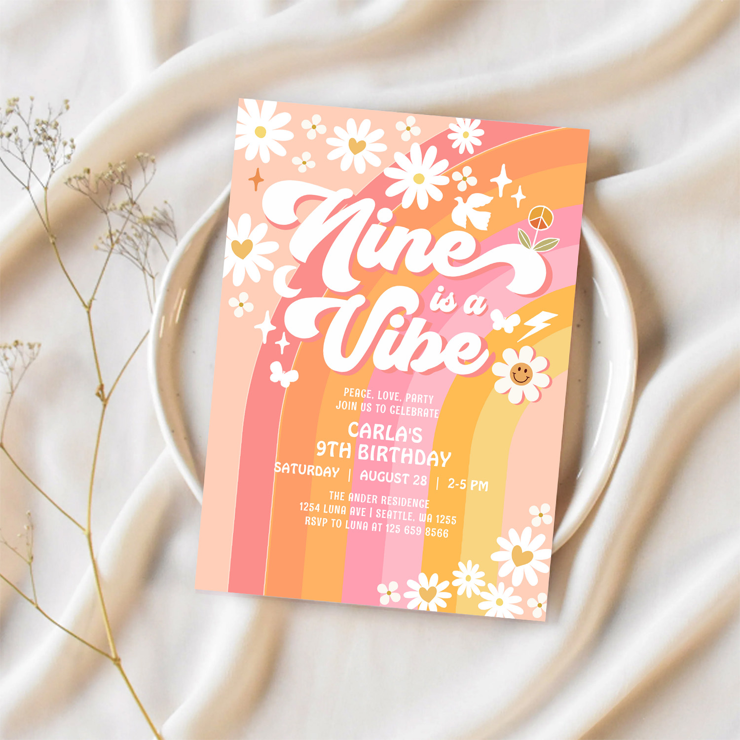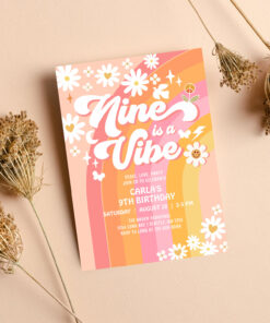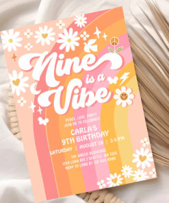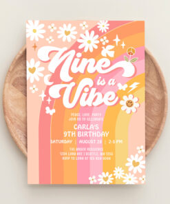 Nine Is A Vibe Pink Peach 9th Groovy Birthday Invitation