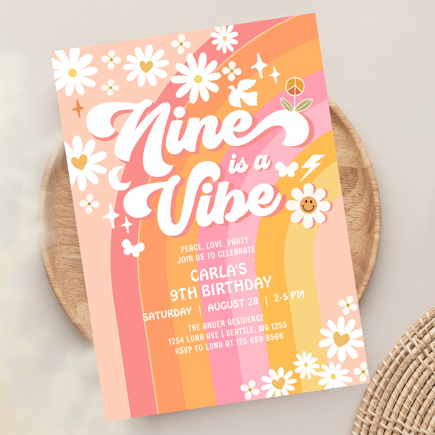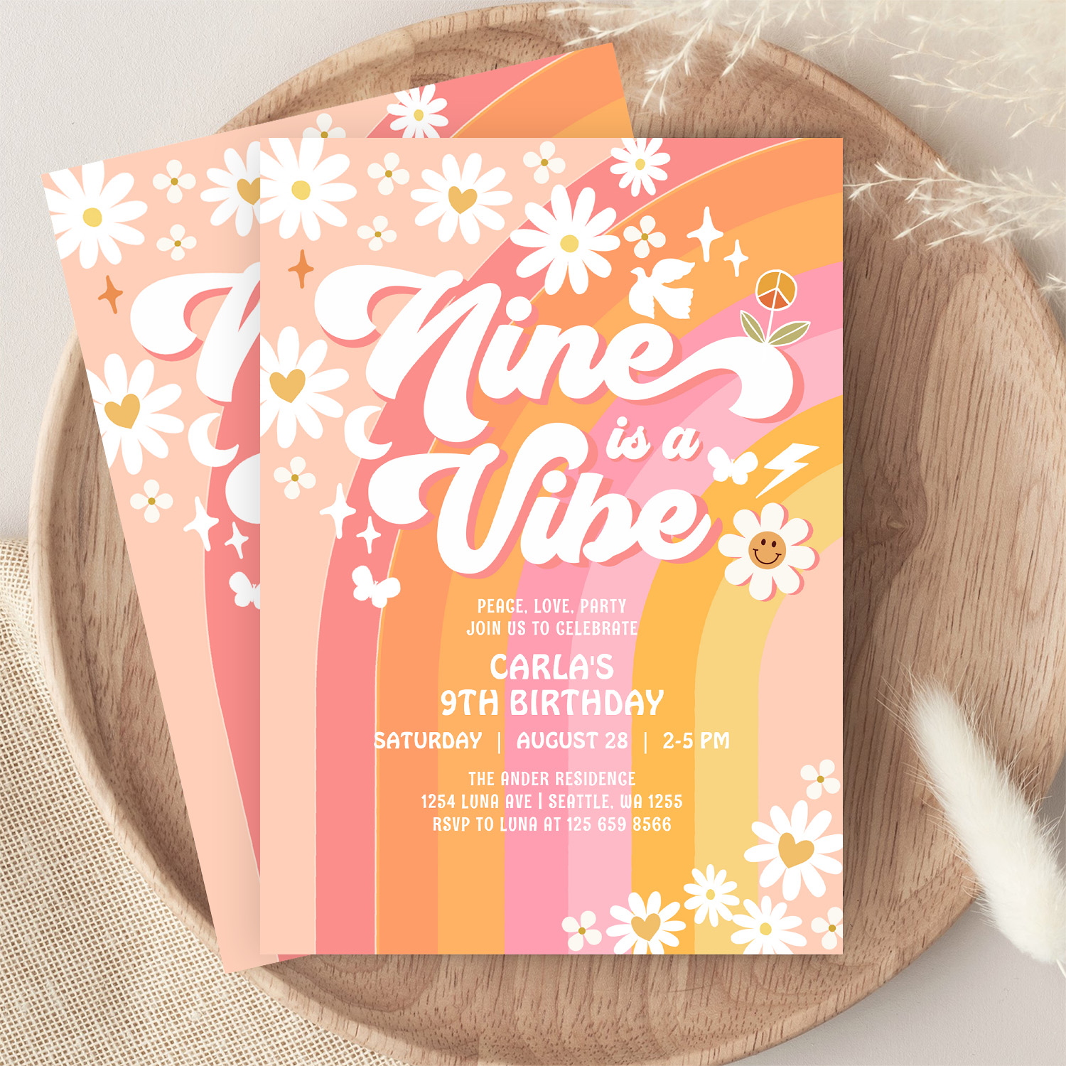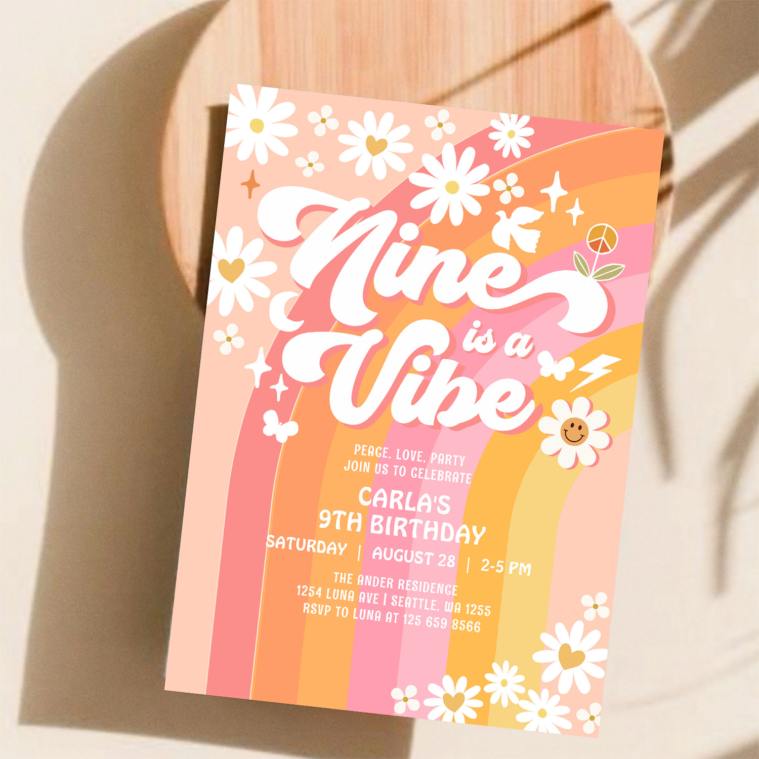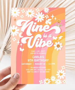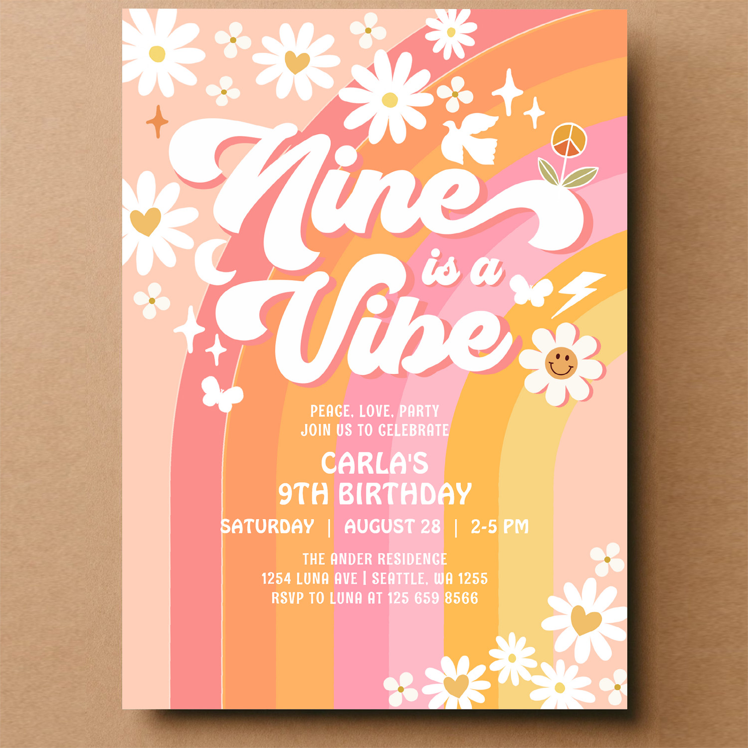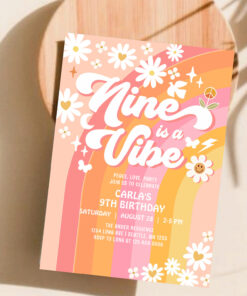 Nine Is A Vibe Pink Peach 9th Groovy Birthday Invitation