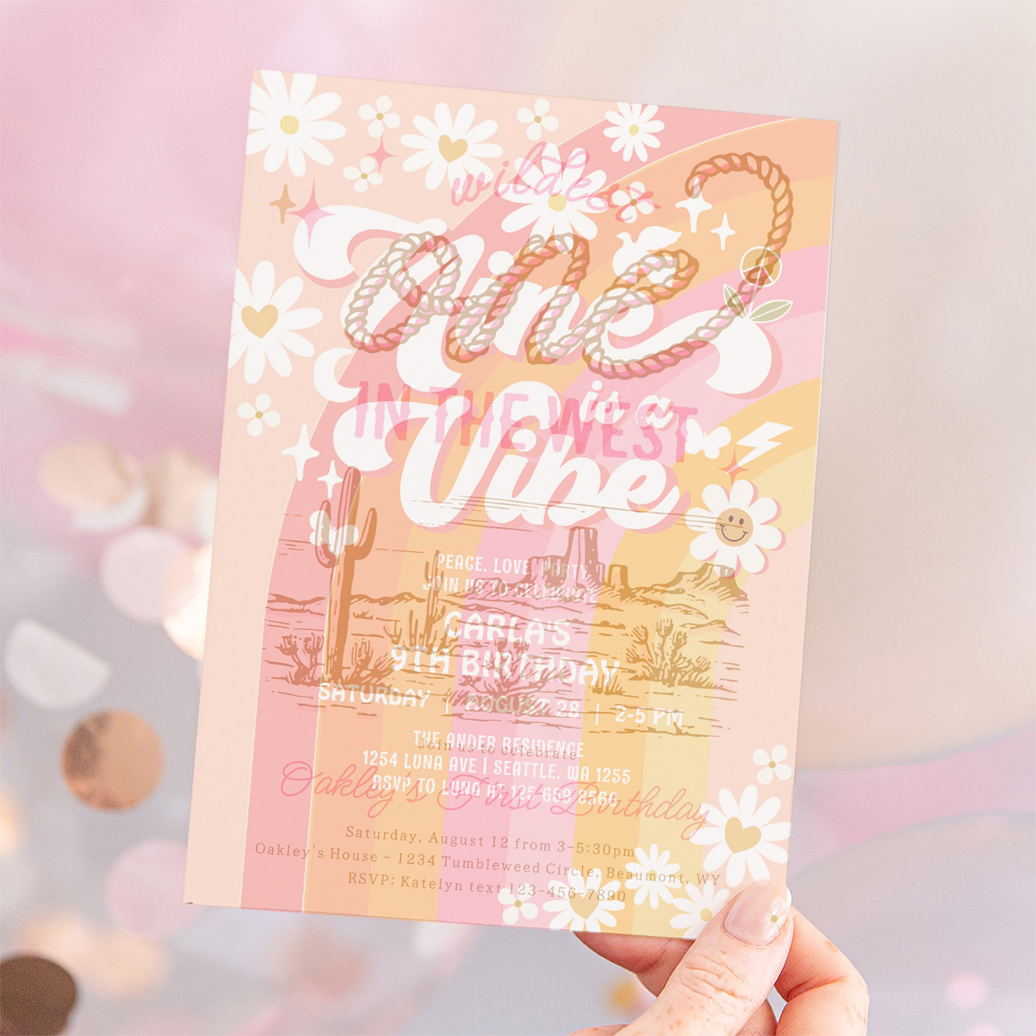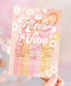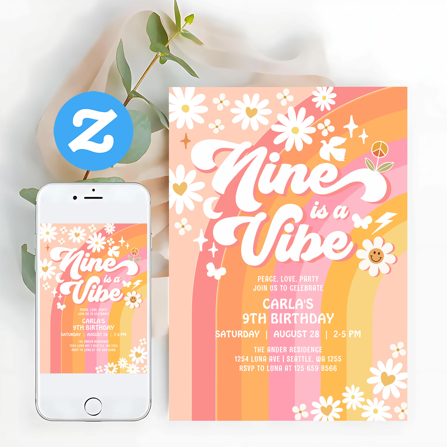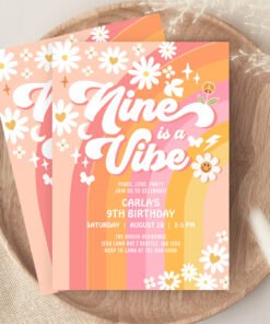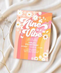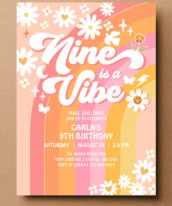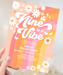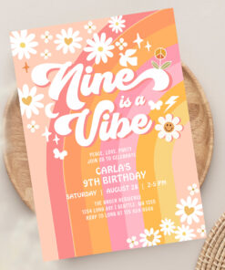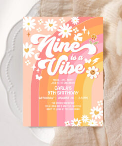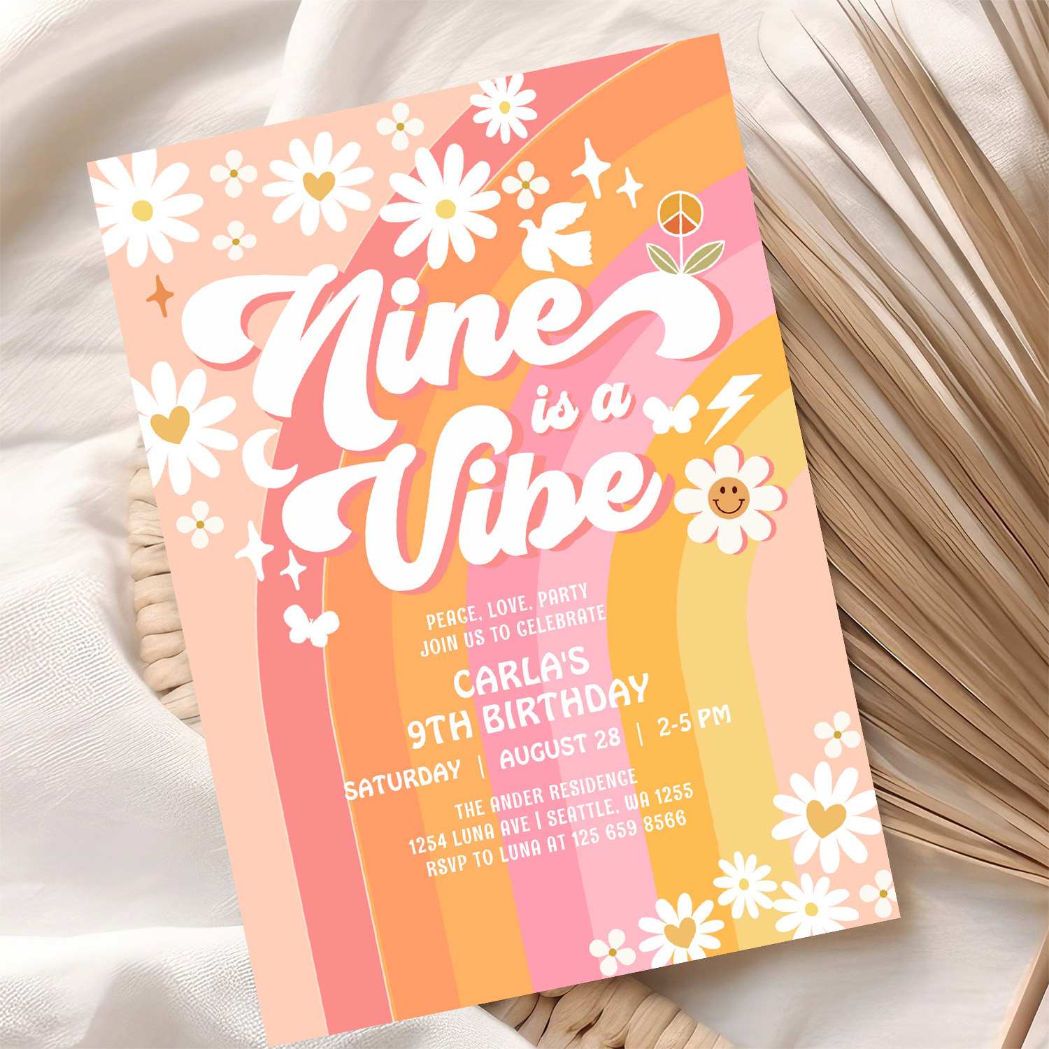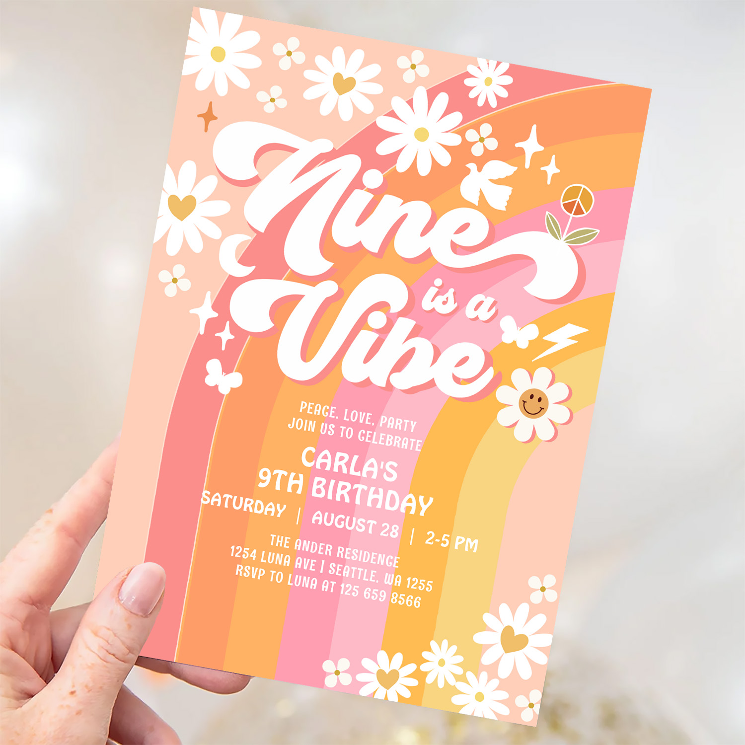 Nine Is A Vibe Pink Peach 9th Groovy Birthday Invitation