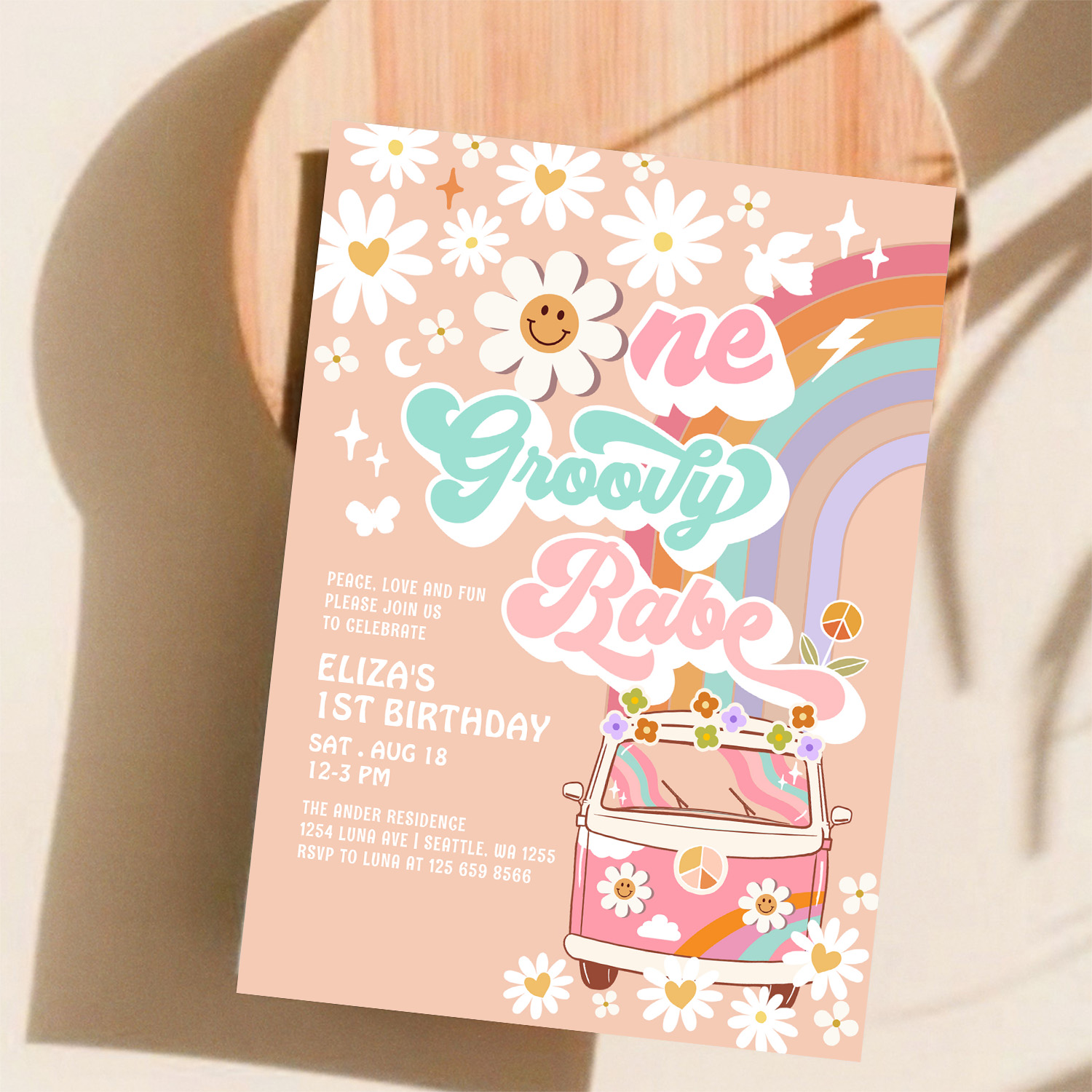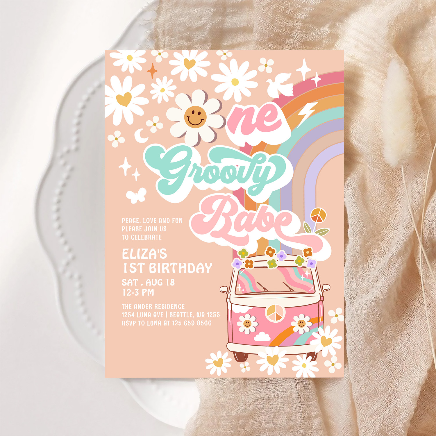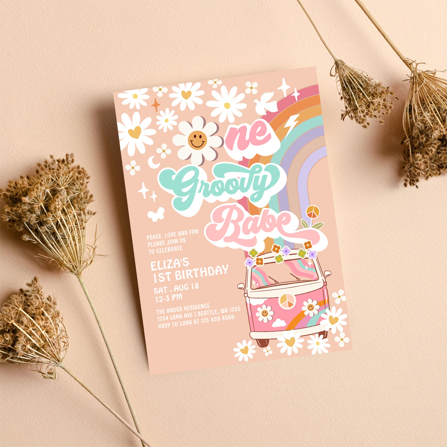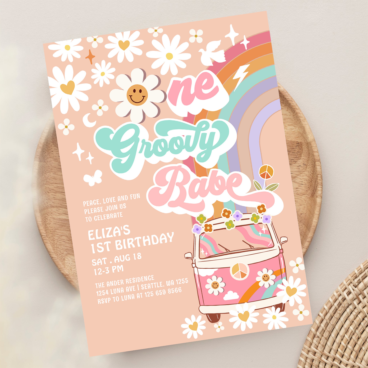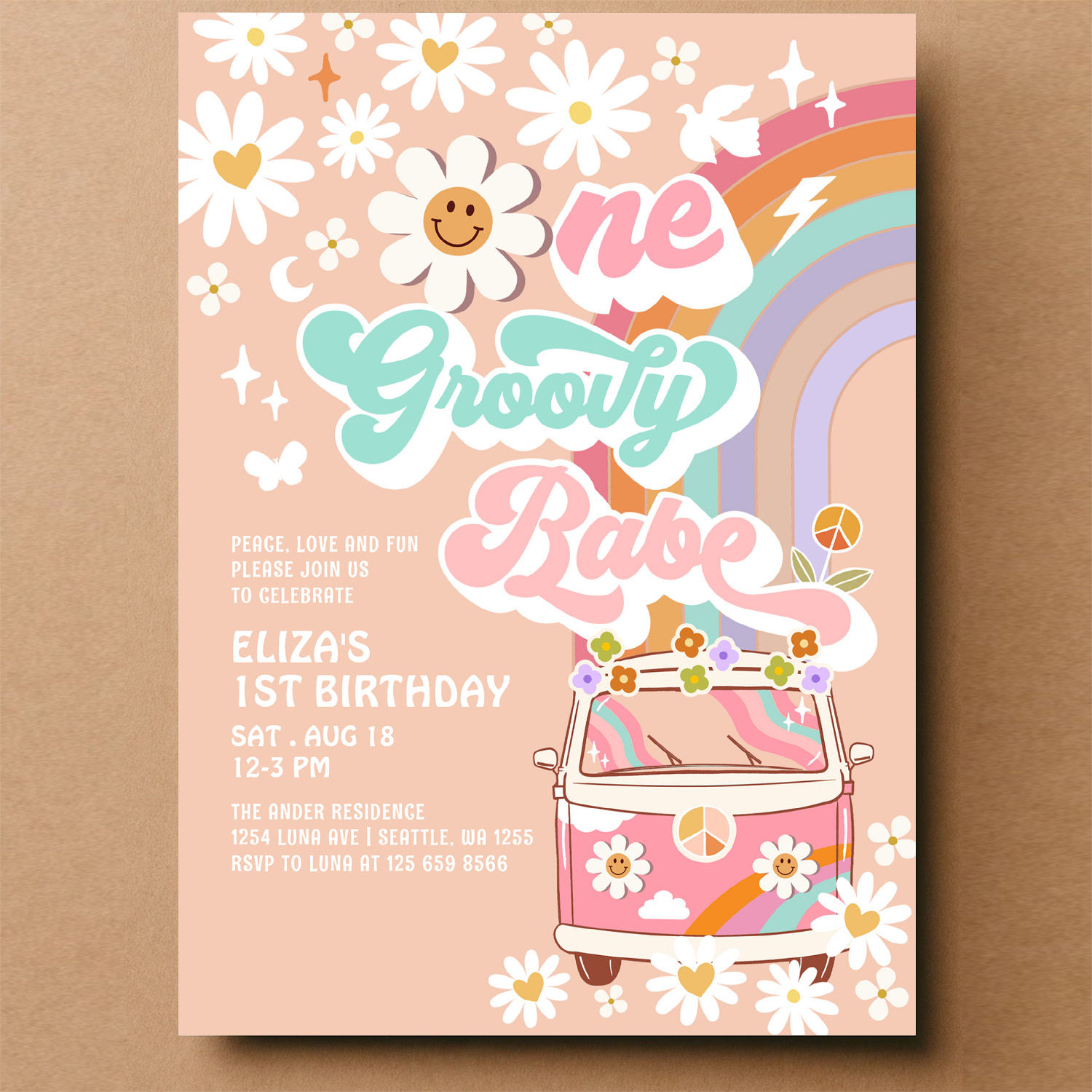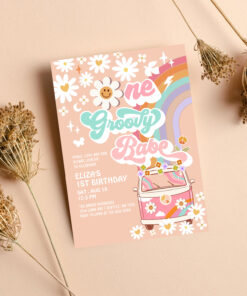 One Groovy Babe Pink Daisy Rainbow 1st Birthday Invitation - Related products