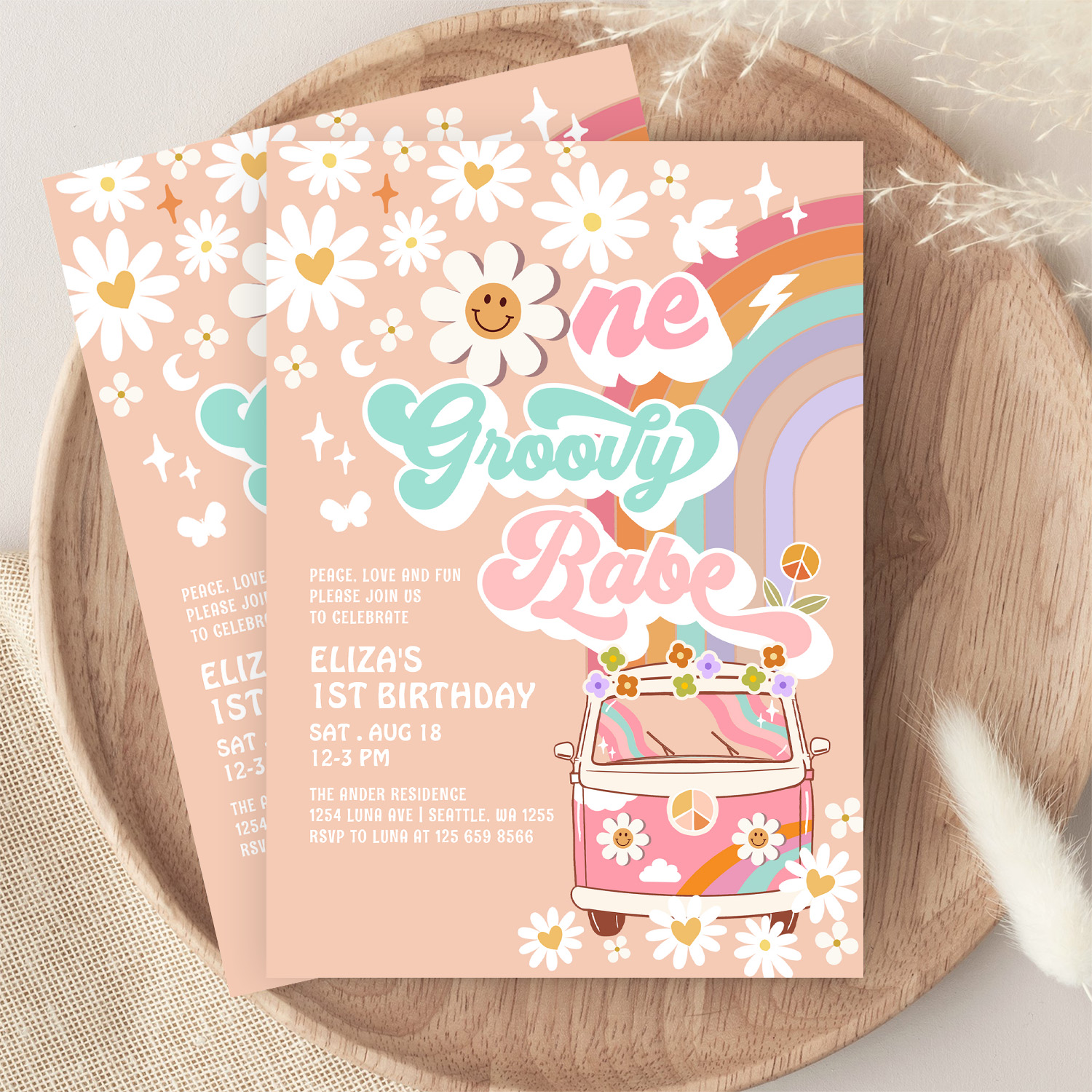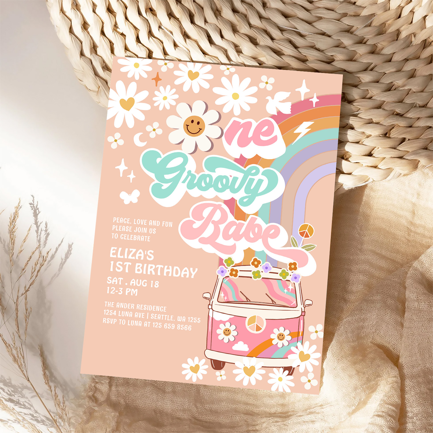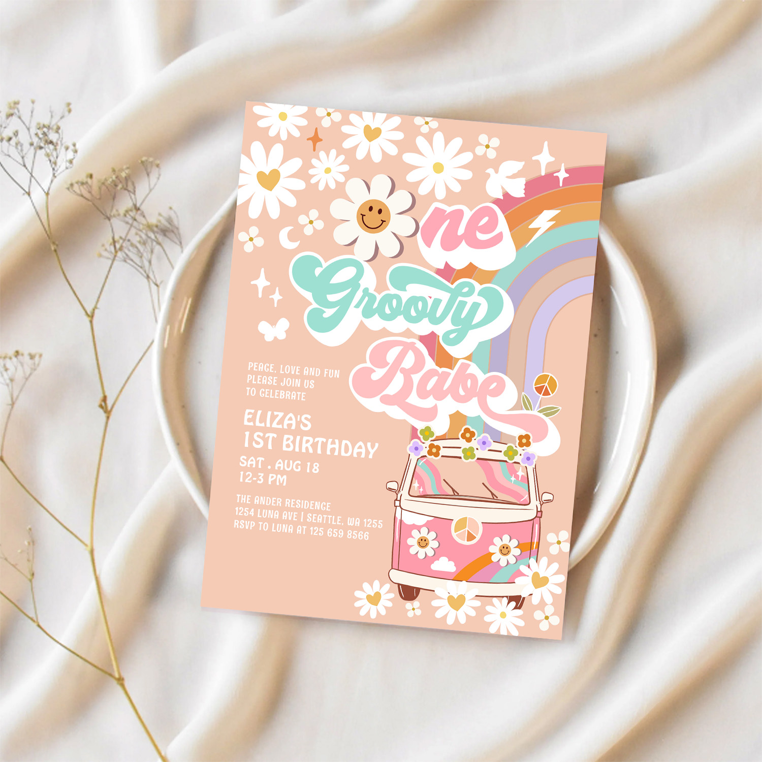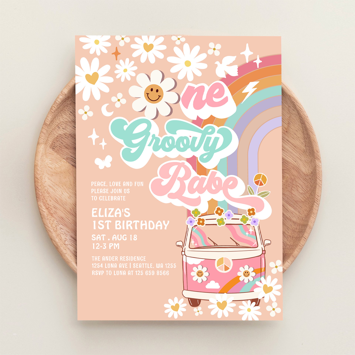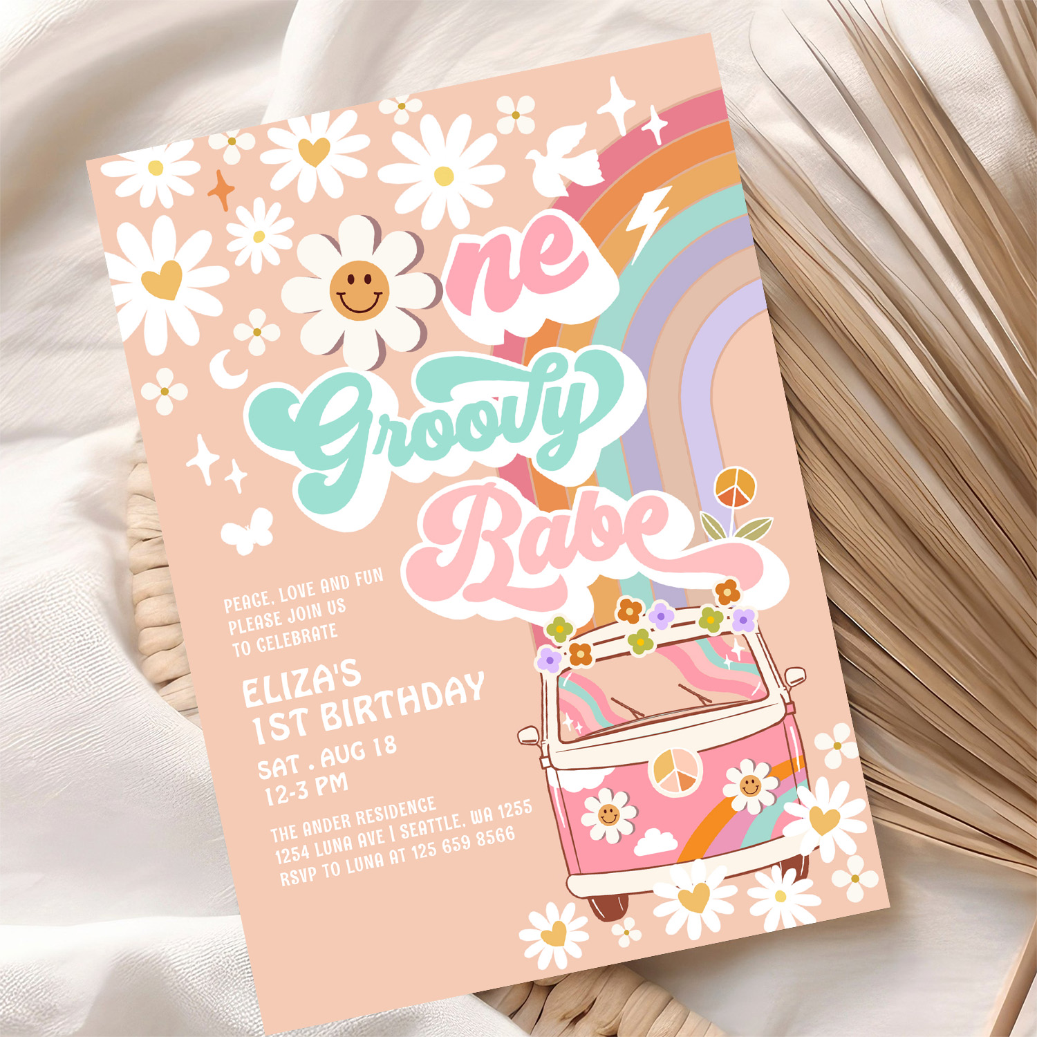One Groovy Babe Pink Daisy Rainbow 1st Birthday Invitation - Related products