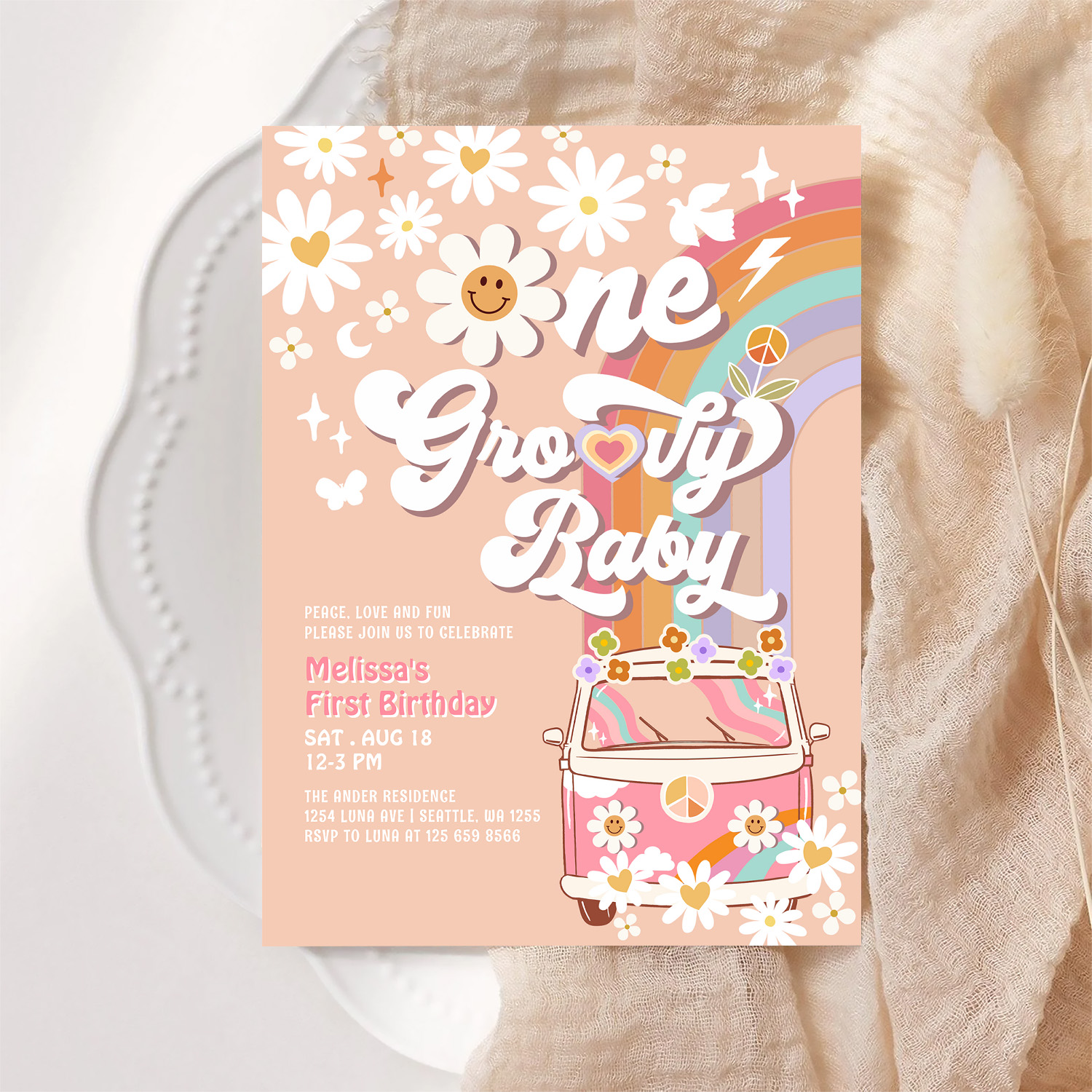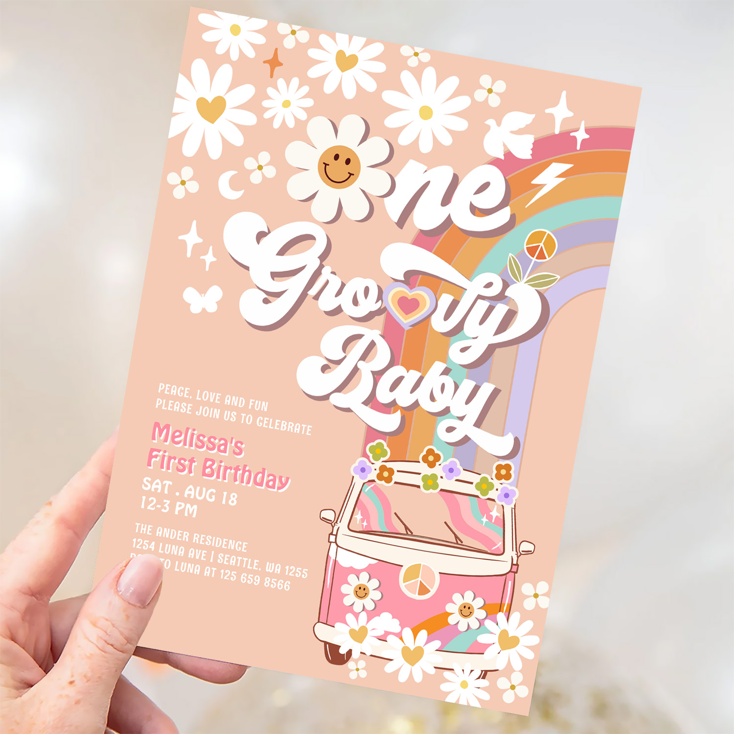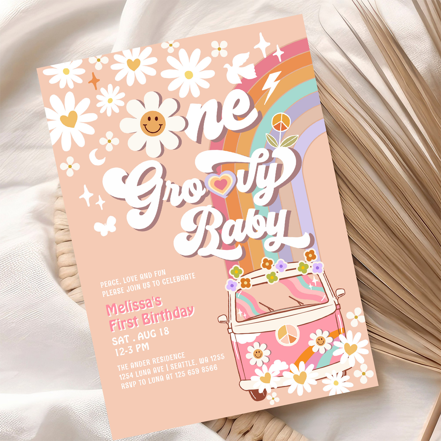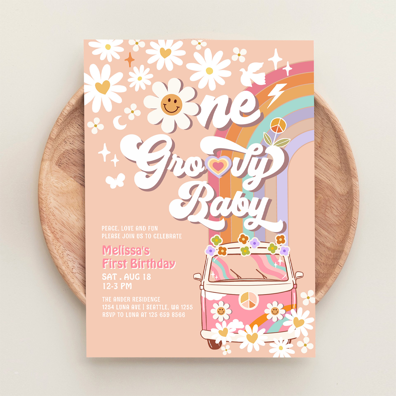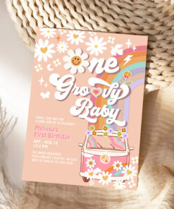One Groovy Baby Daisy Rainbow 1st Birthday Invitation