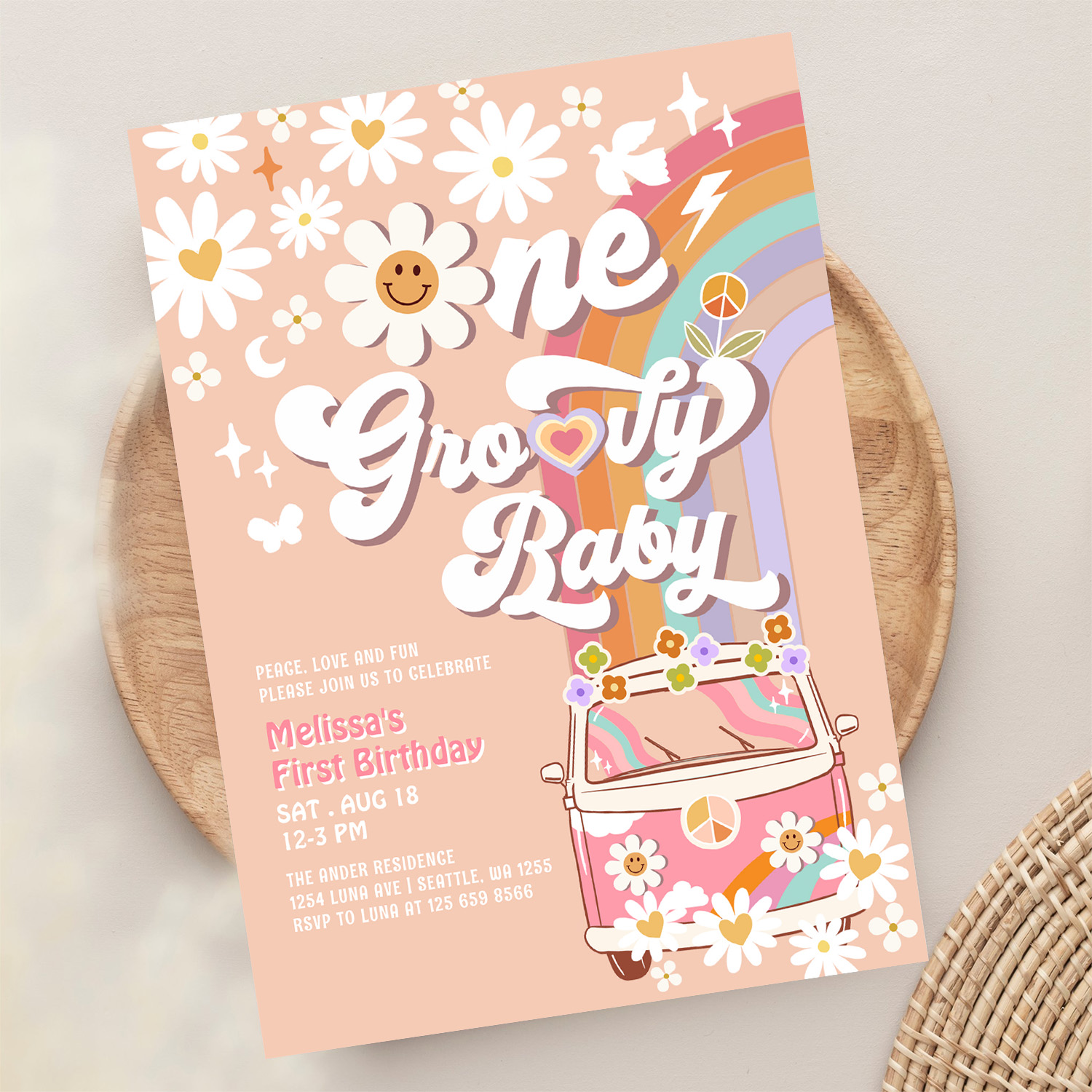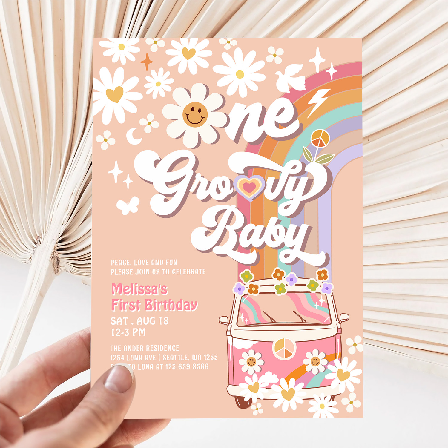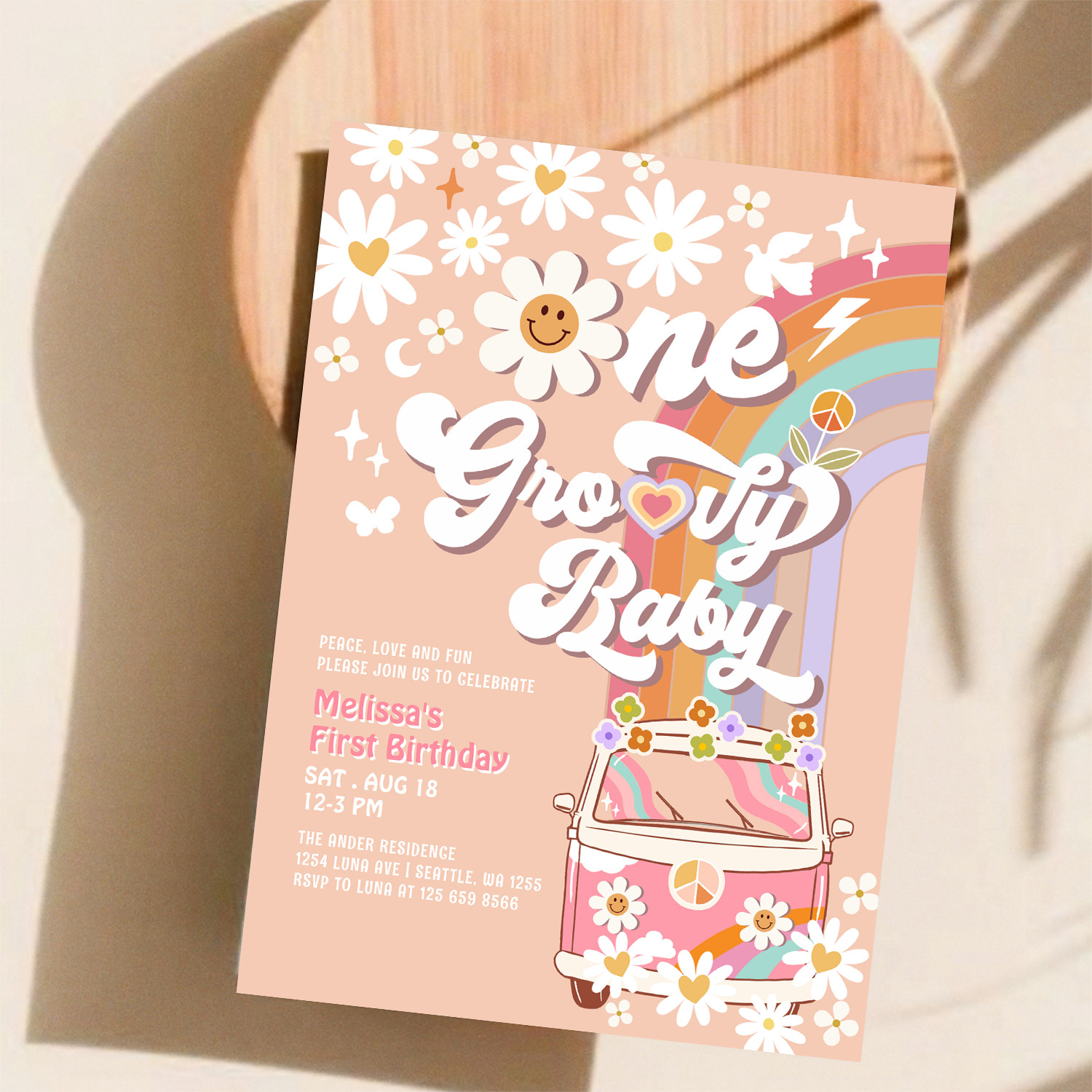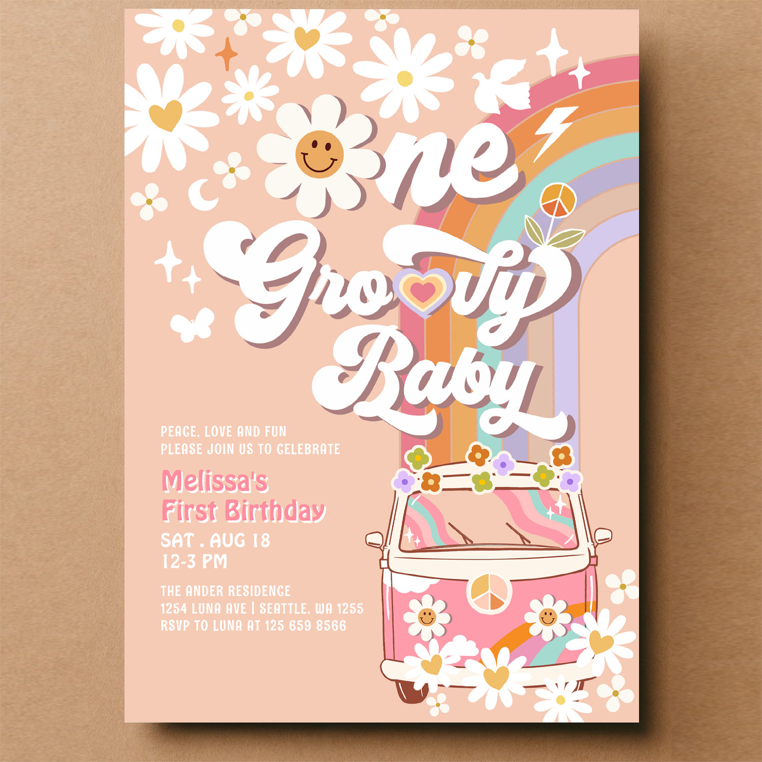 One Groovy Baby Daisy Rainbow 1st Birthday Invitation