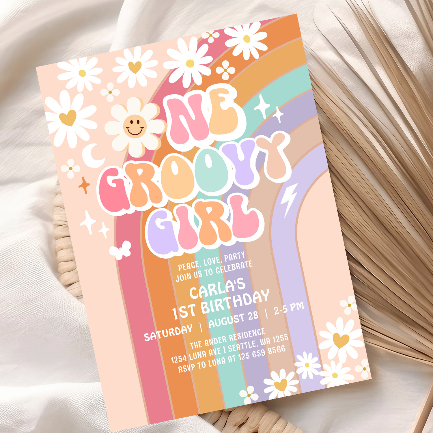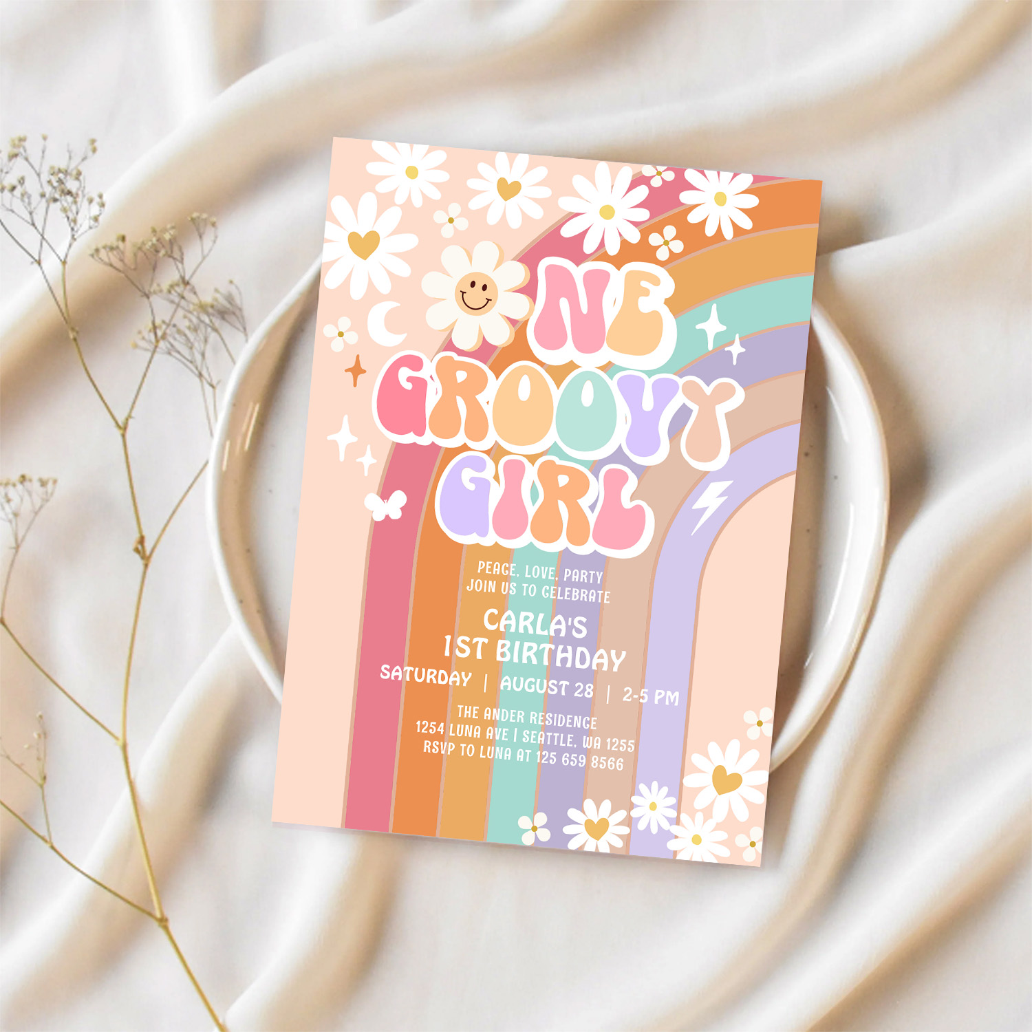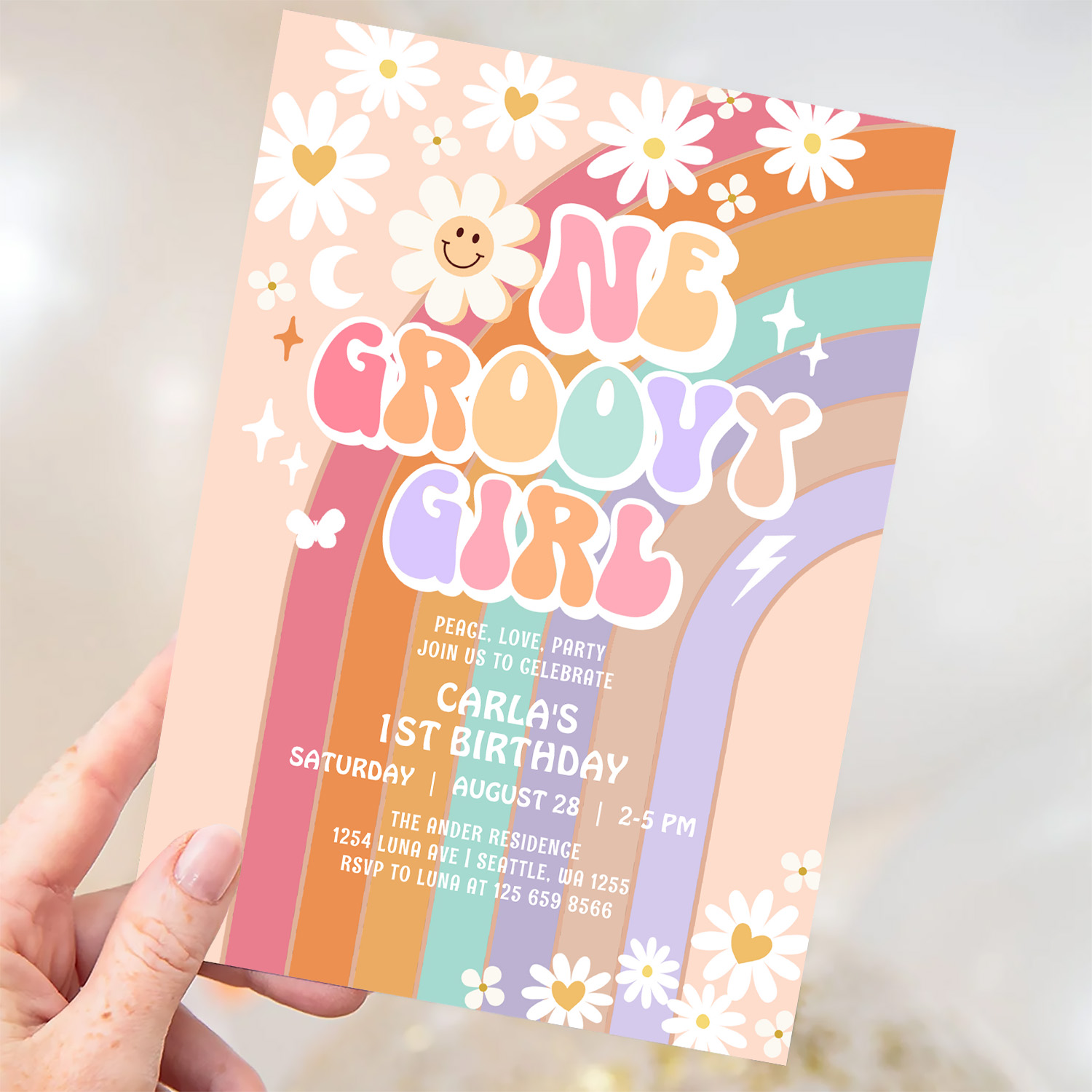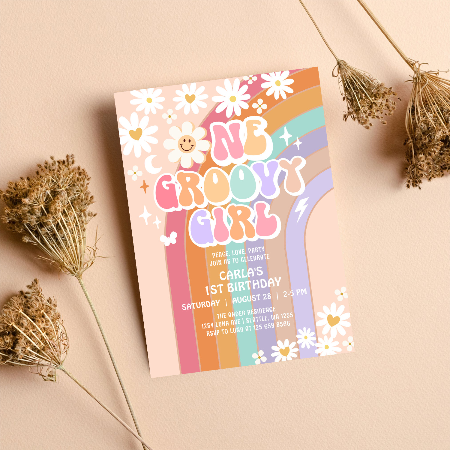 One Groovy Girl Hippie Rainbow Retro 1st Birthday Invitation