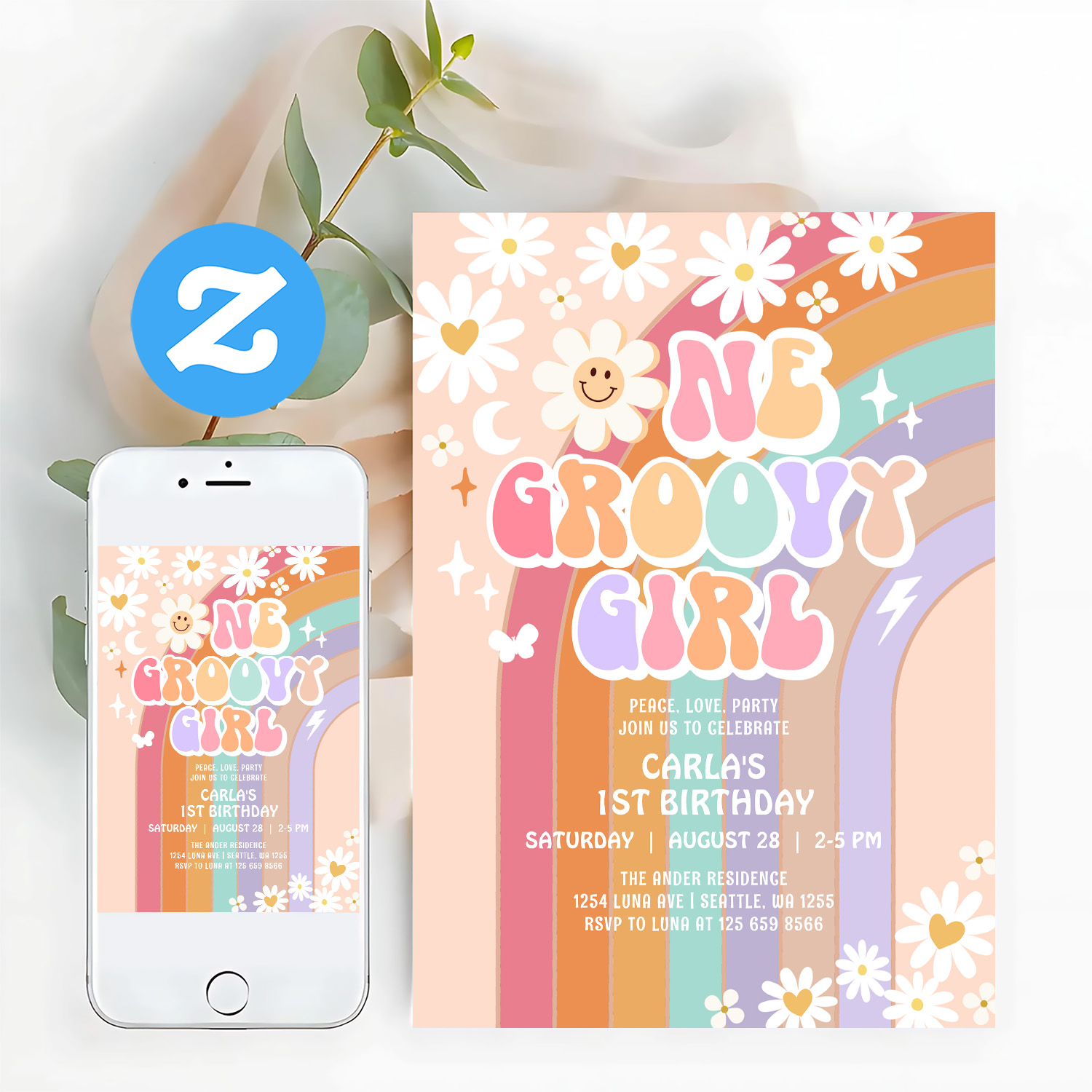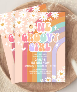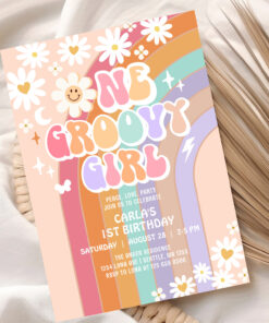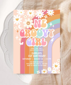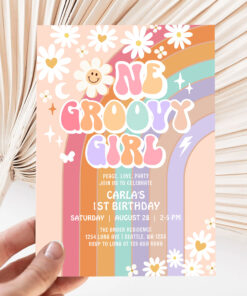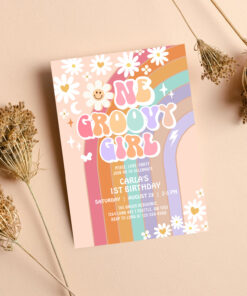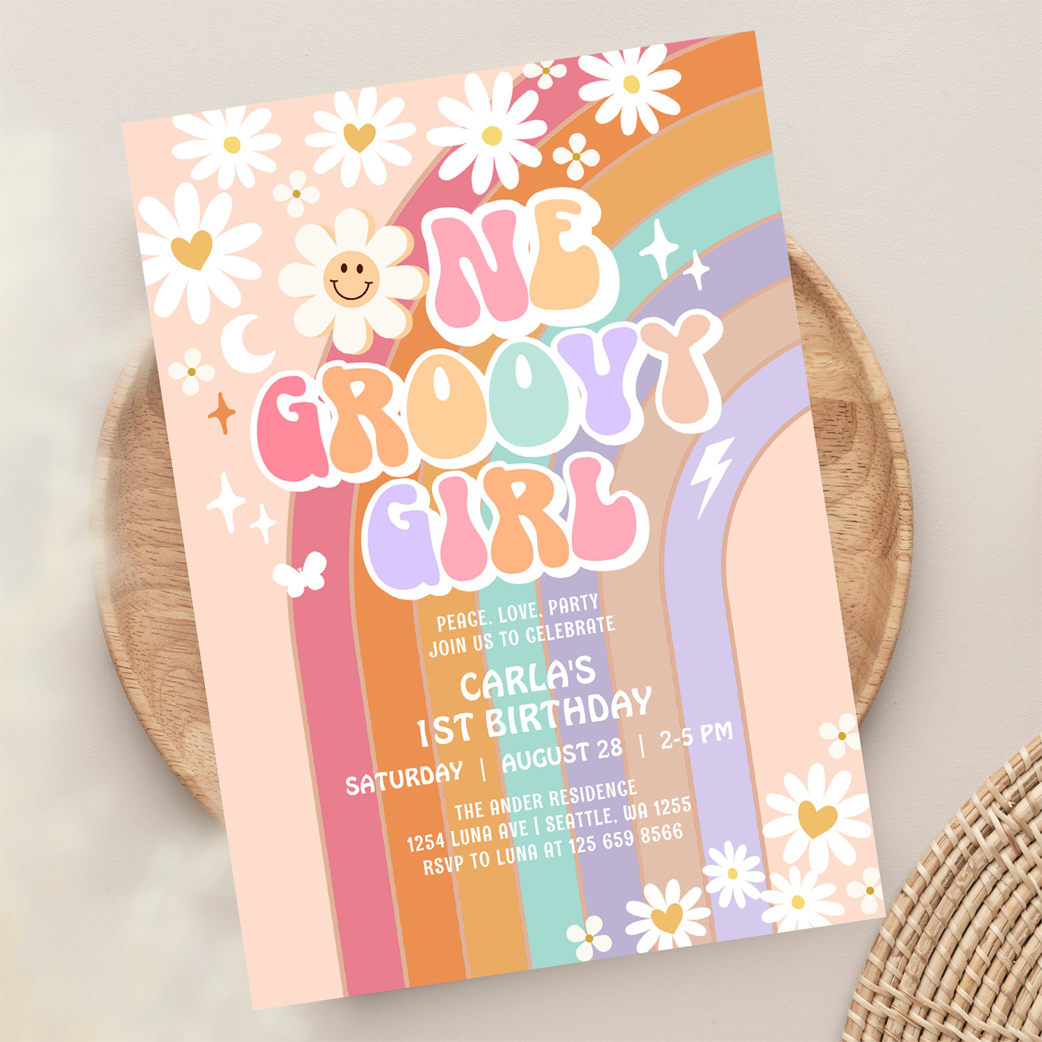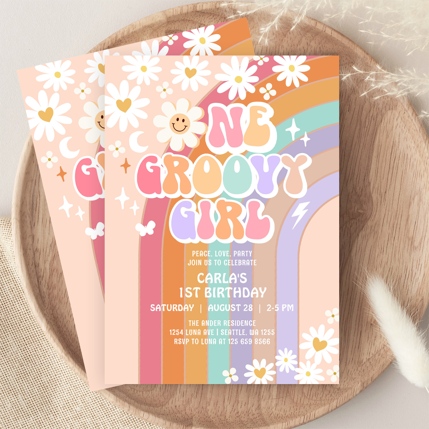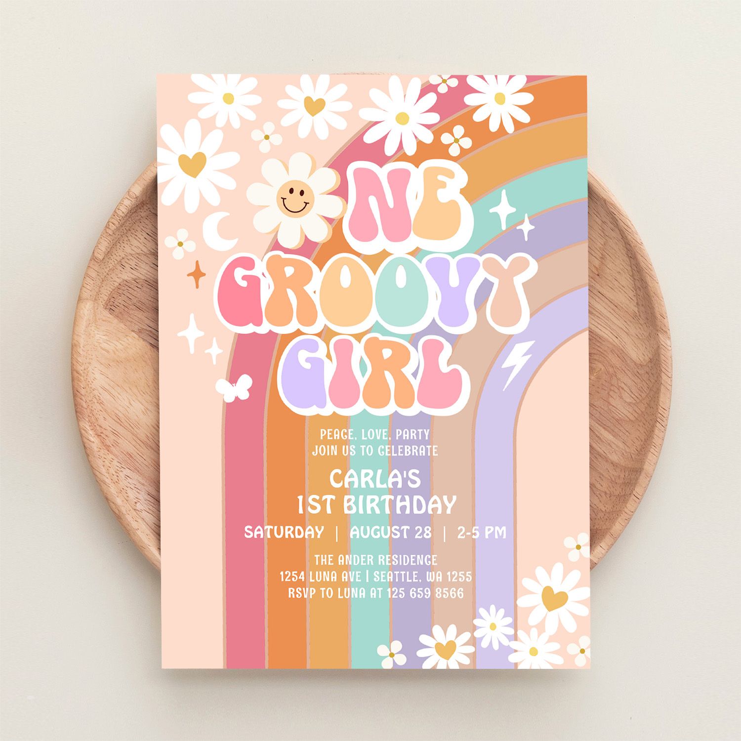 One Groovy Girl Hippie Rainbow Retro 1st Birthday Invitation