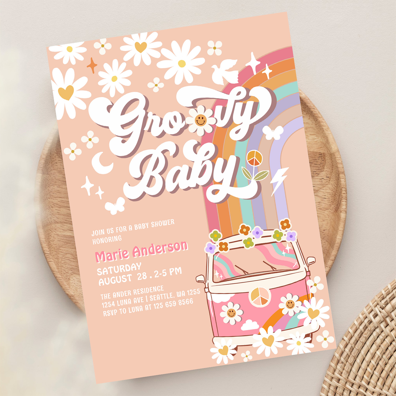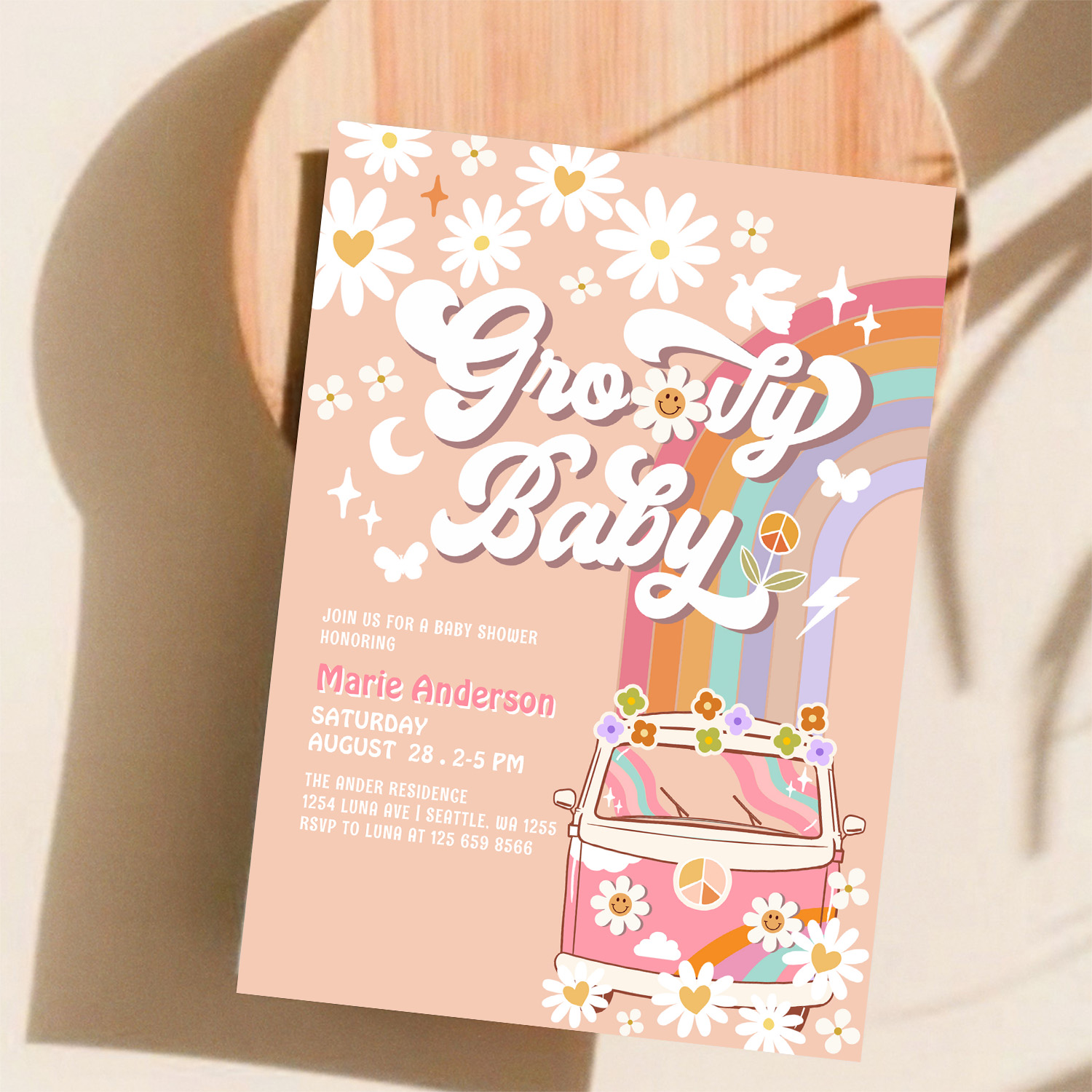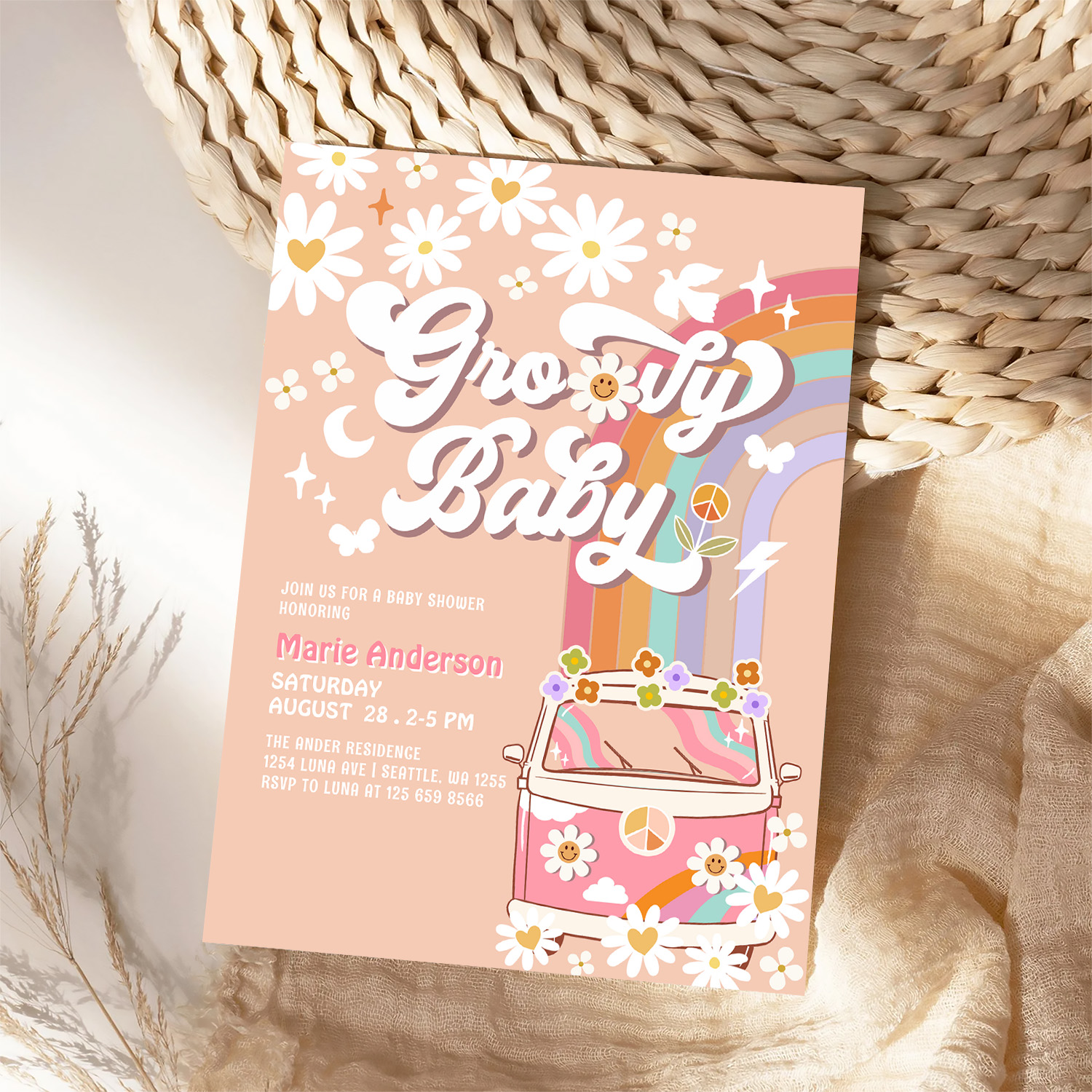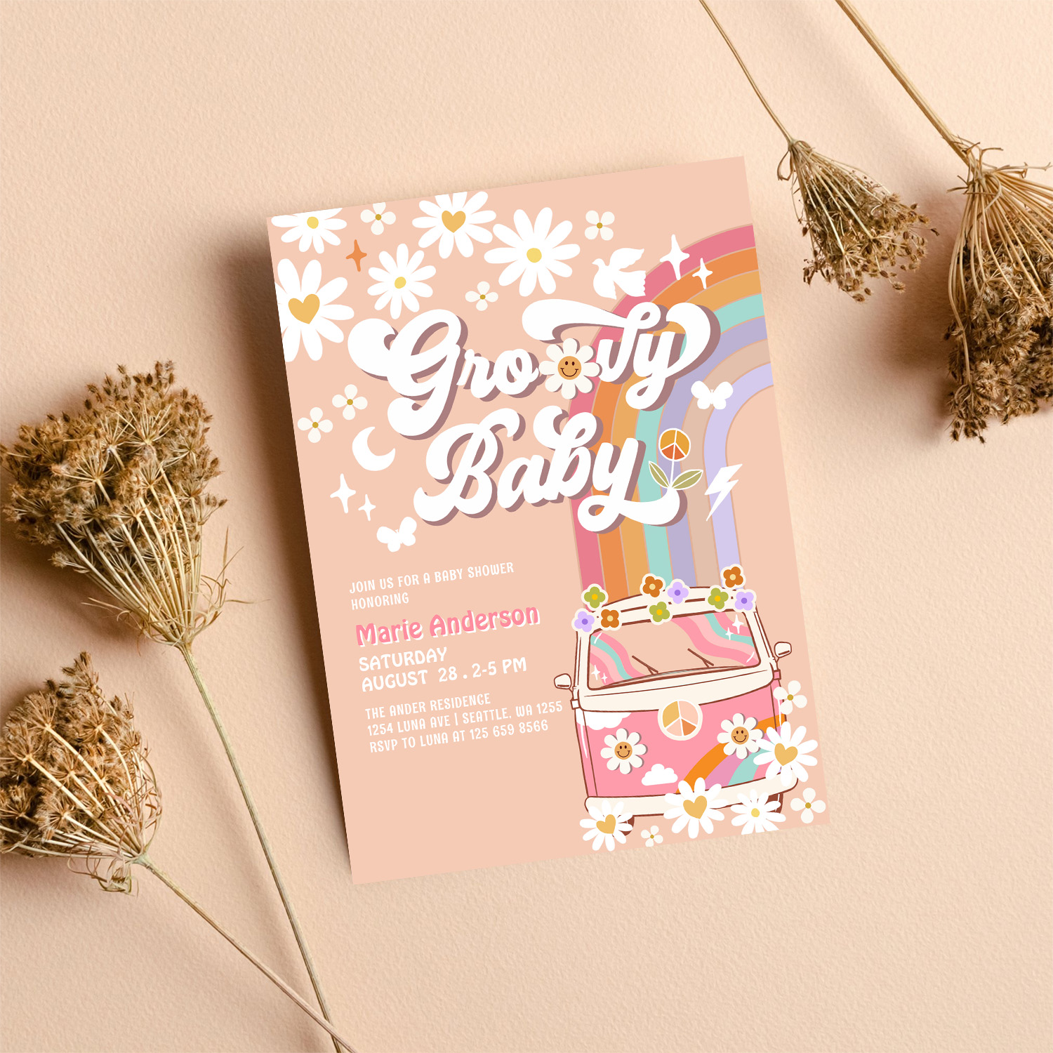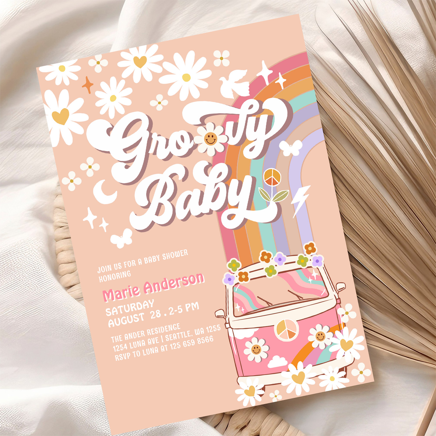 Pink Daisy Rainbow Hippie Groovy Van Baby Shower Invitation