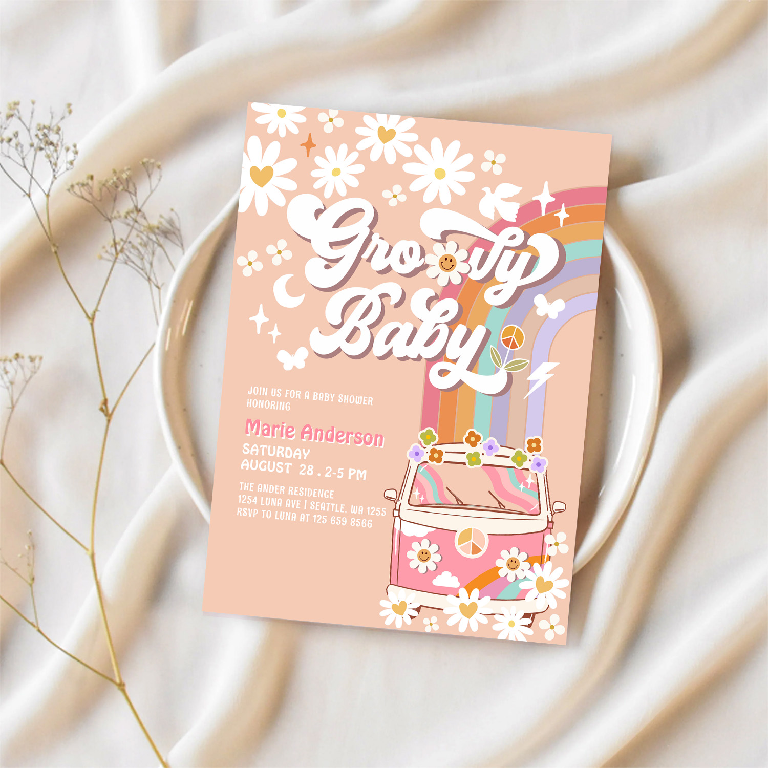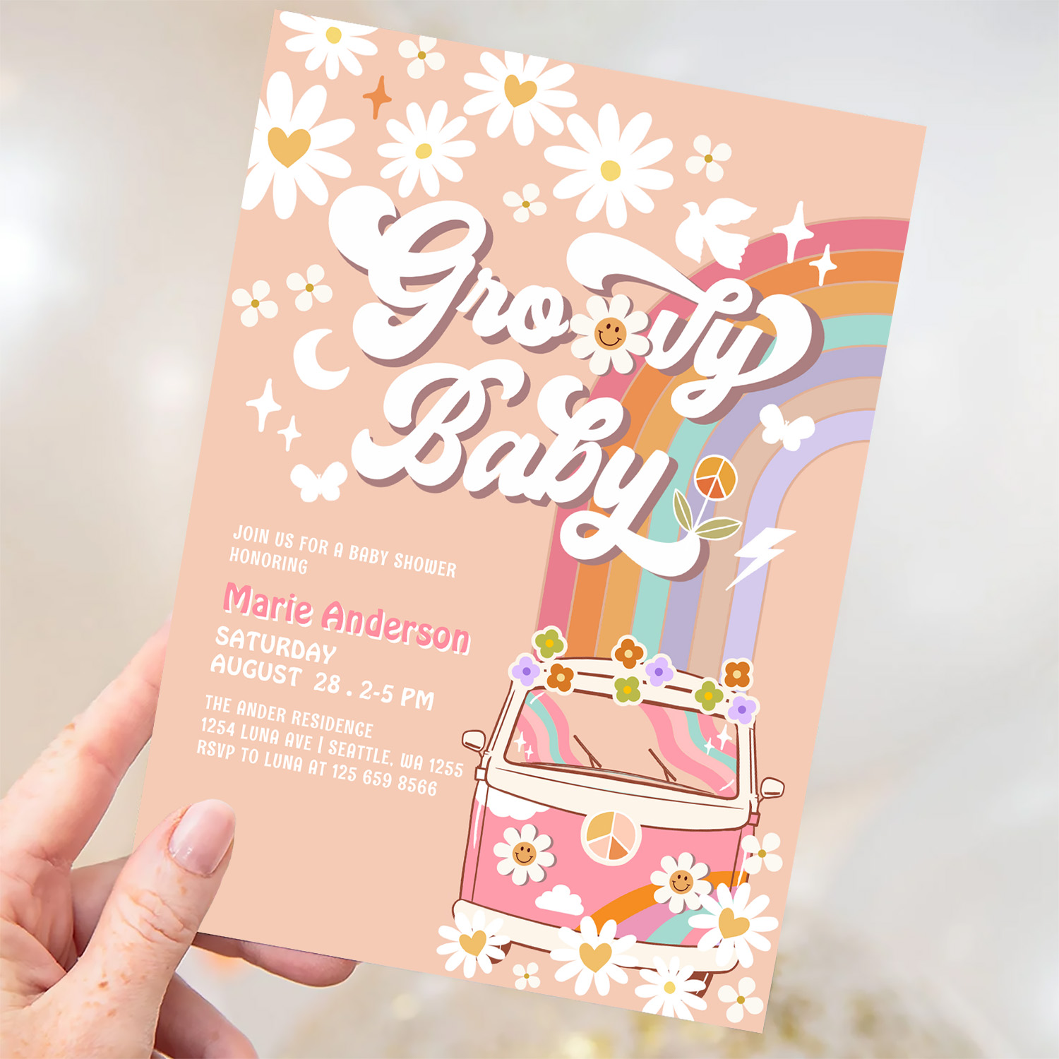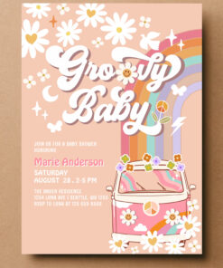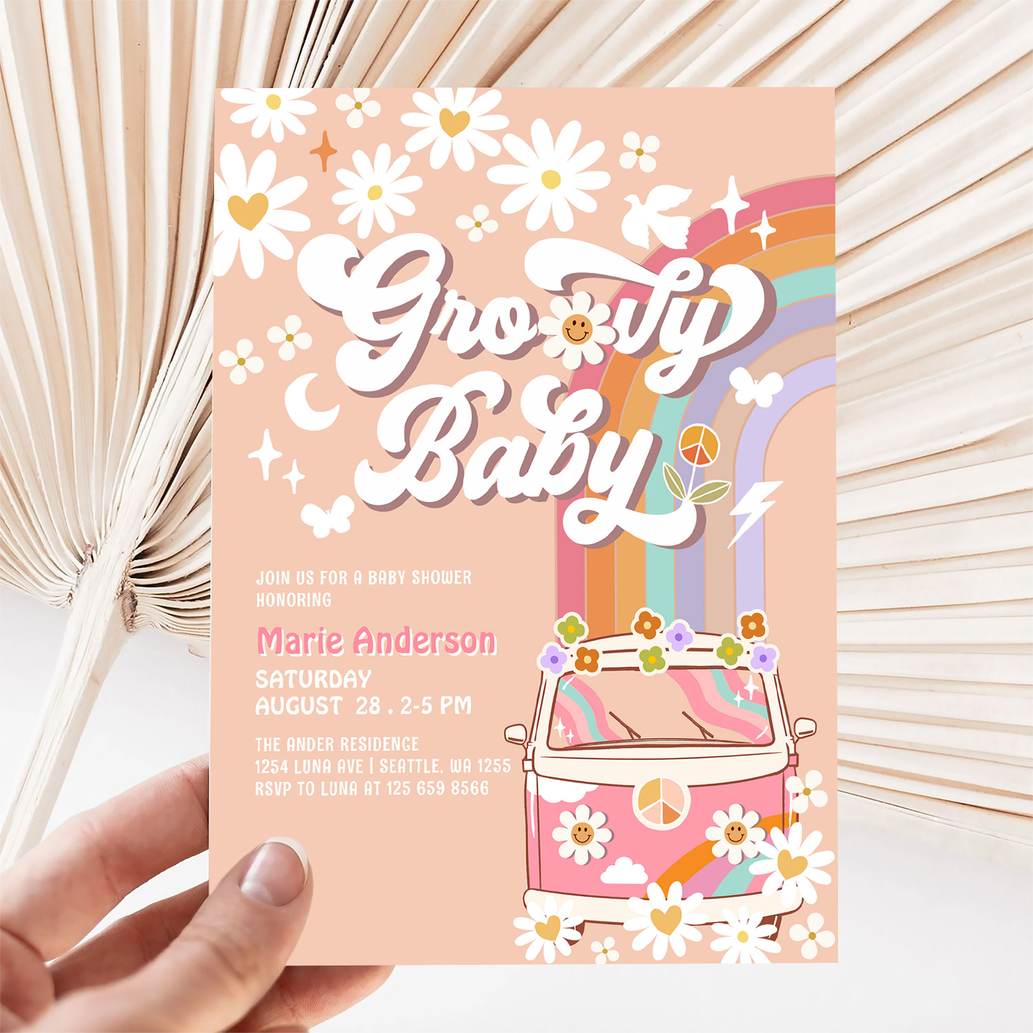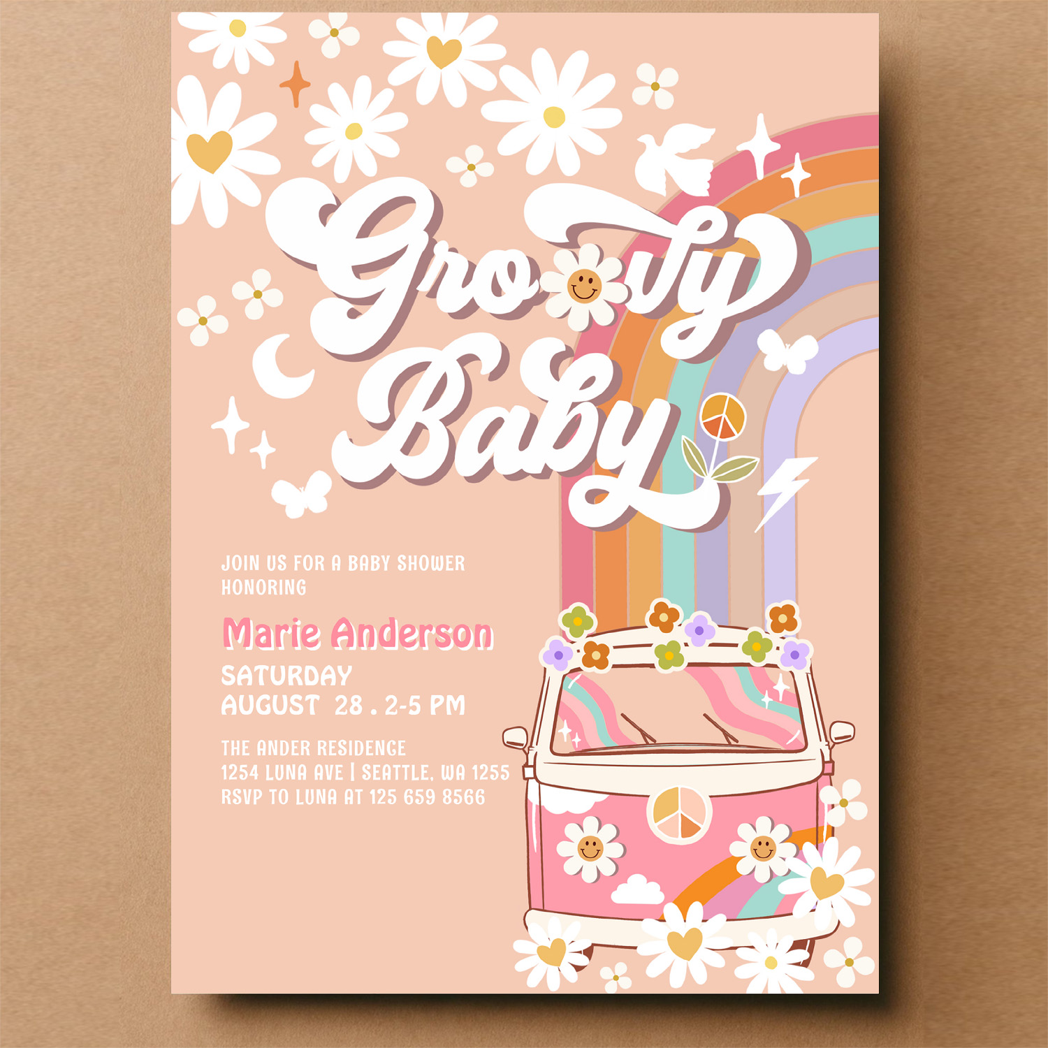 Pink Daisy Rainbow Hippie Groovy Van Baby Shower Invitation