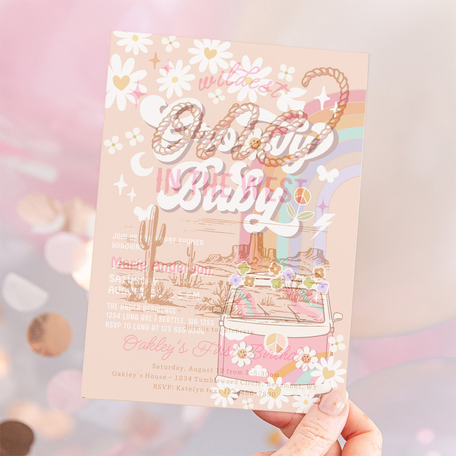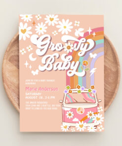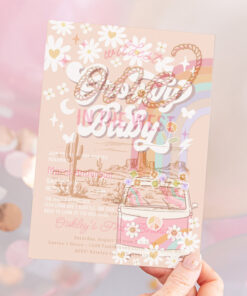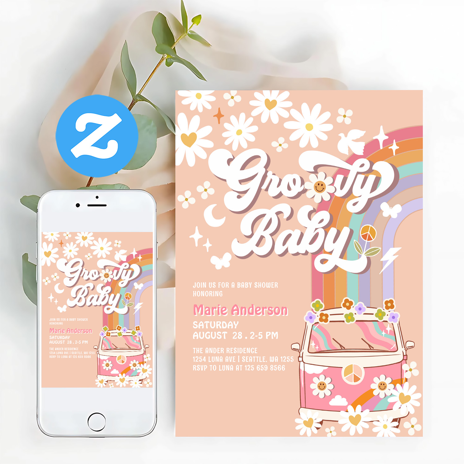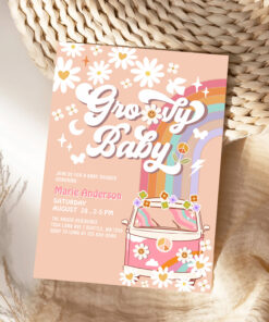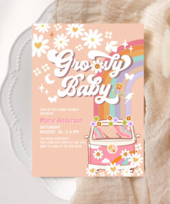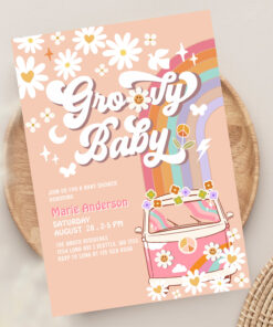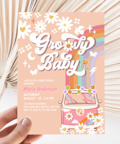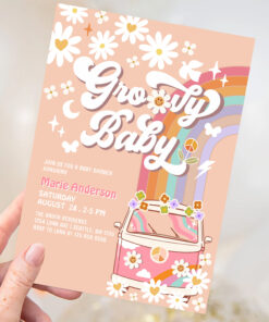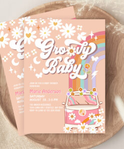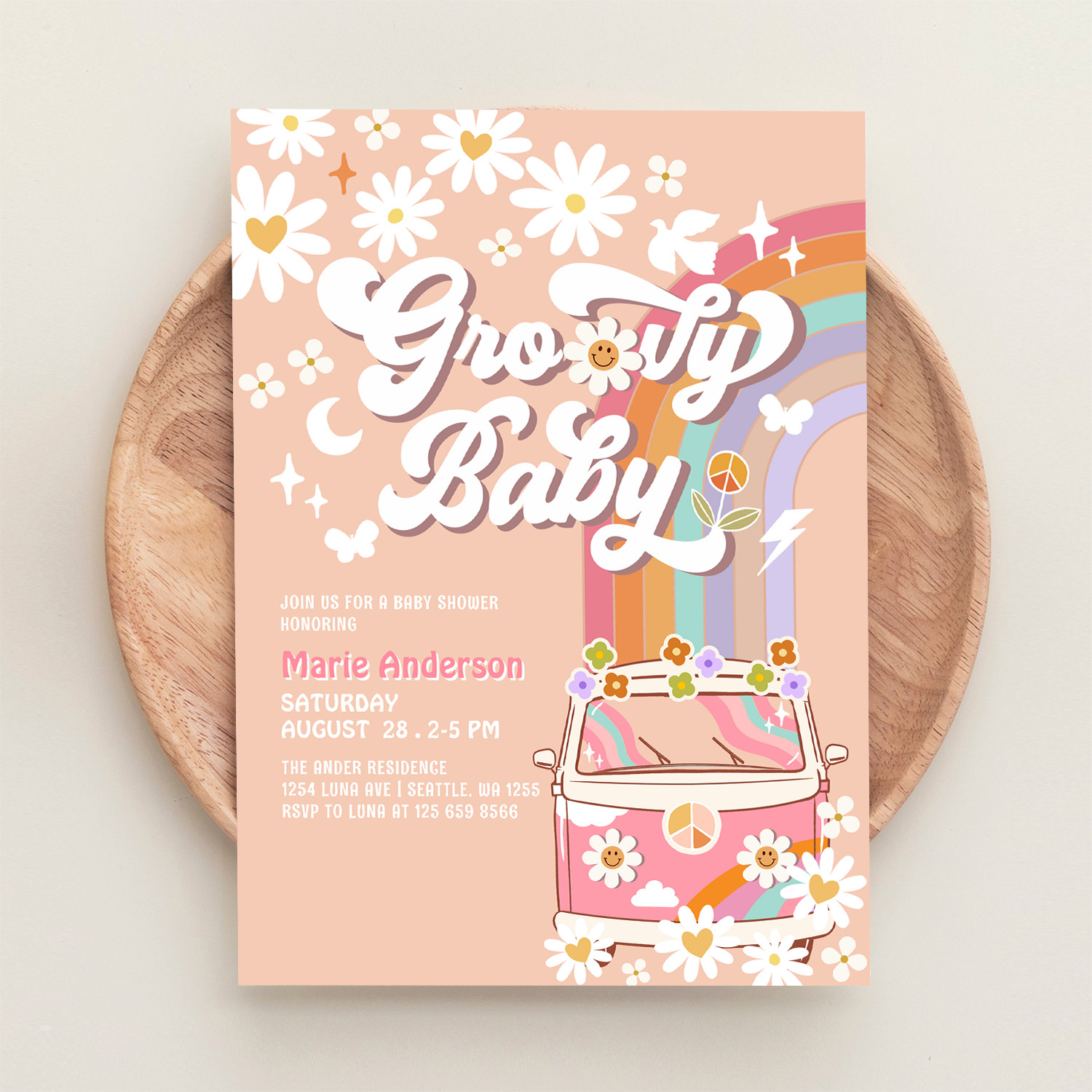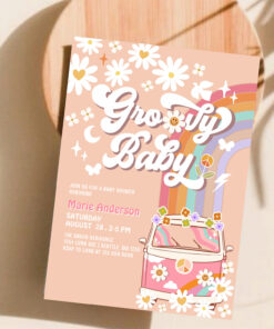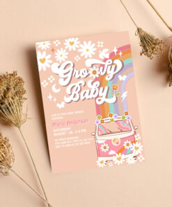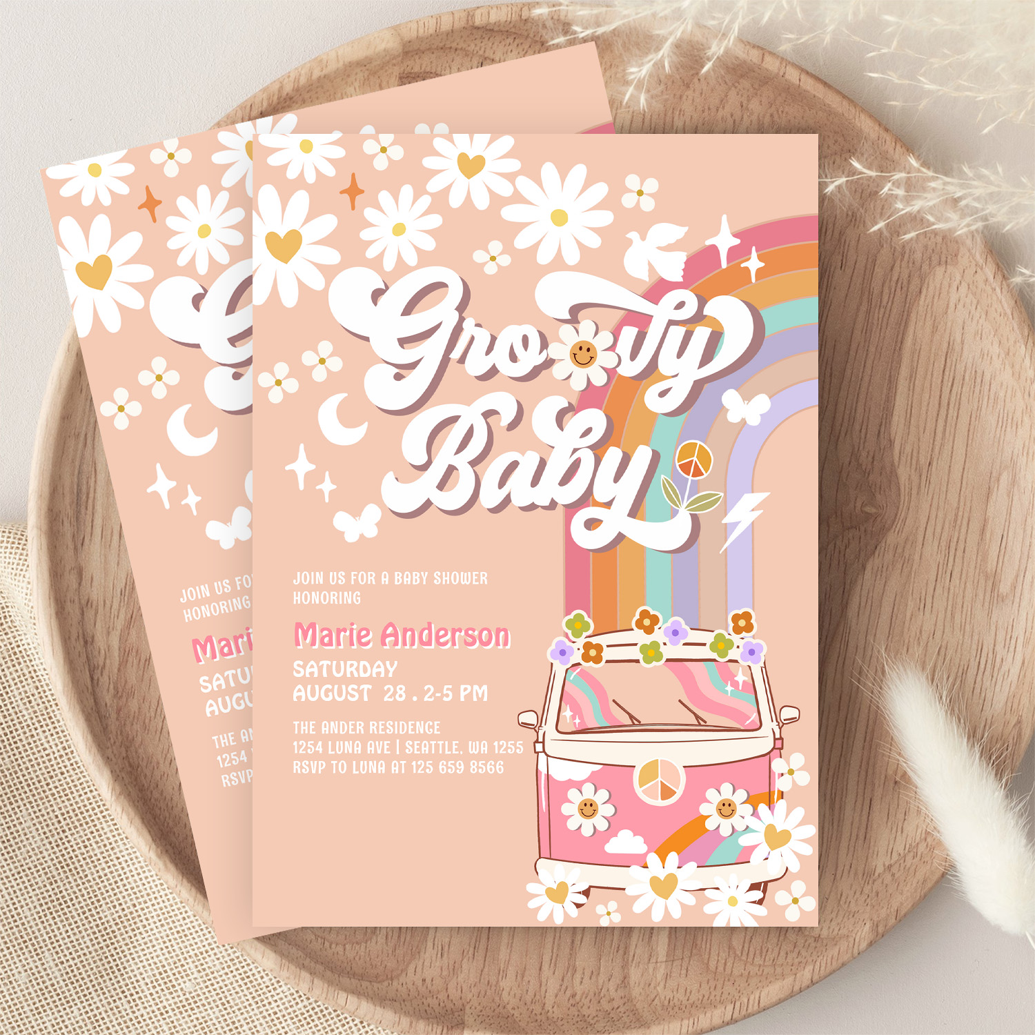 Pink Daisy Rainbow Hippie Groovy Van Baby Shower Invitation