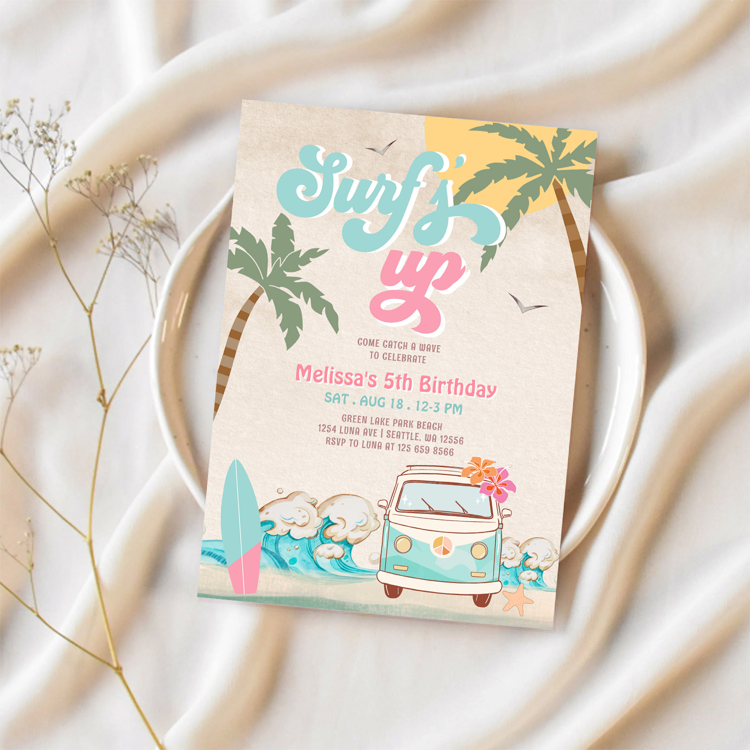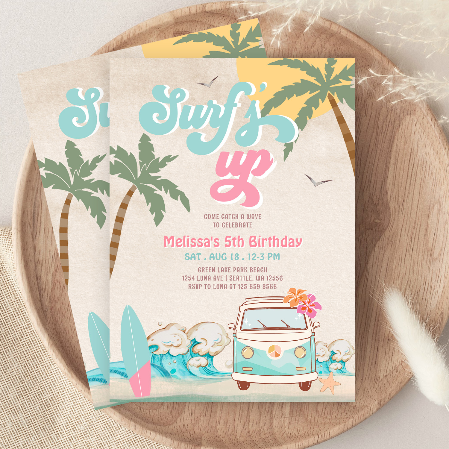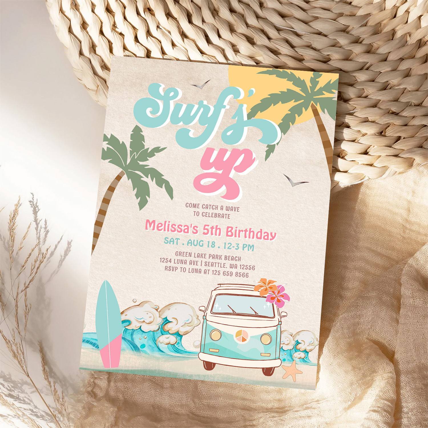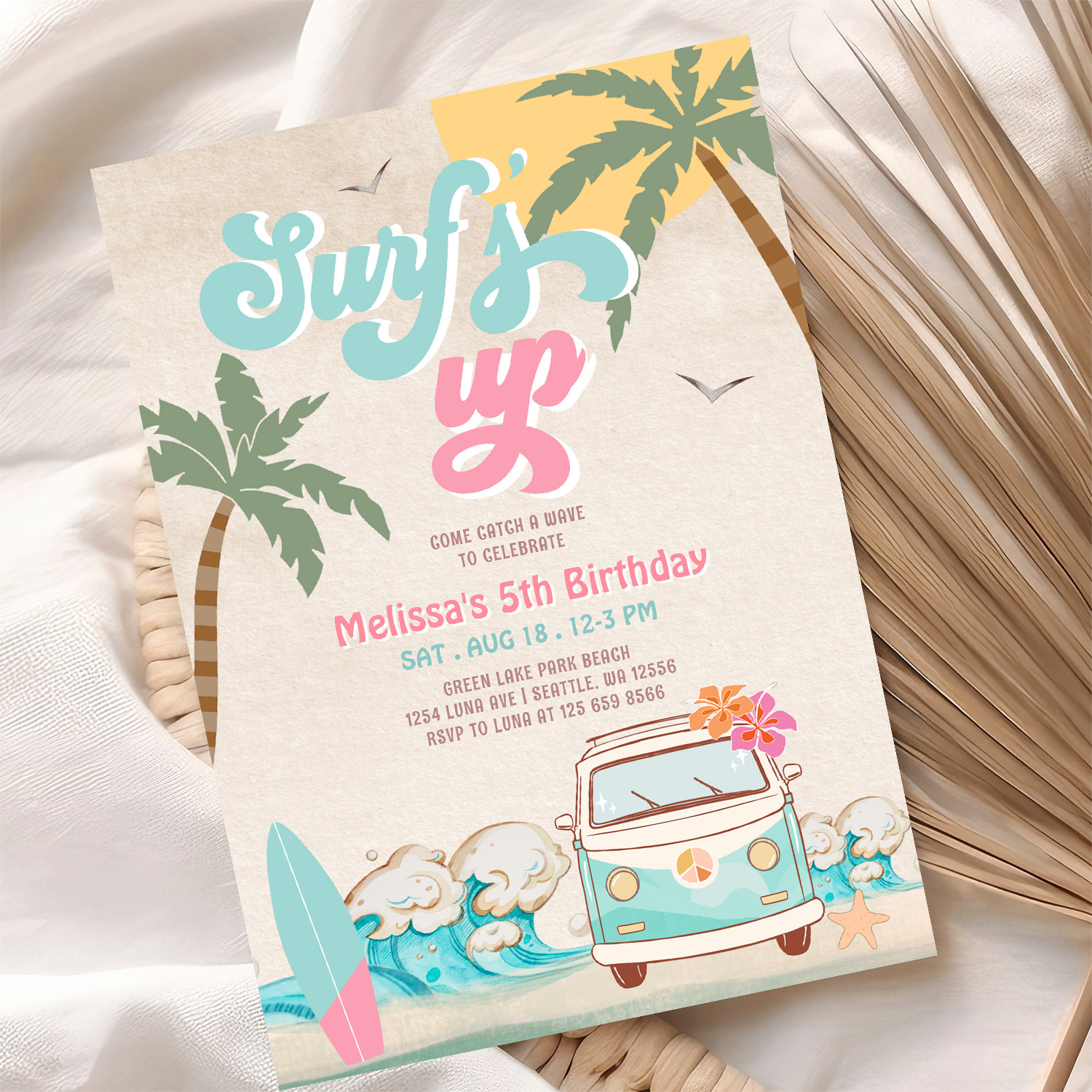 Pink Mint Aqua Girl Surfs Up Surfing Birthday Invitation