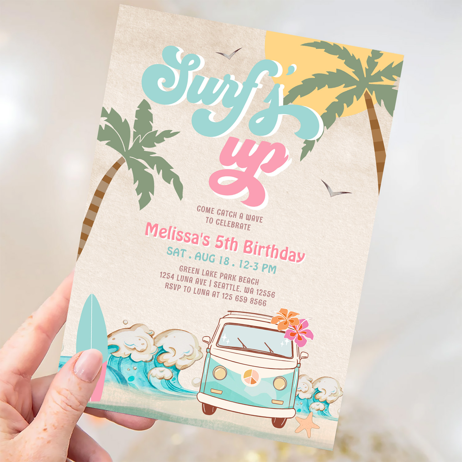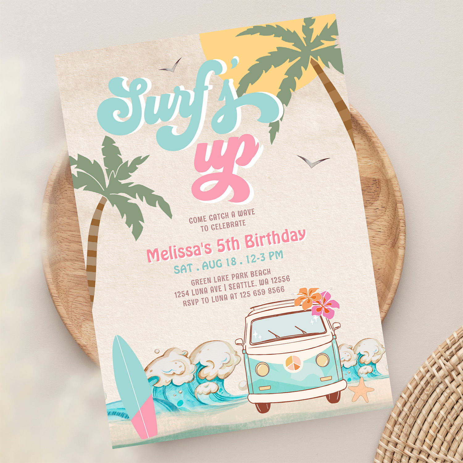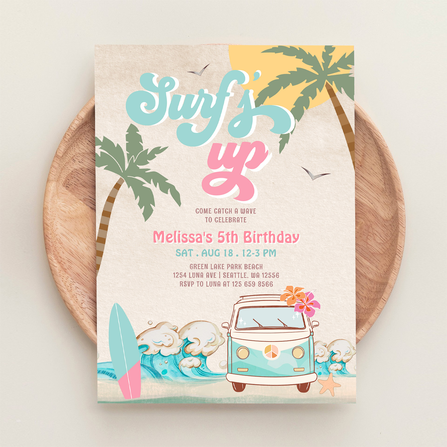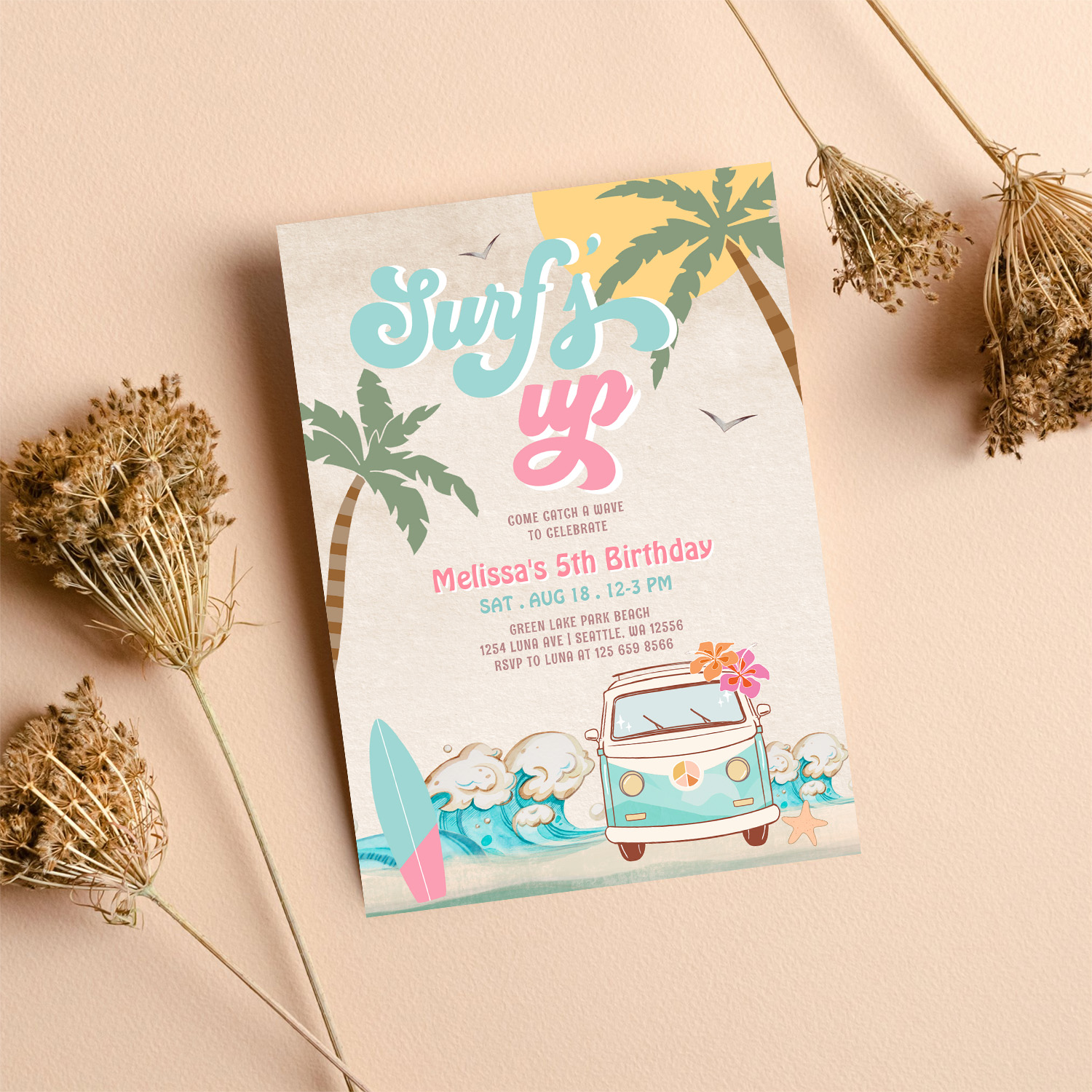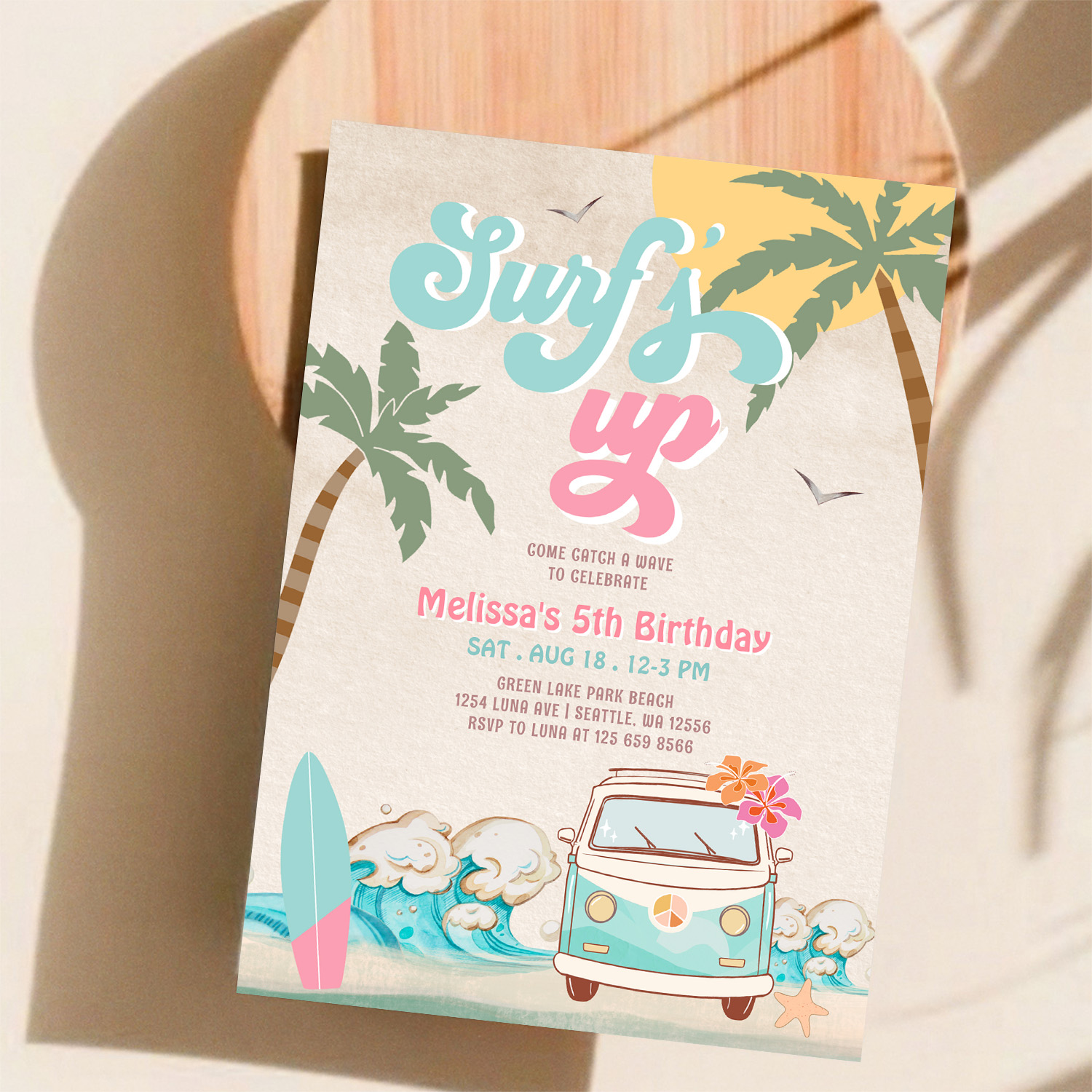 Pink Mint Aqua Girl Surfs Up Surfing Birthday Invitation