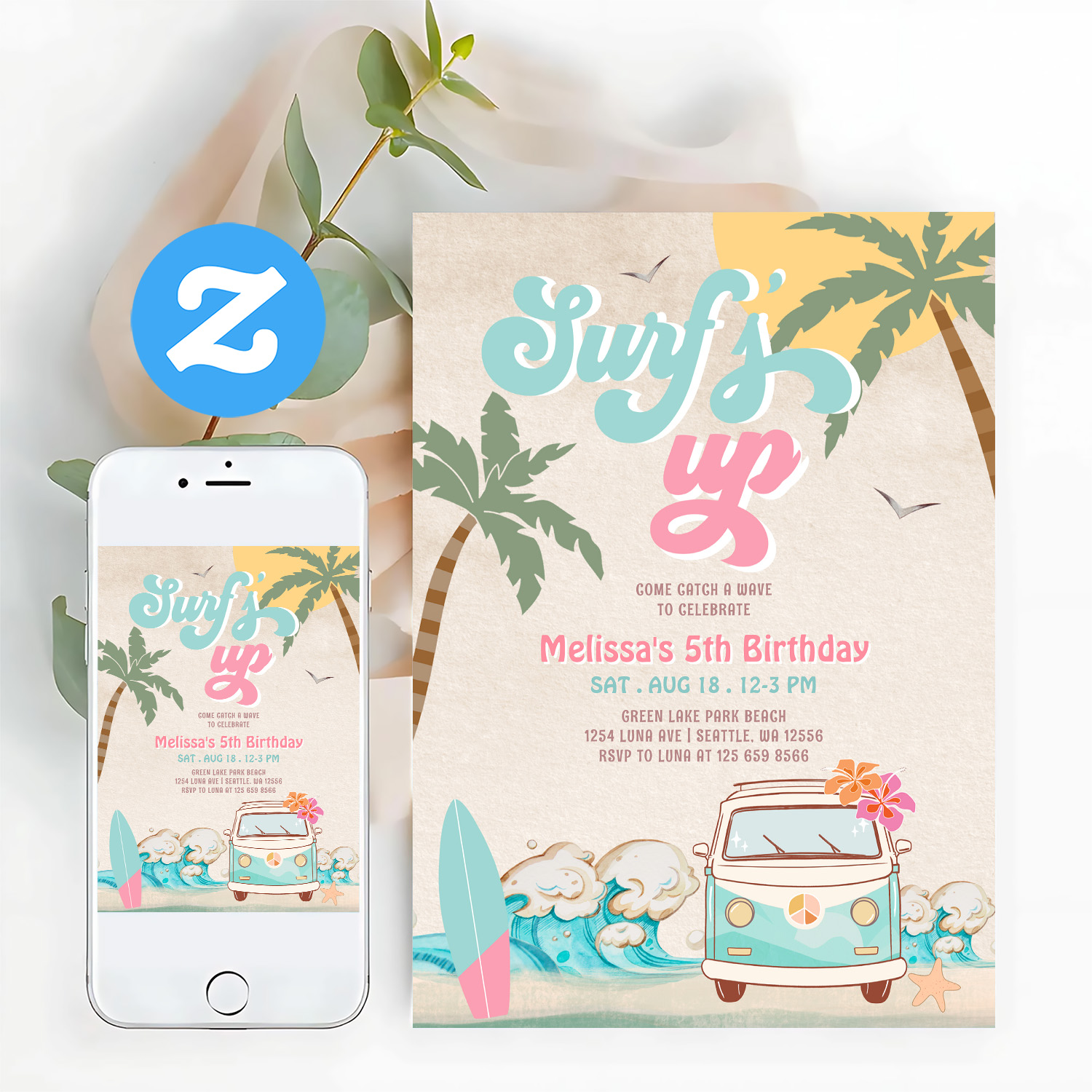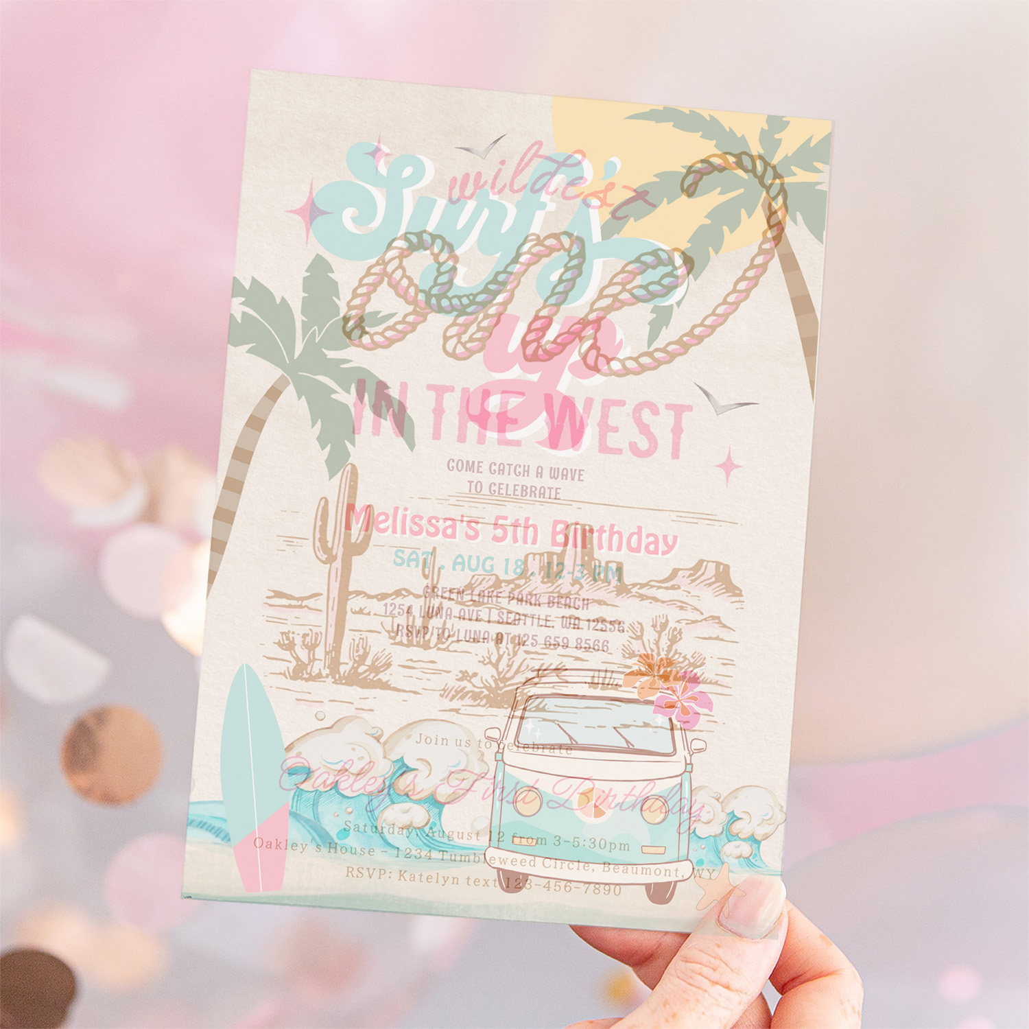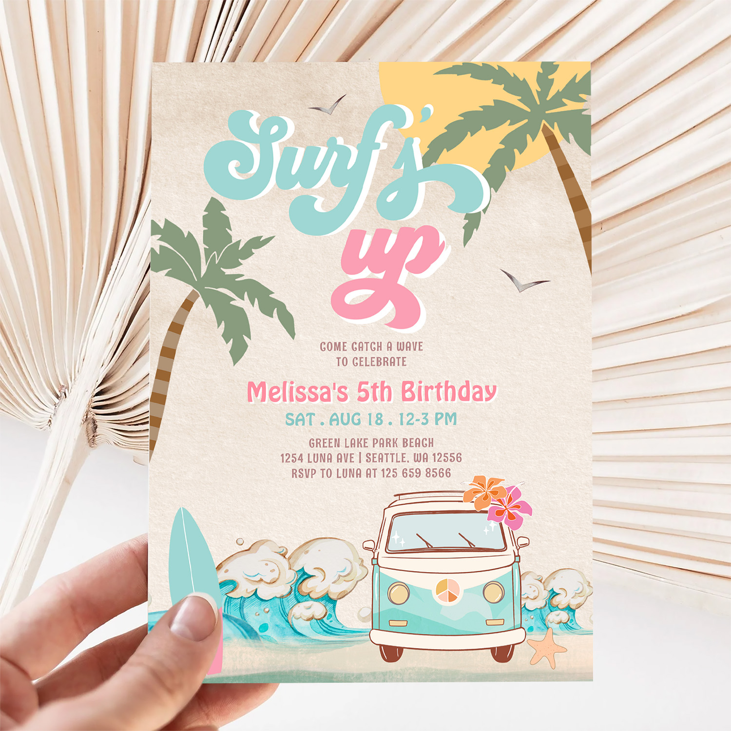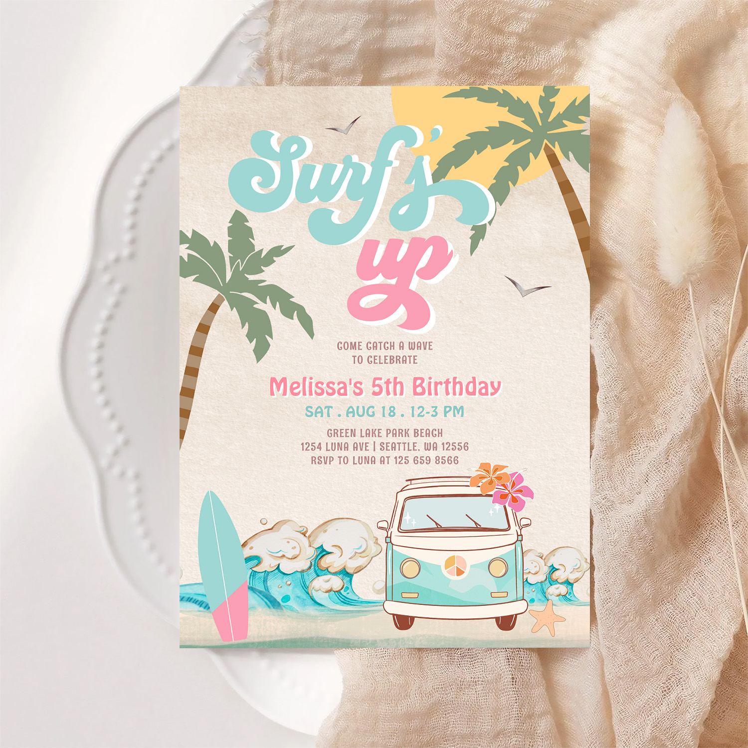 Pink Mint Aqua Girl Surfs Up Surfing Birthday Invitation