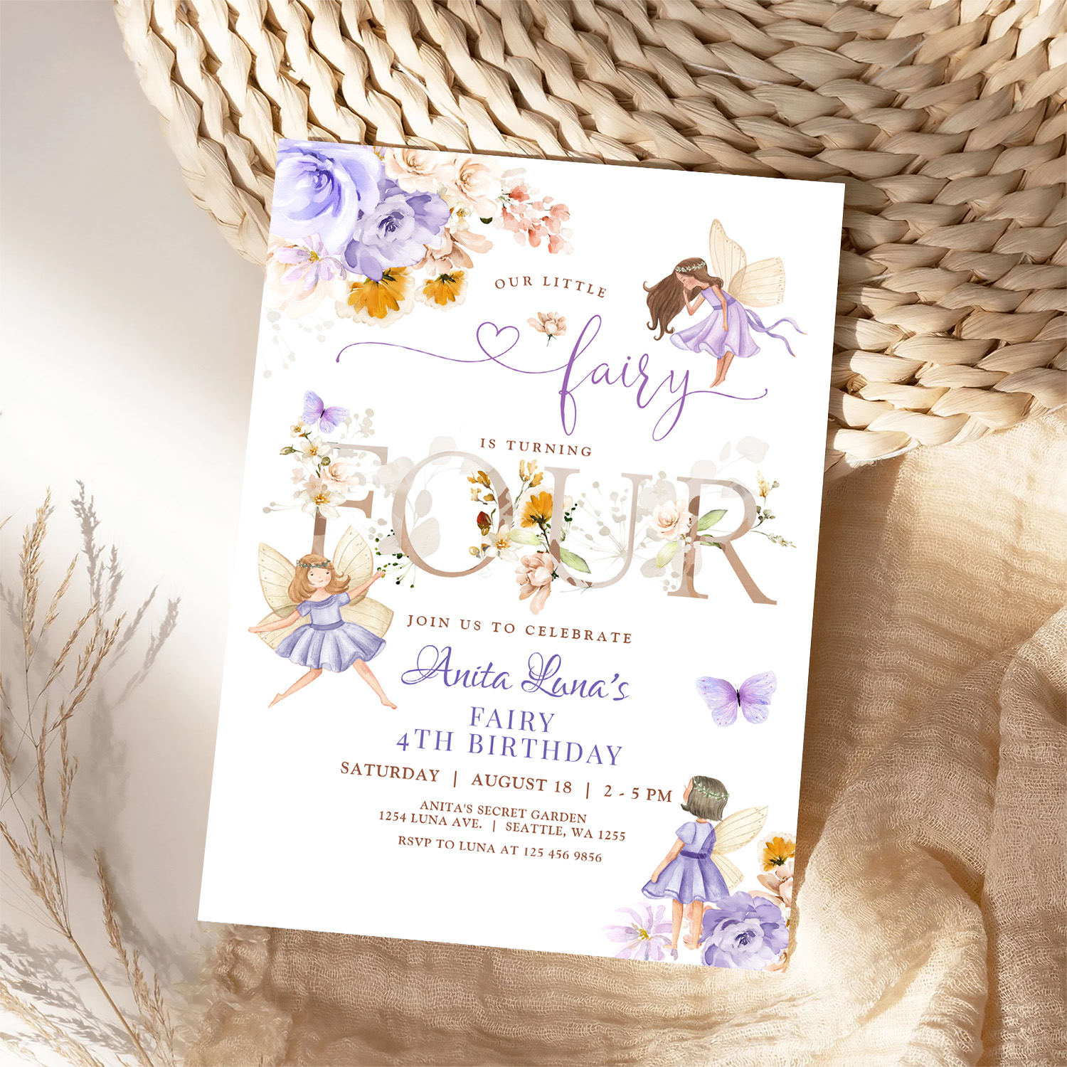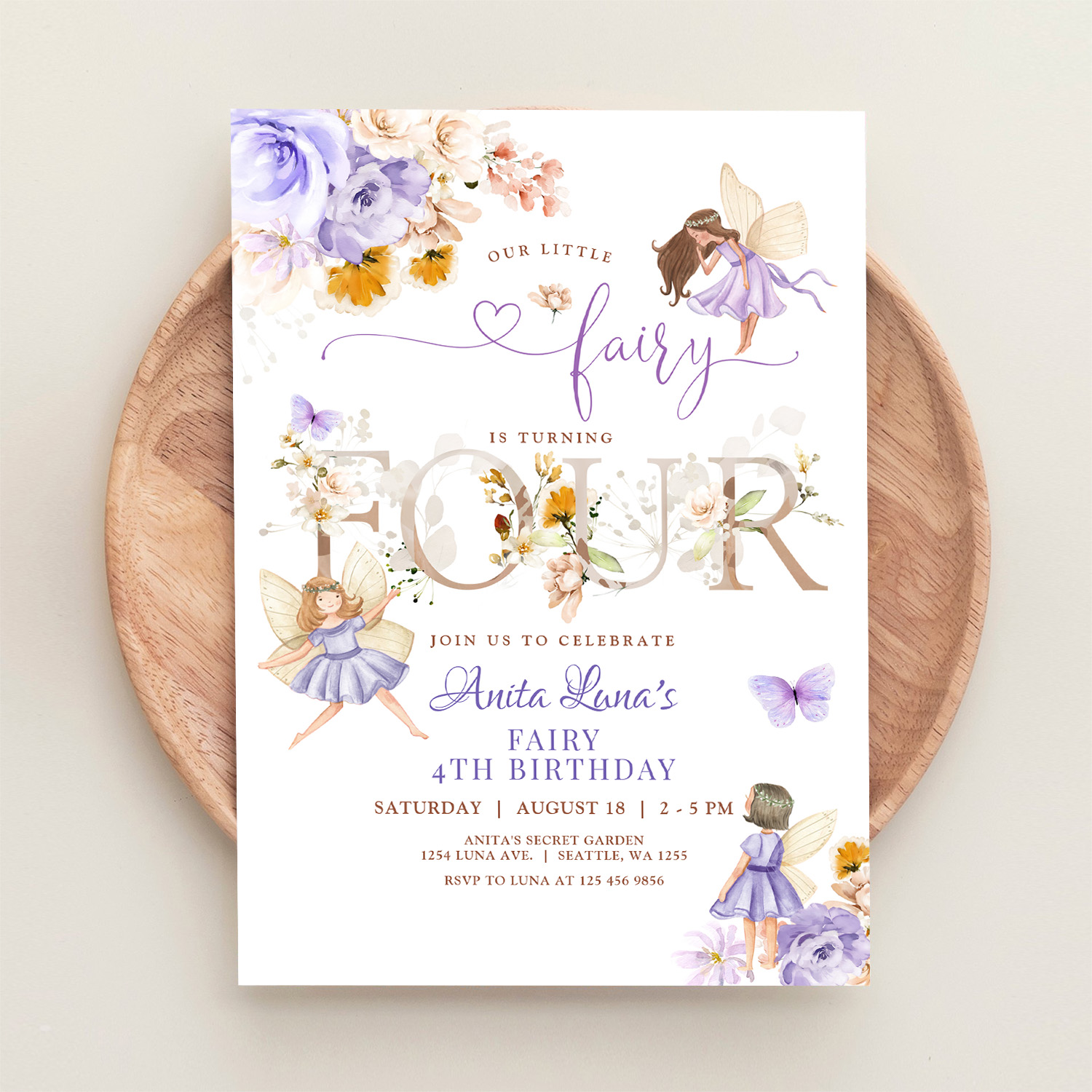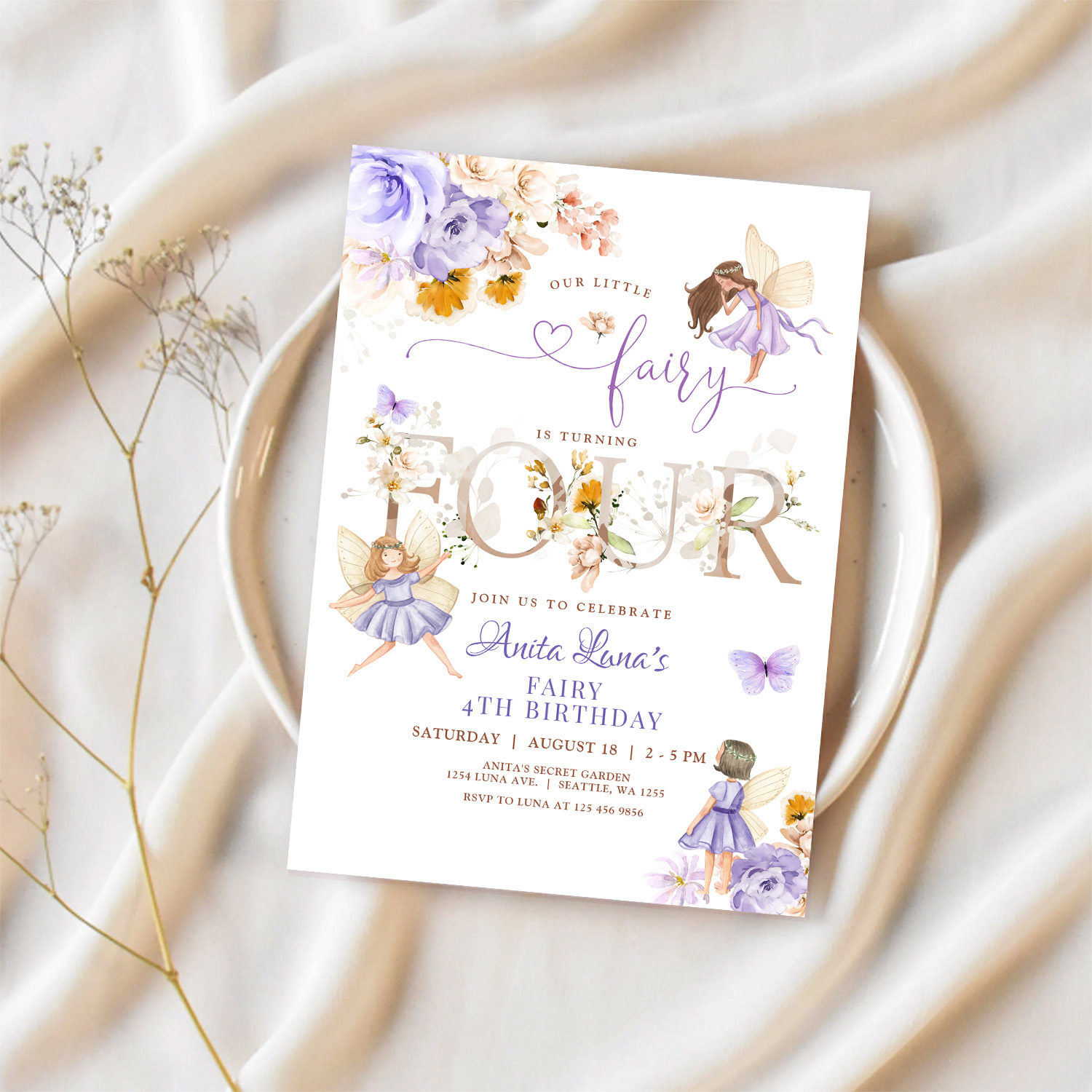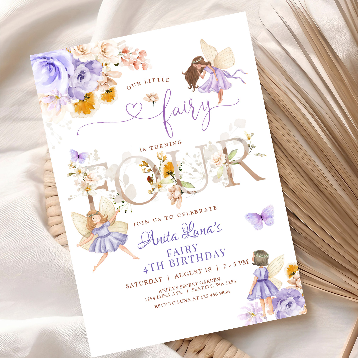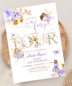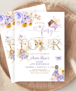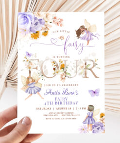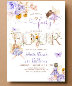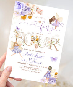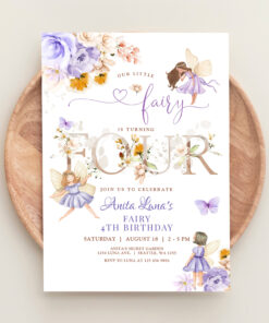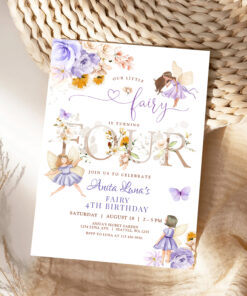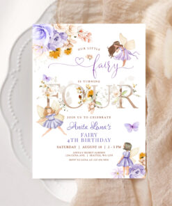 Purple Fairy Butterfly Magical Floral 4th Birthday Invitation