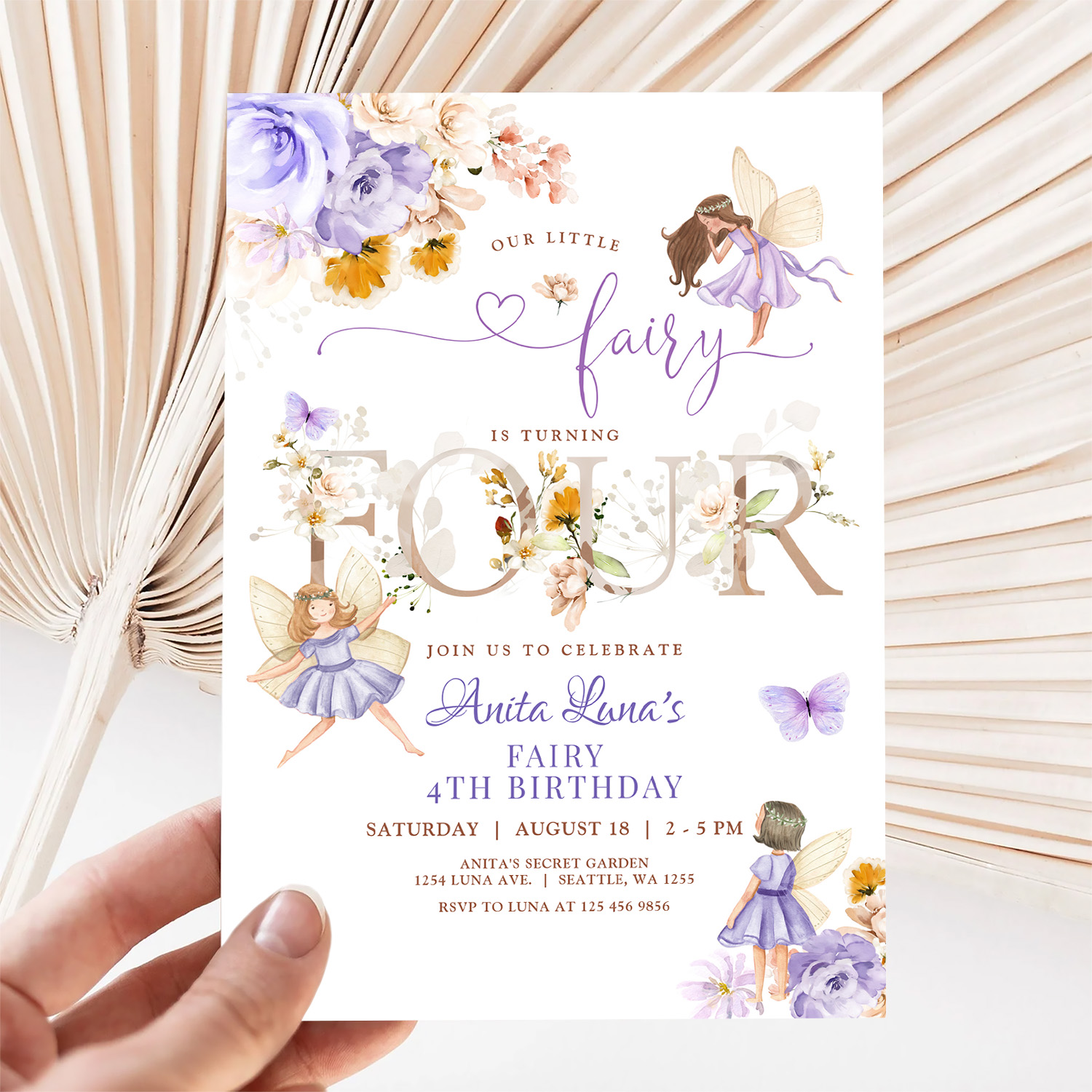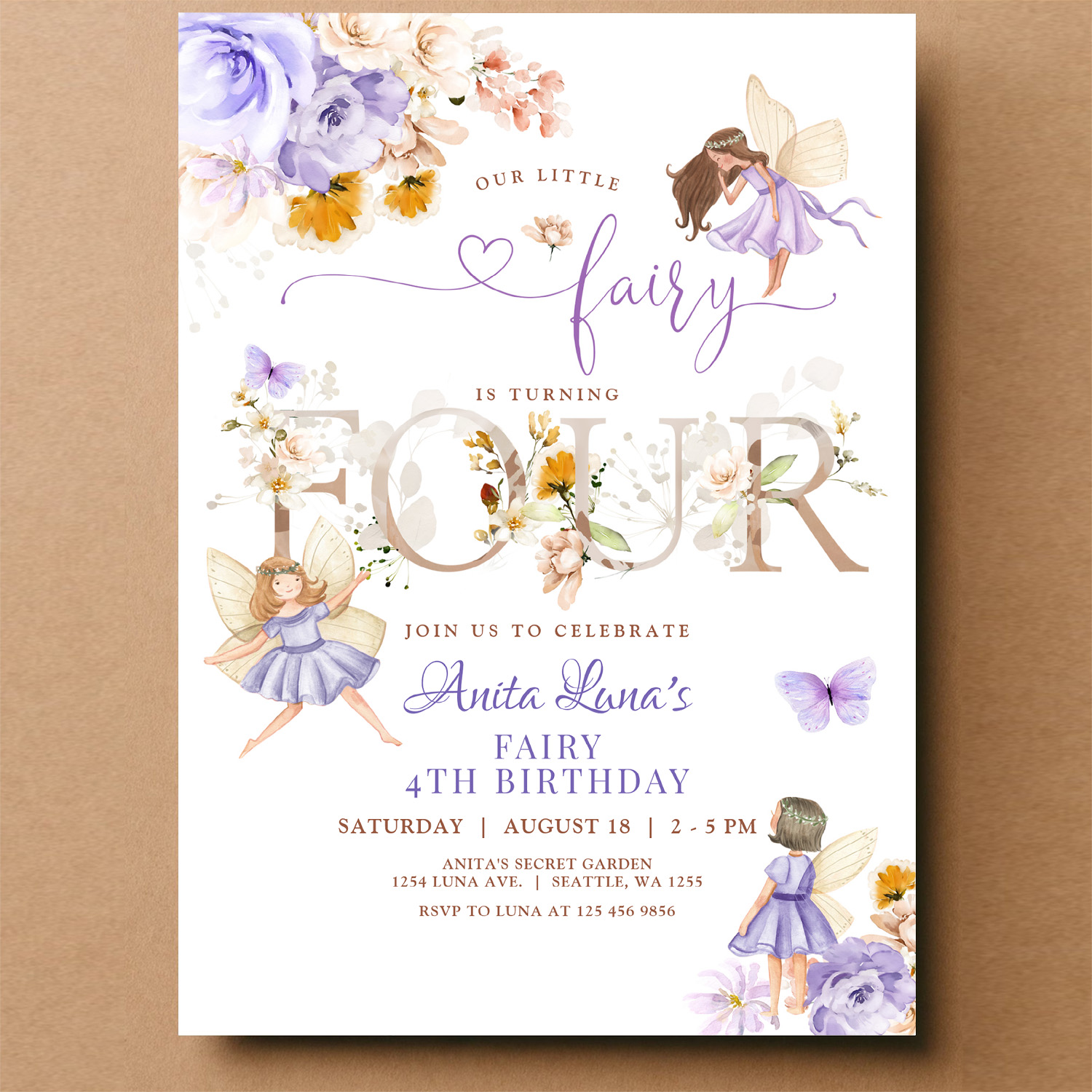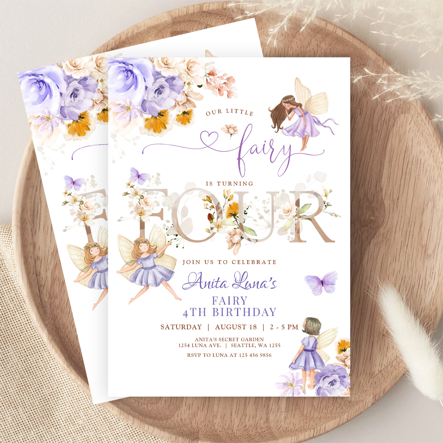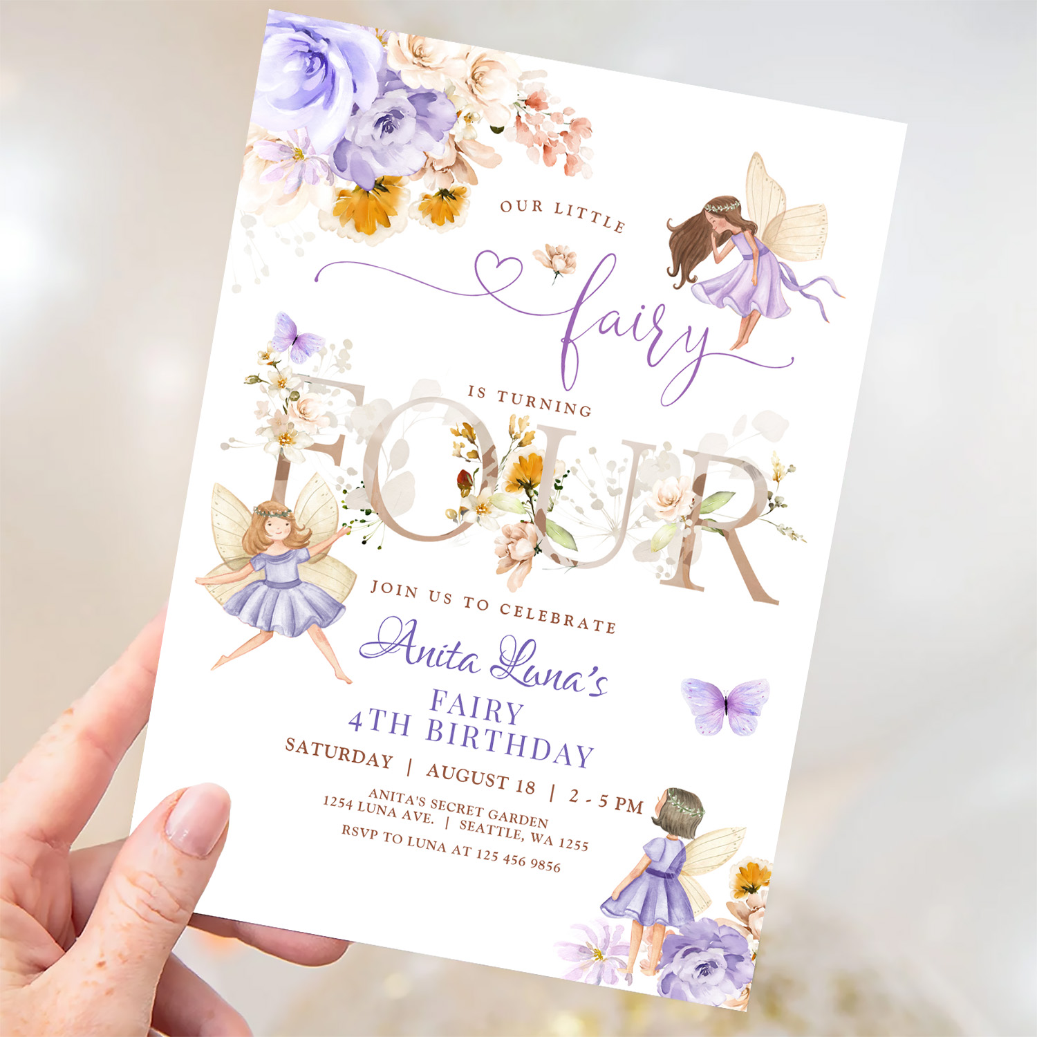 Purple Fairy Butterfly Magical Floral 4th Birthday Invitation