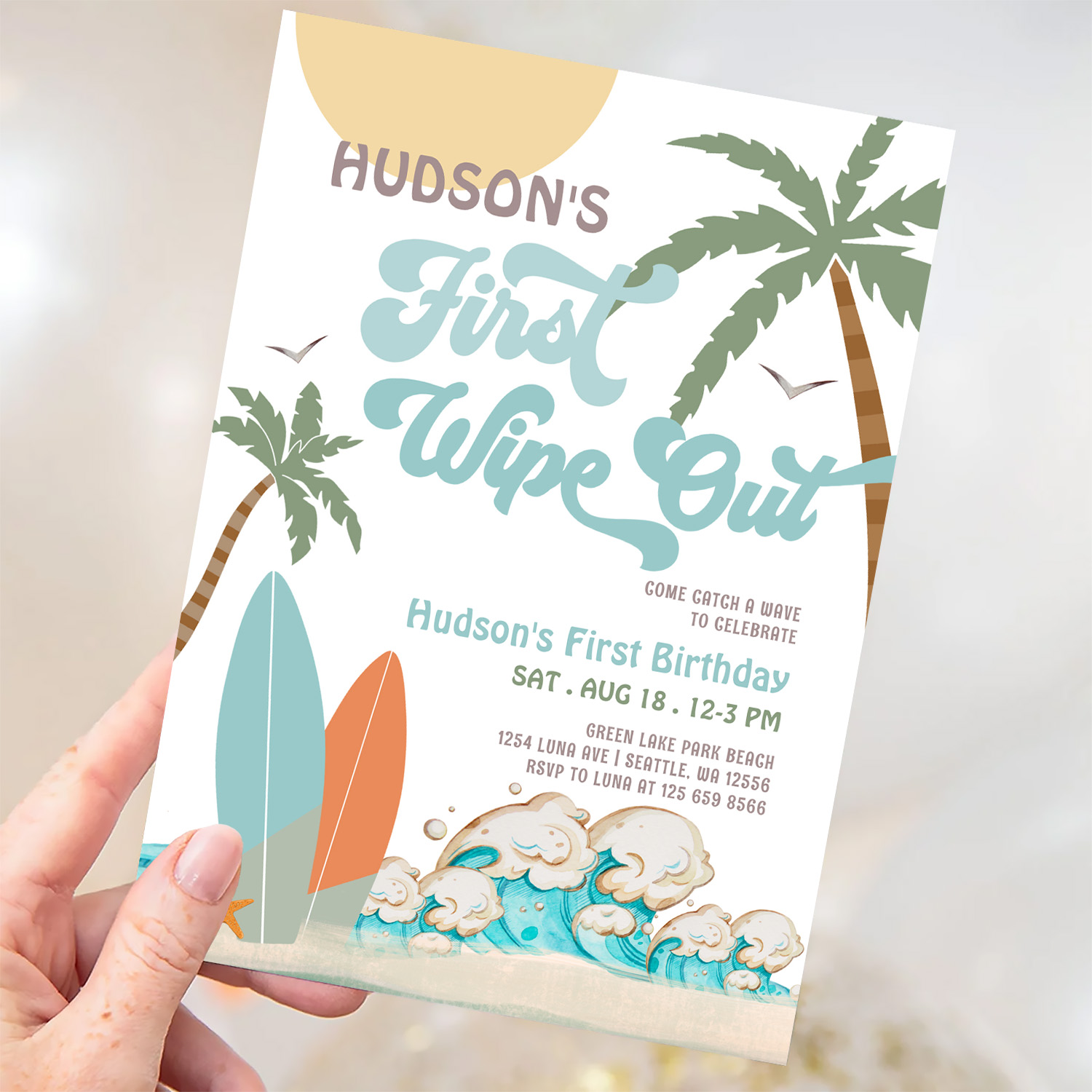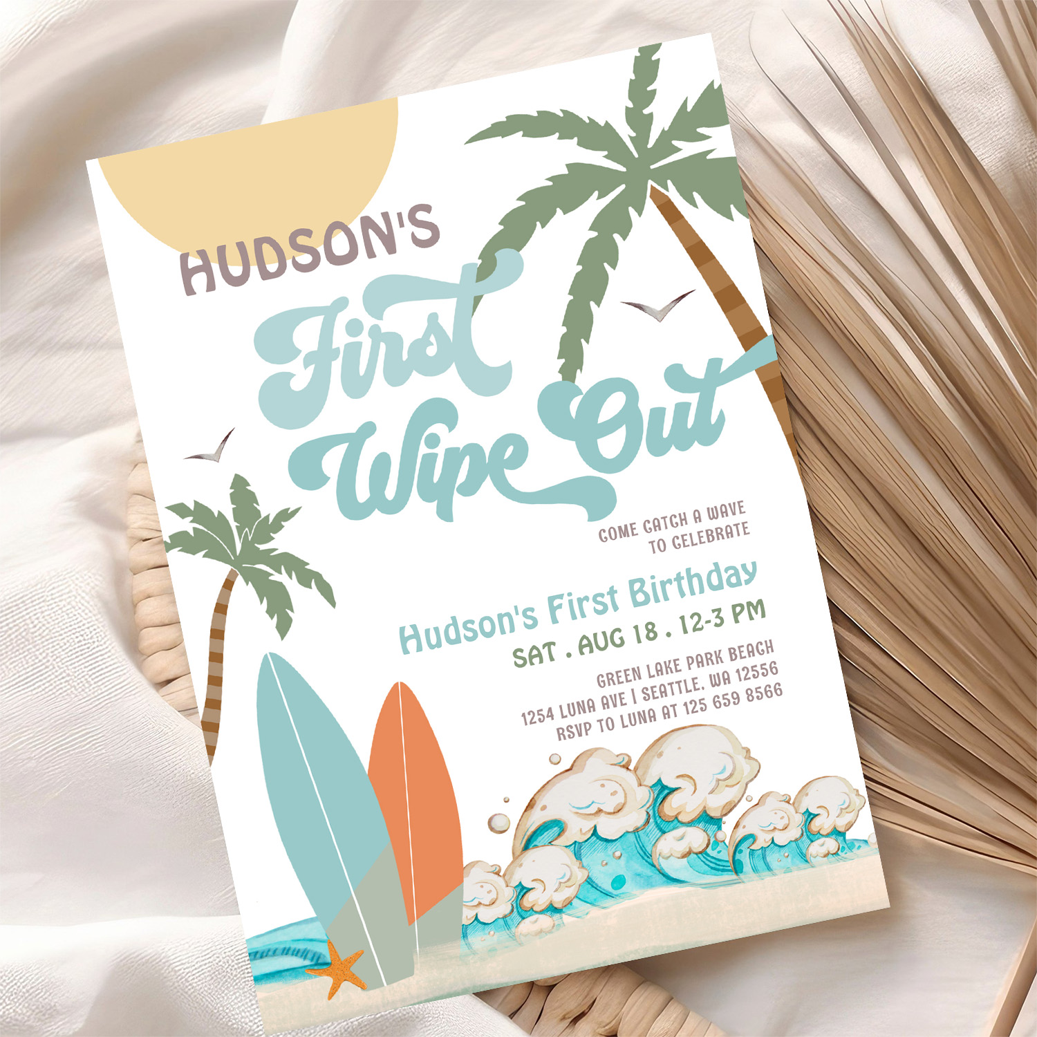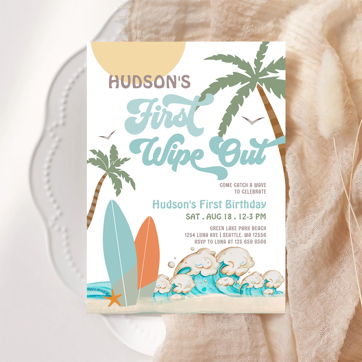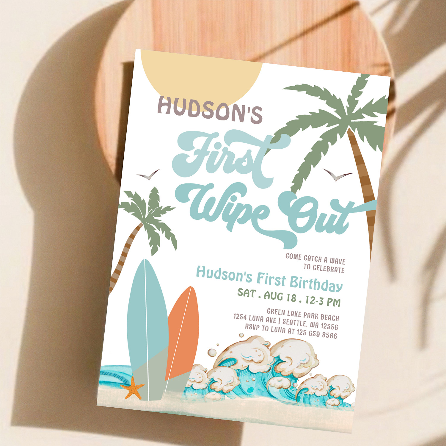 Retro First Wipe Out Surf Surfing 1st Birthday Invitation