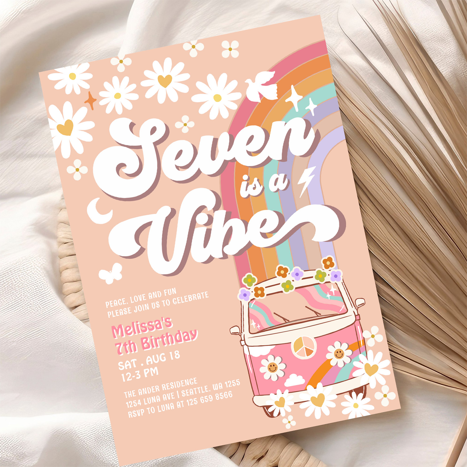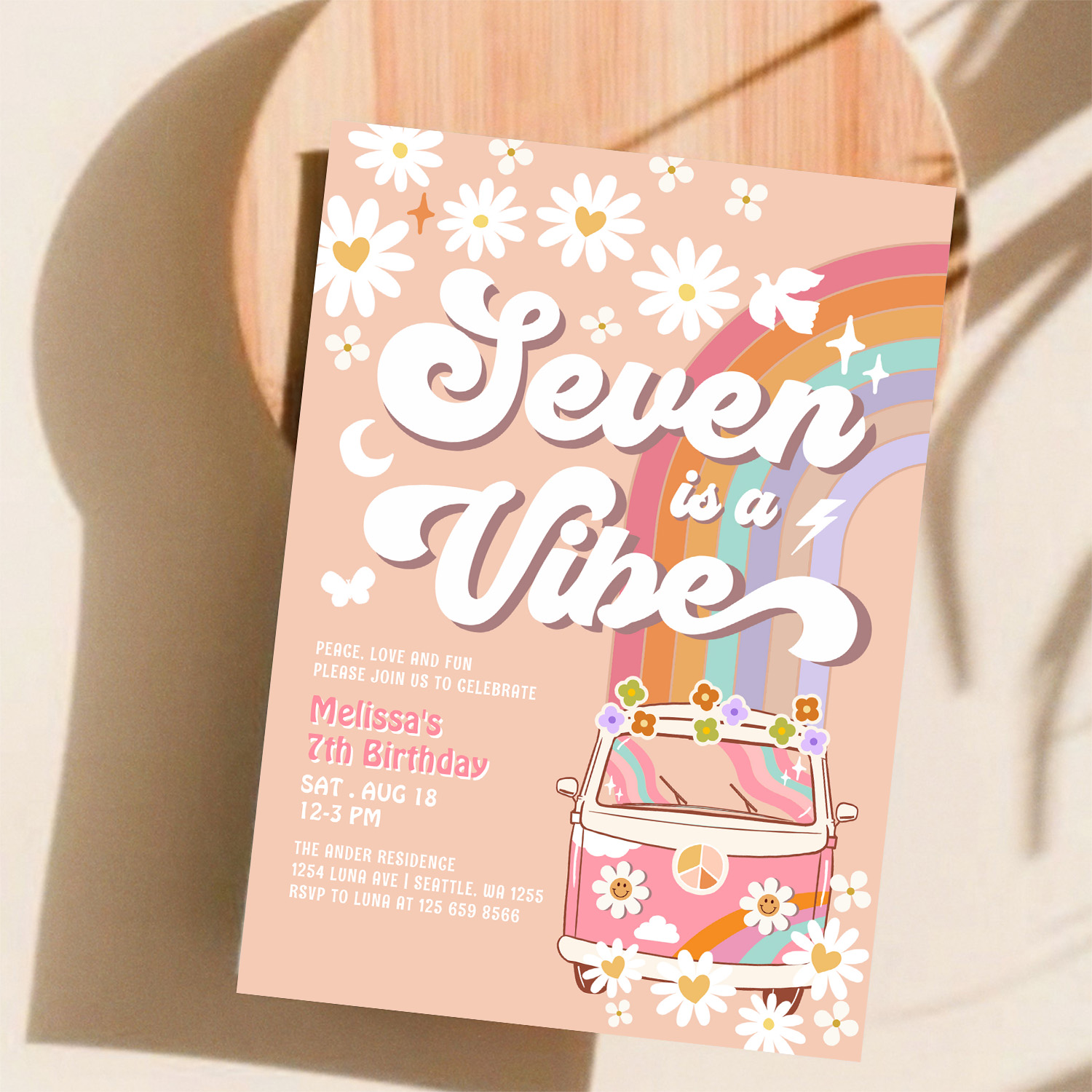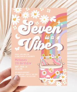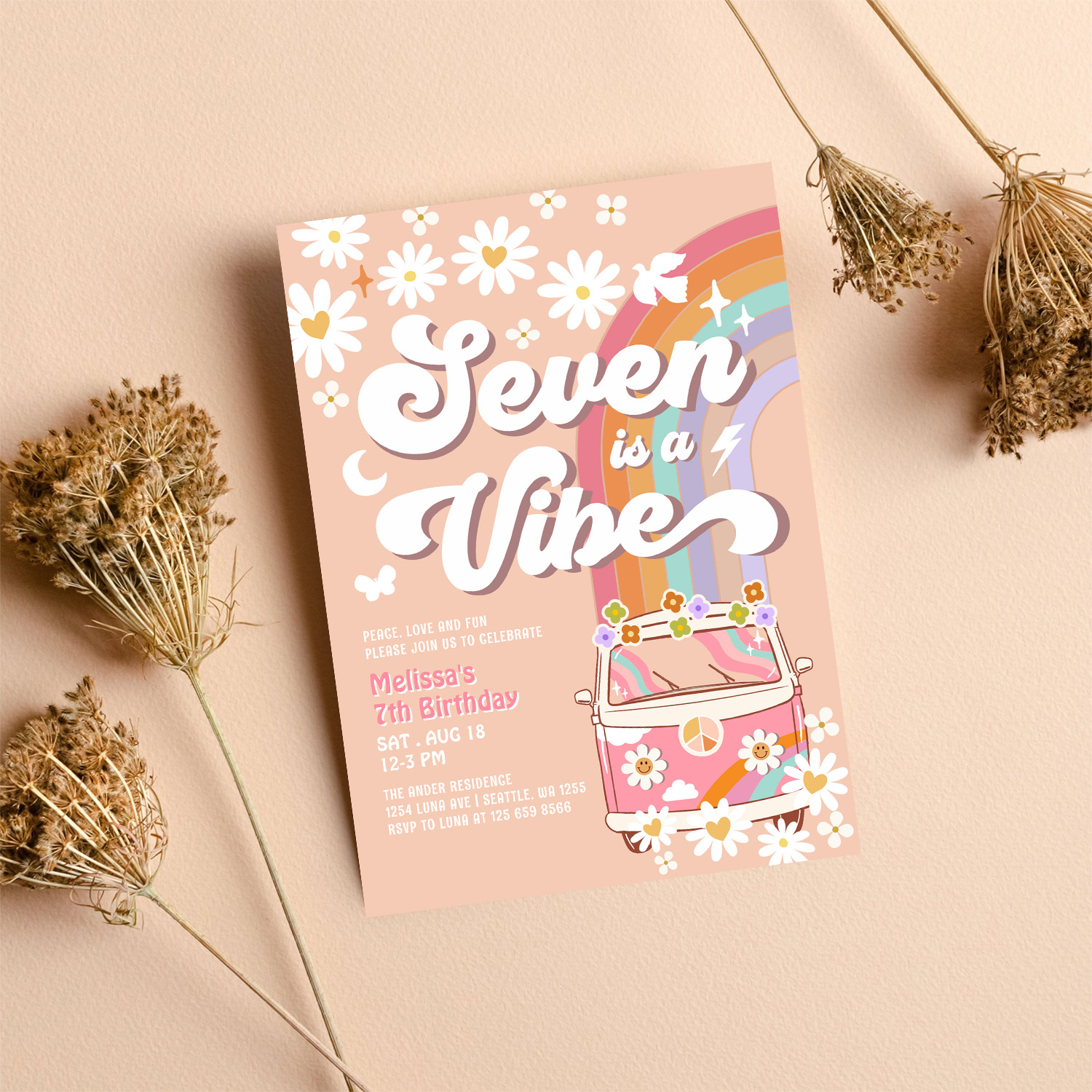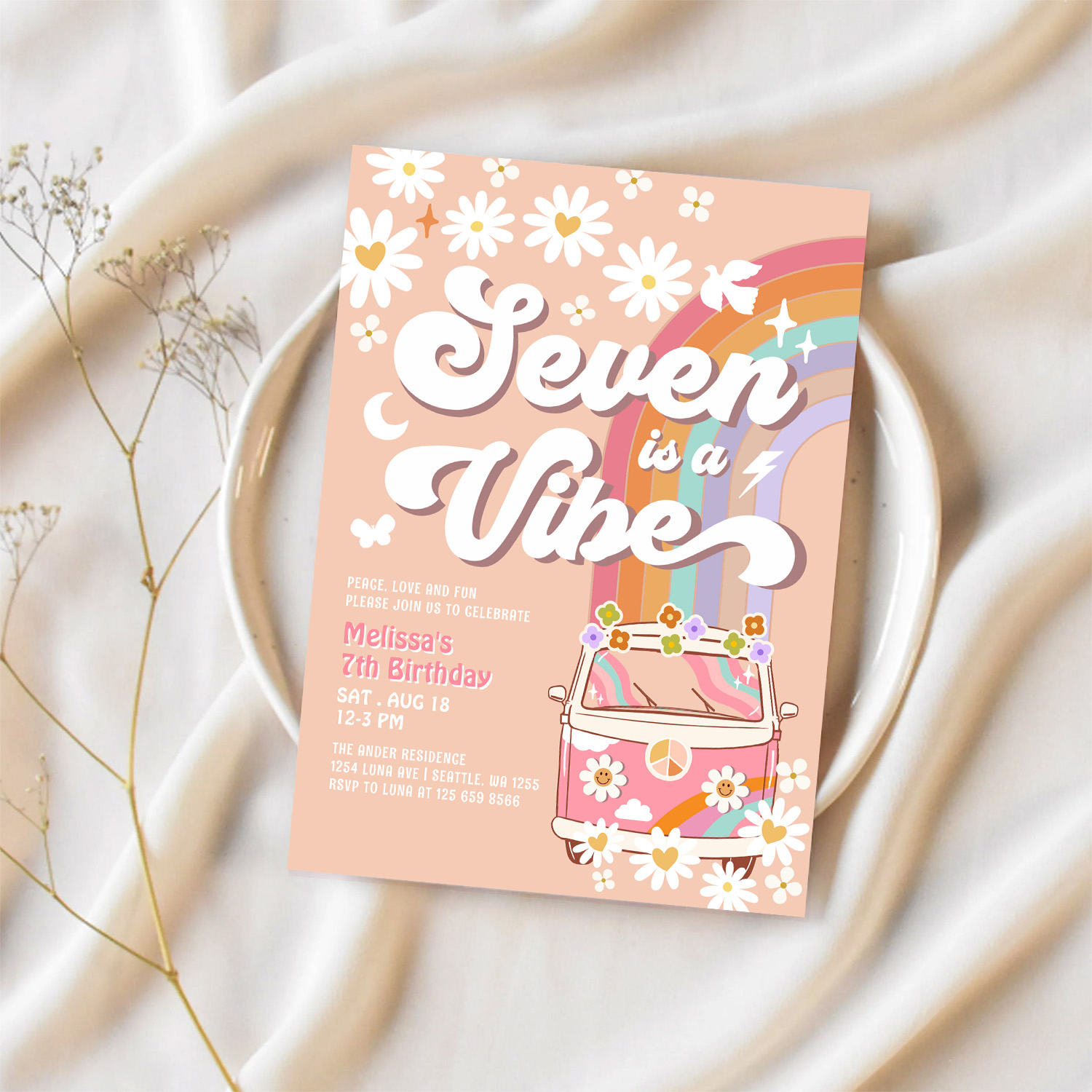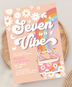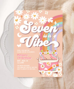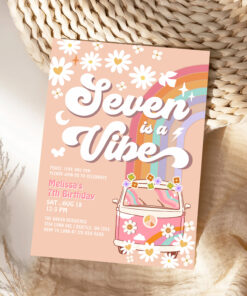 Seven Is A Vibe Pink Daisy Groovy 7th Birthday Invitation