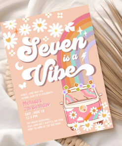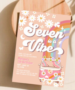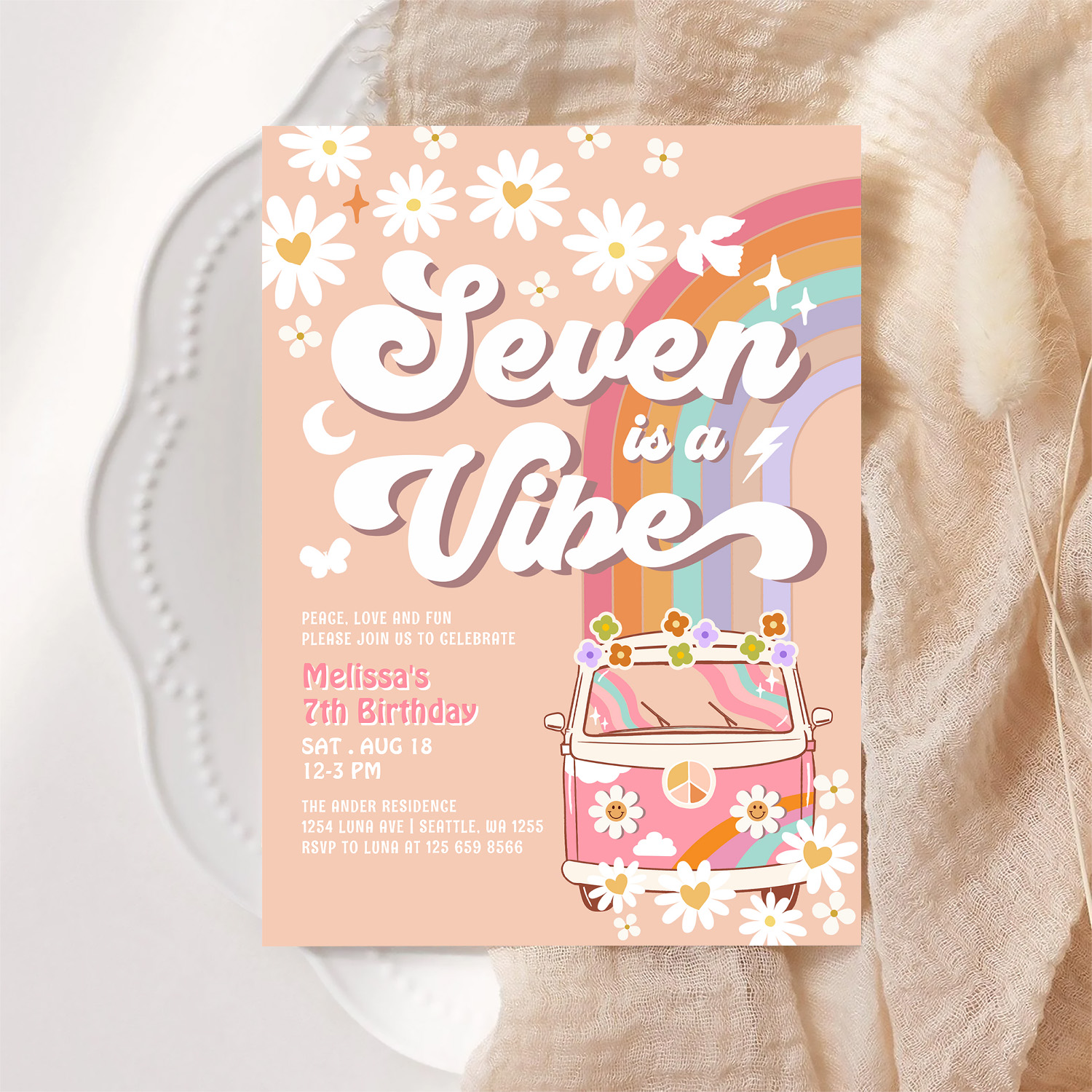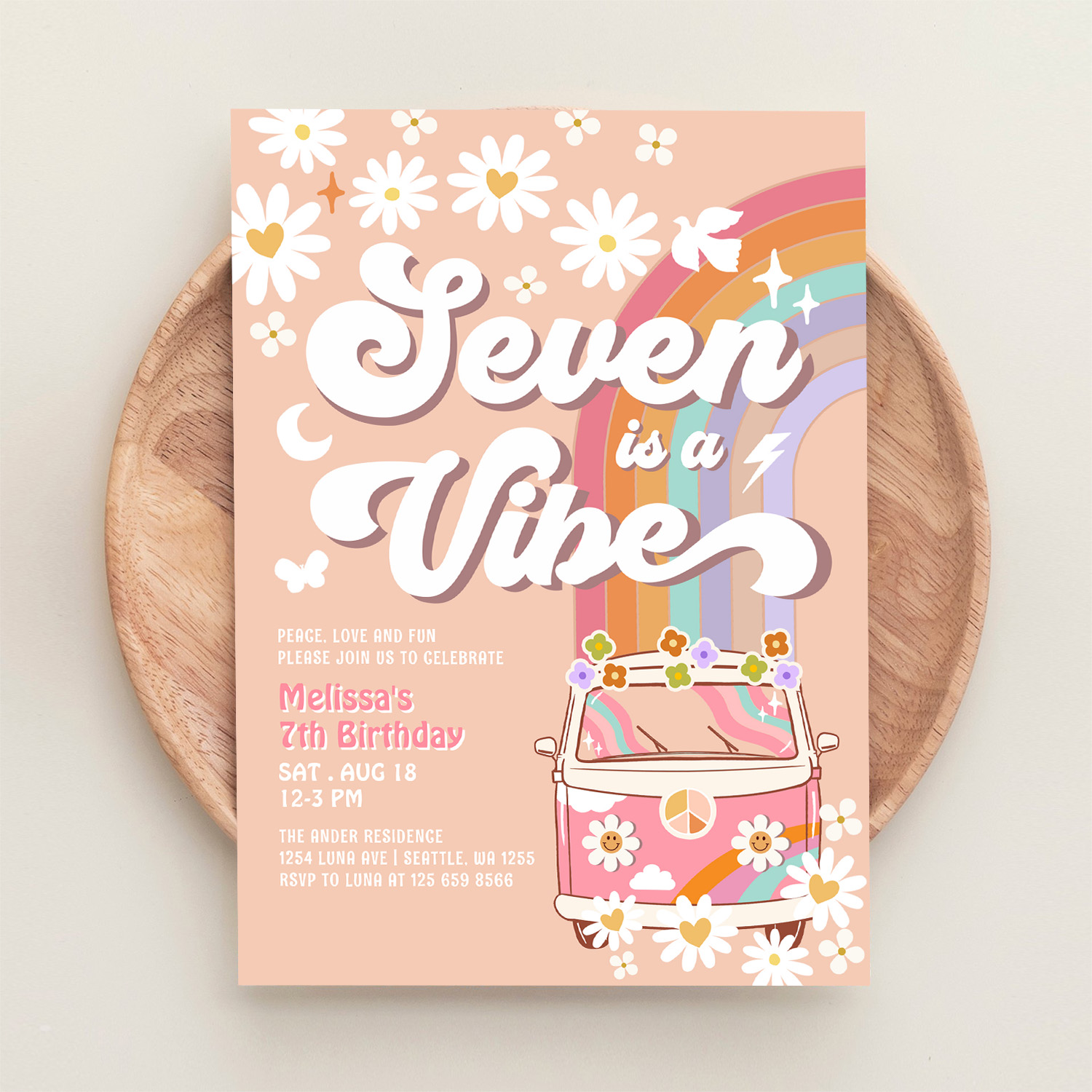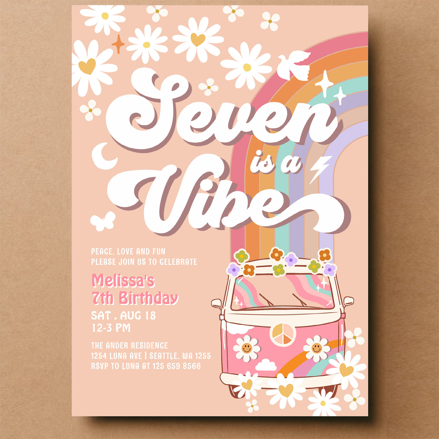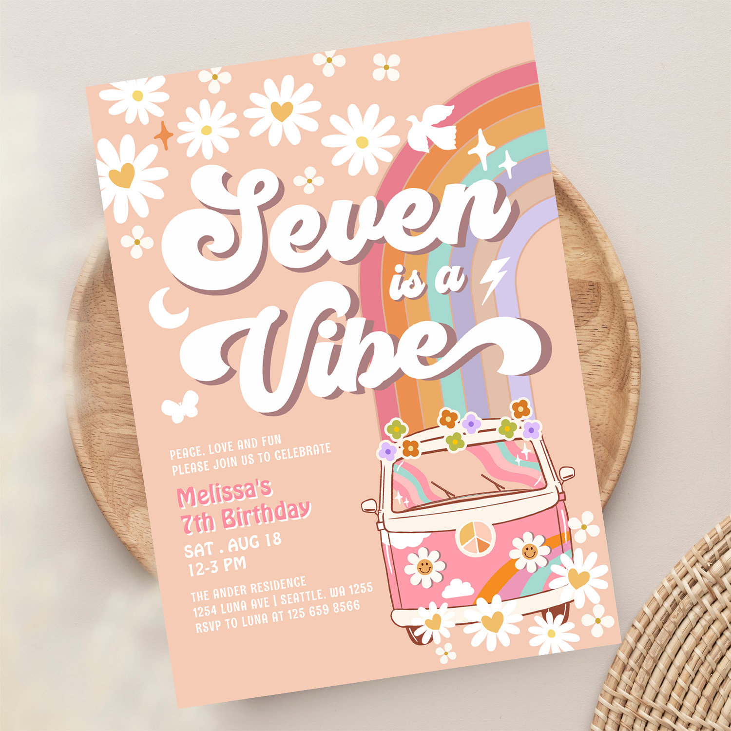 Seven Is A Vibe Pink Daisy Groovy 7th Birthday Invitation