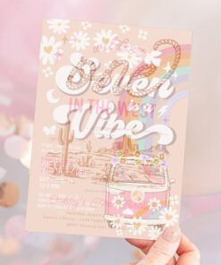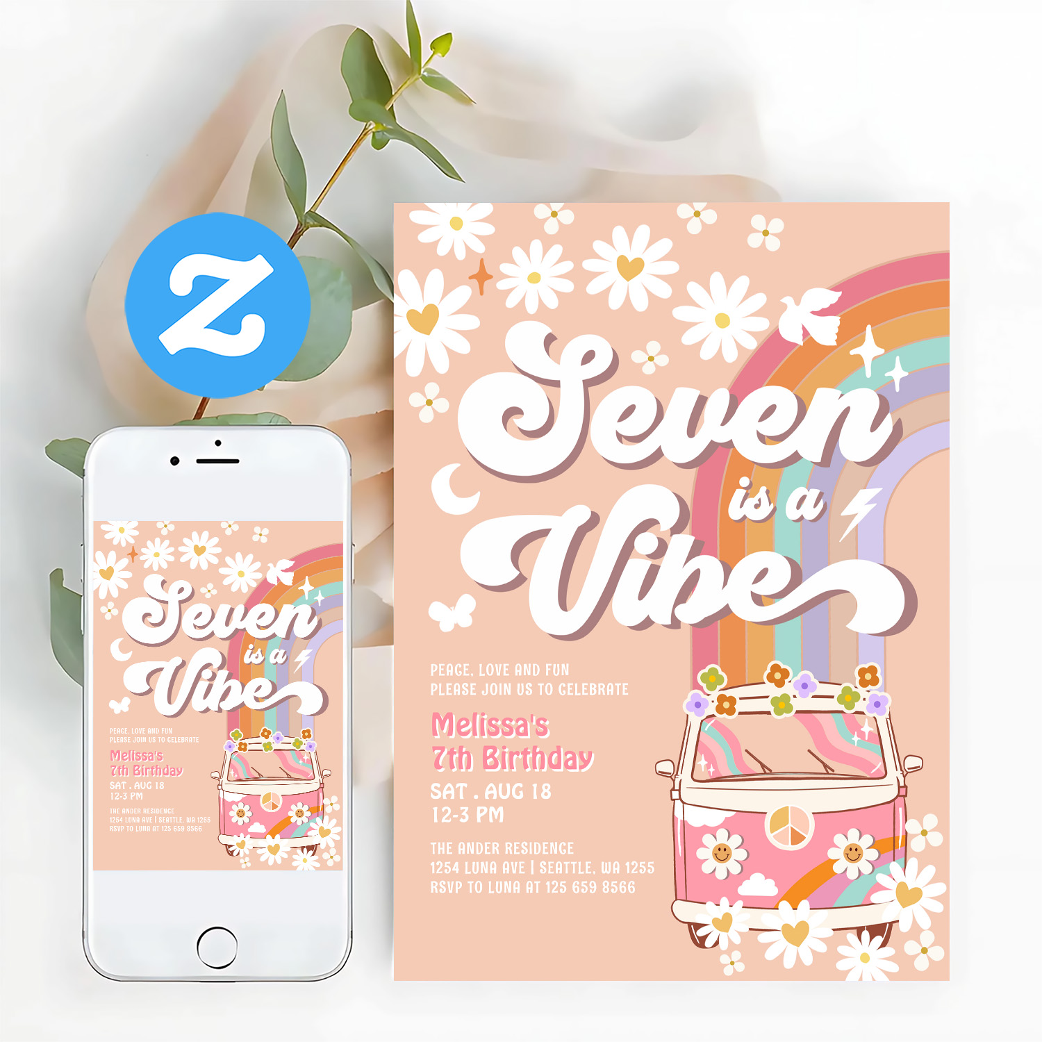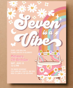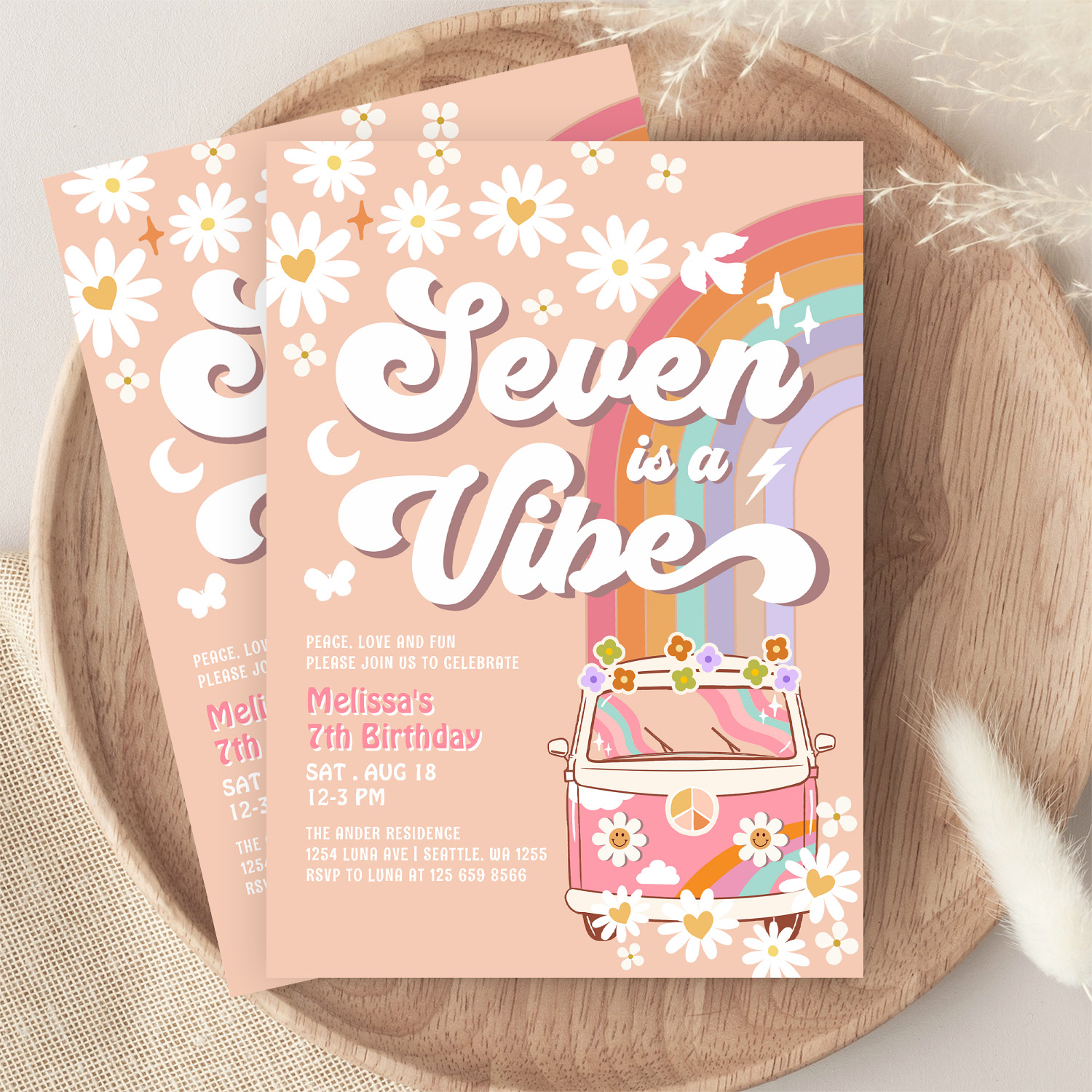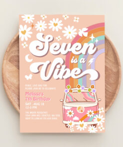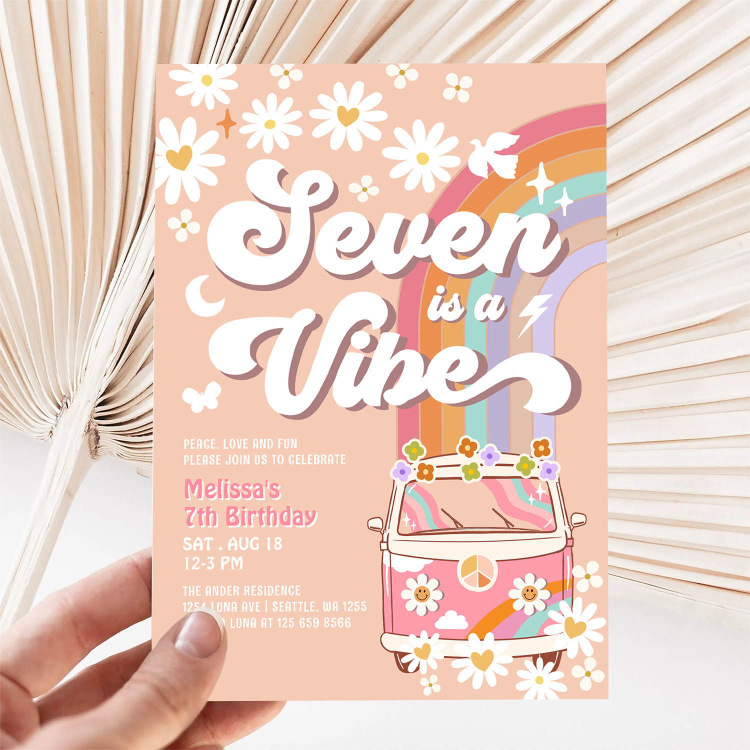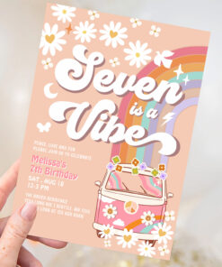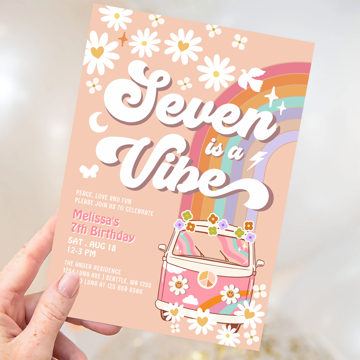 Seven Is A Vibe Pink Daisy Groovy 7th Birthday Invitation