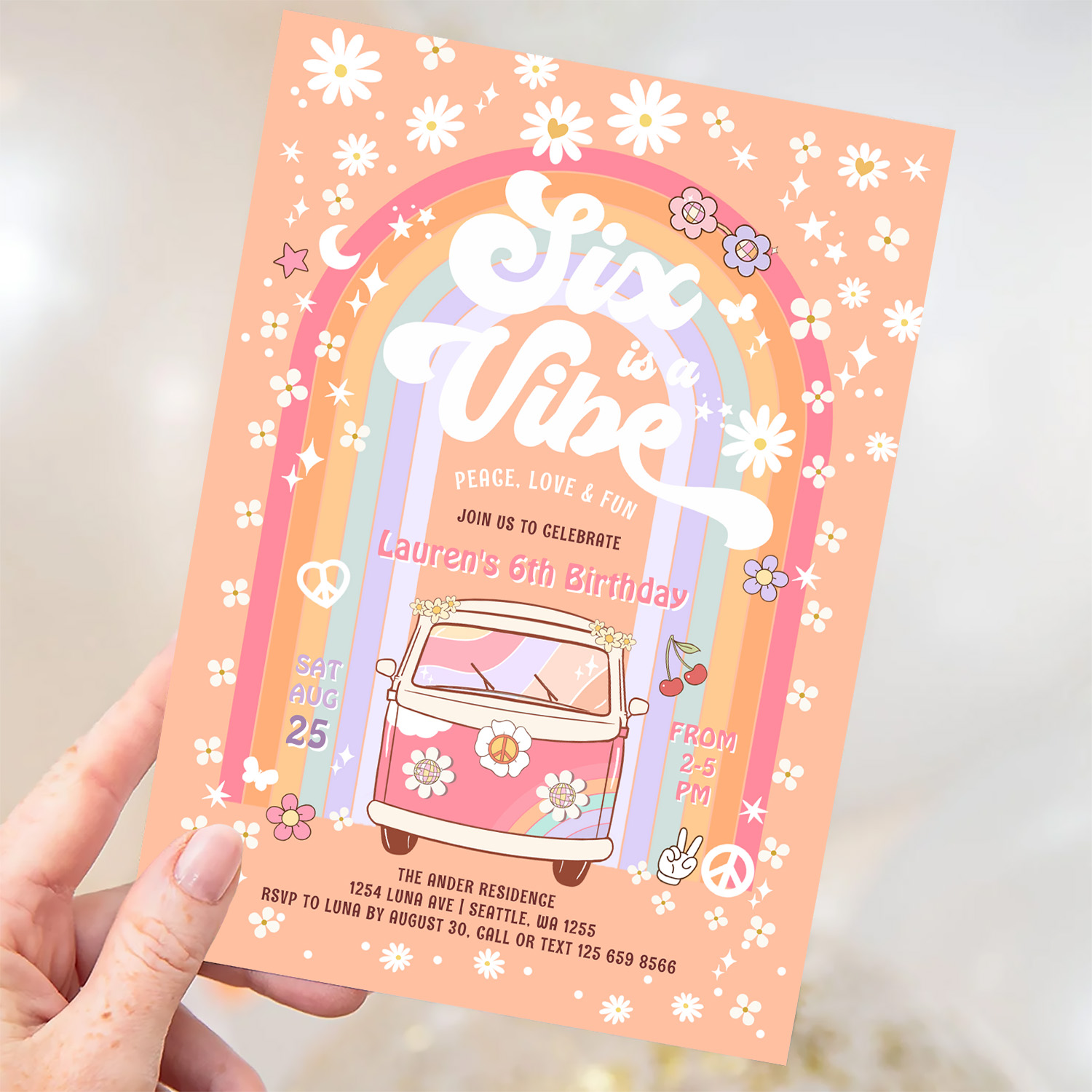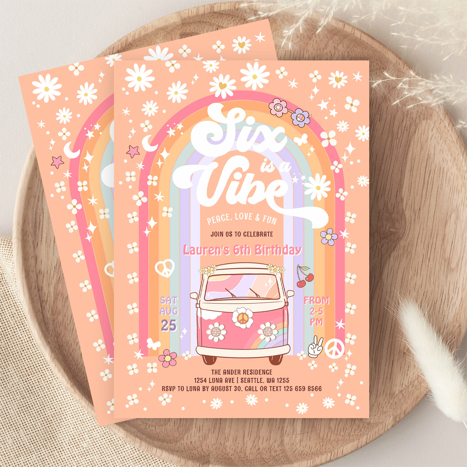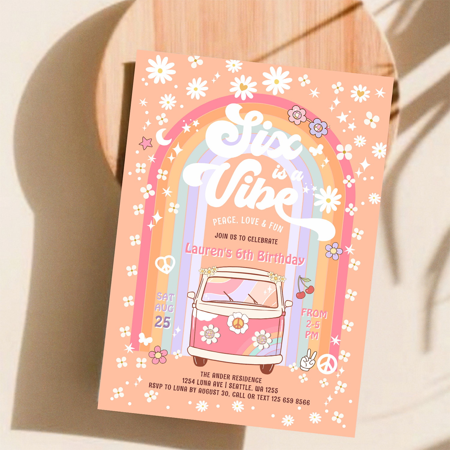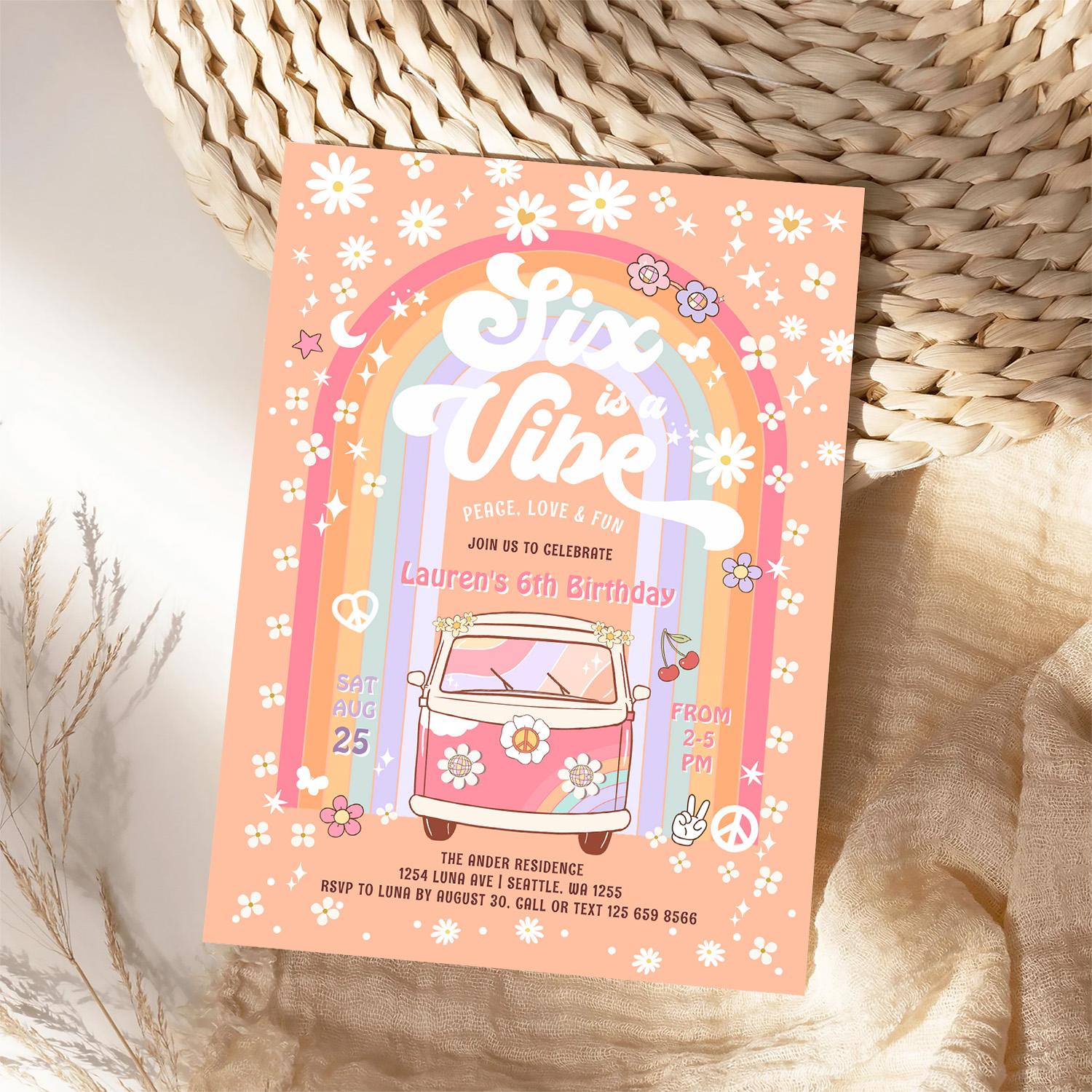 Six Is A Vibe Daisy Groovy Hippie 6th Birthday Invitation