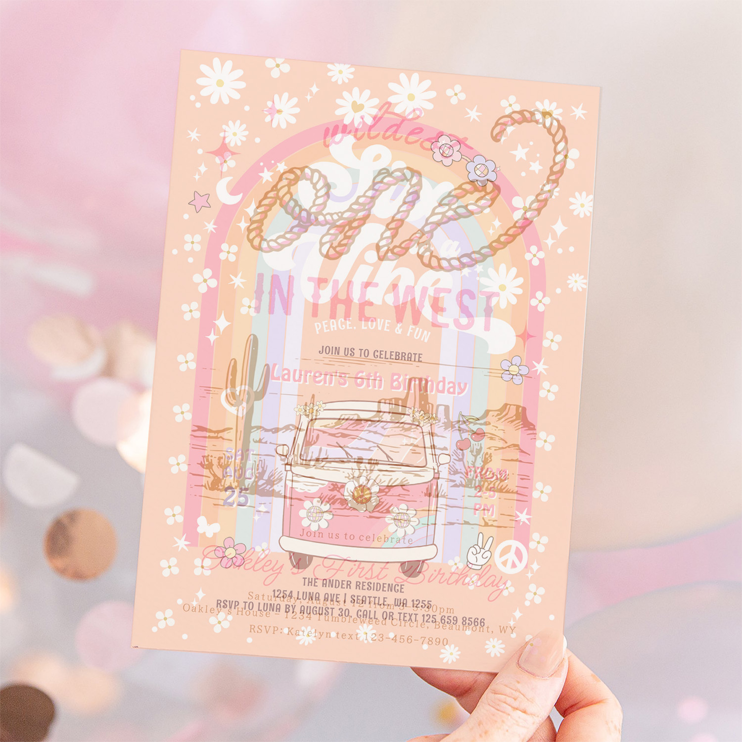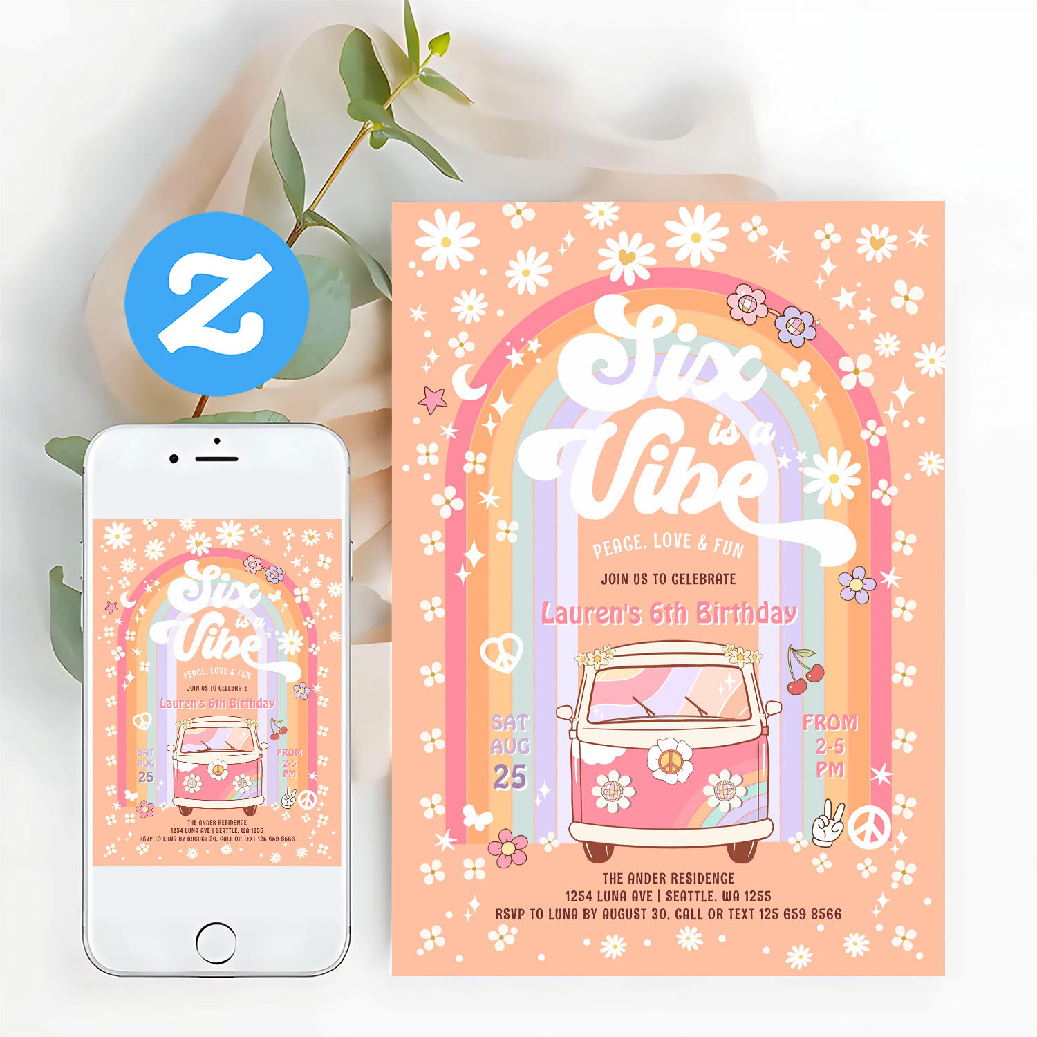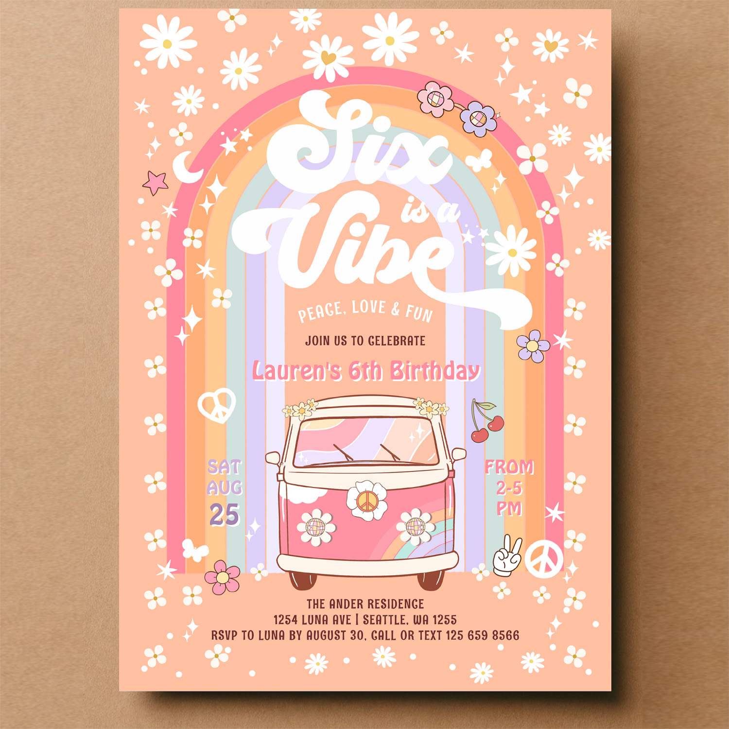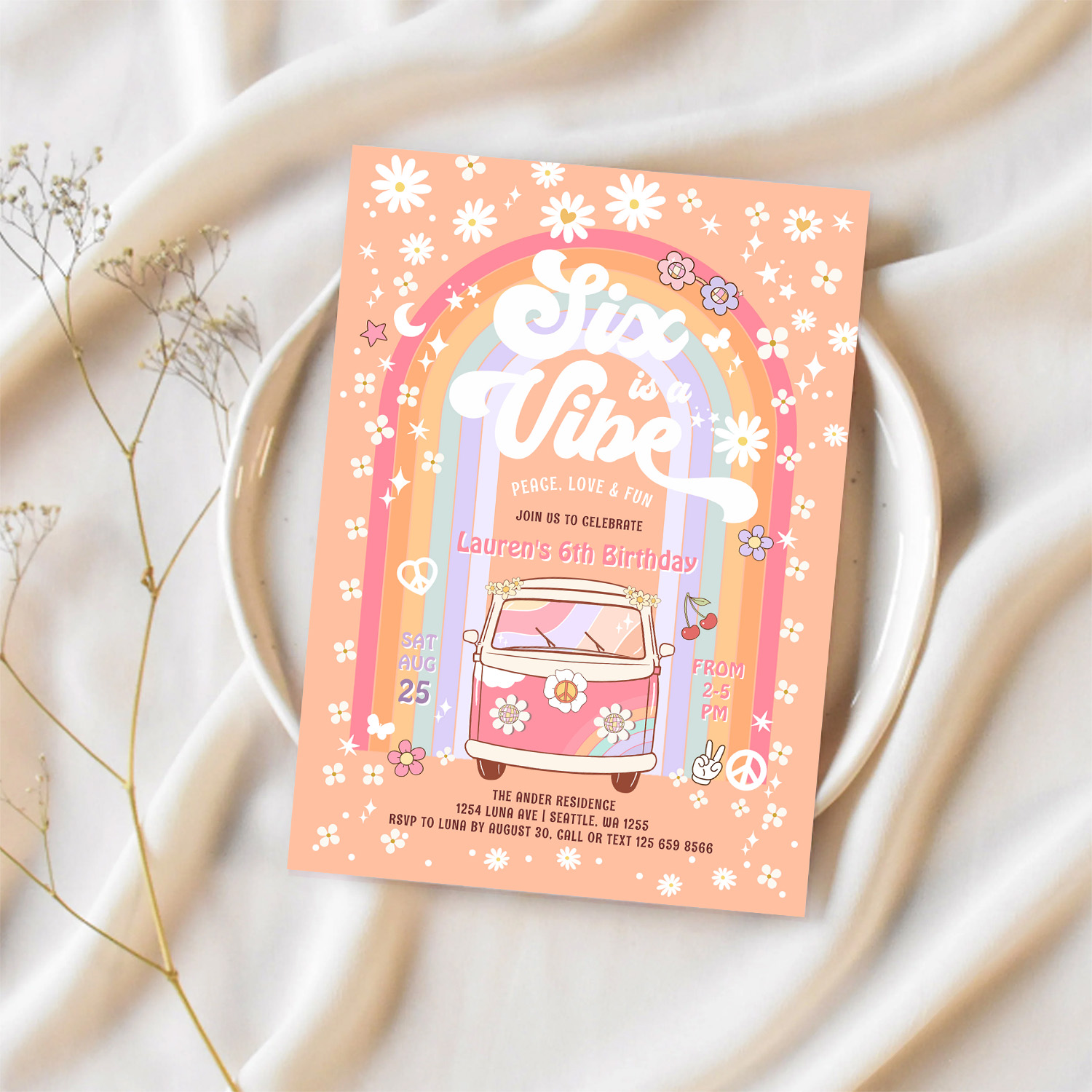 Six Is A Vibe Daisy Groovy Hippie 6th Birthday Invitation