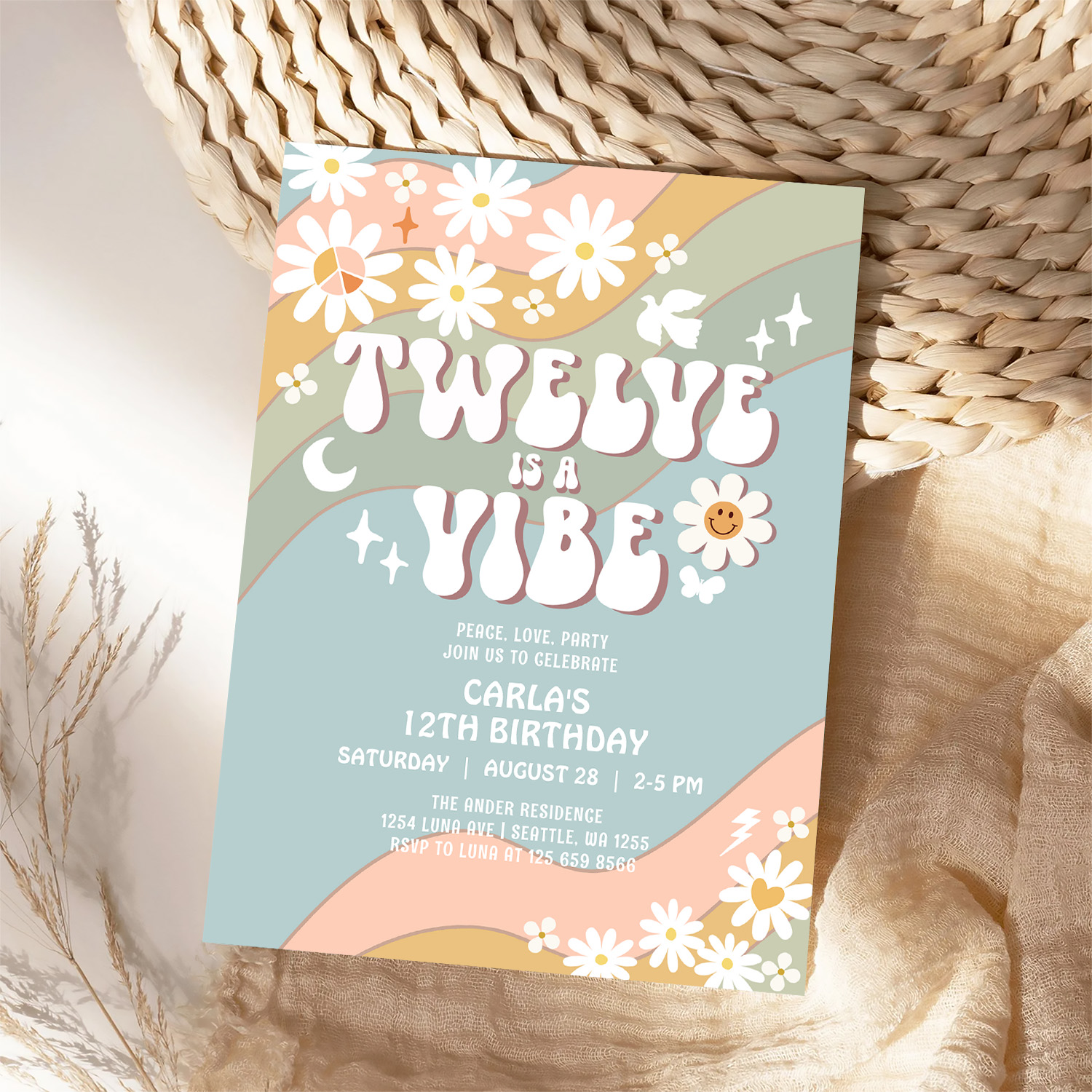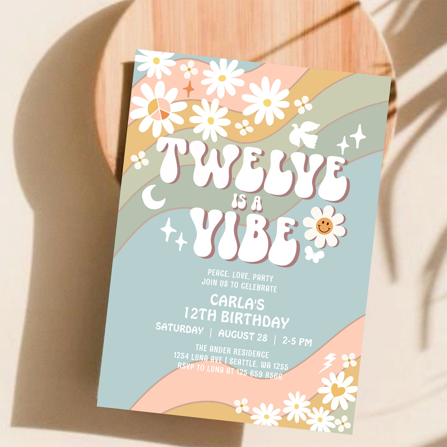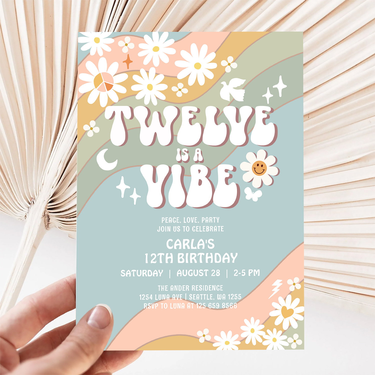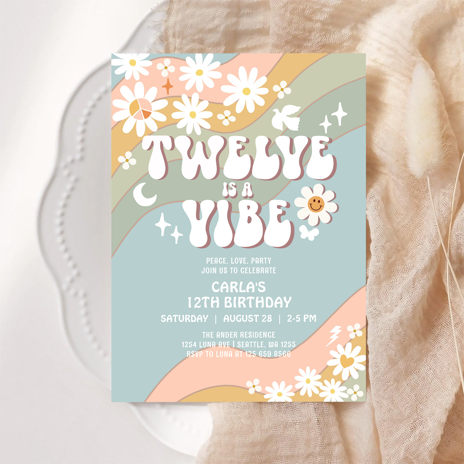 Twelve Is A Vibe Daisy Hippie 70S Retro Birthday Invitation