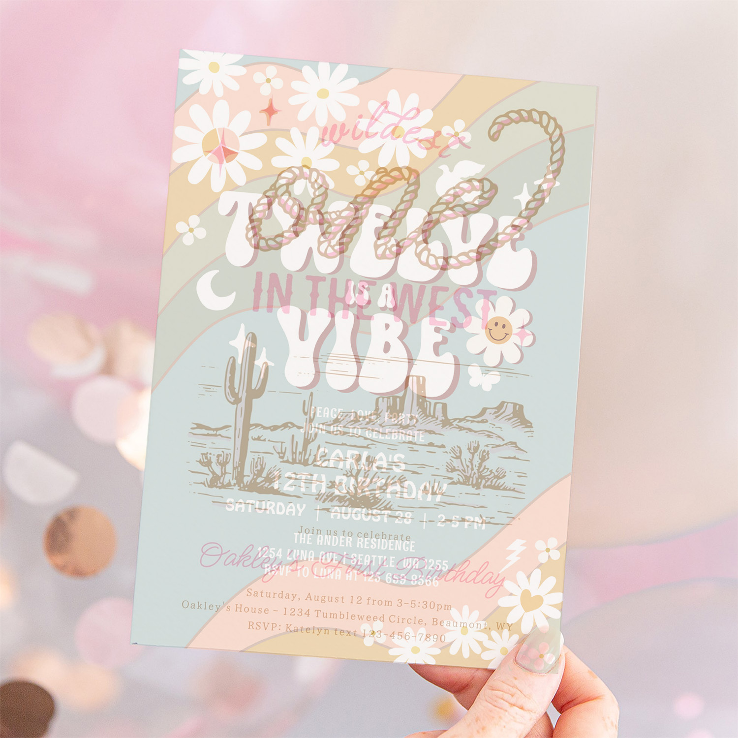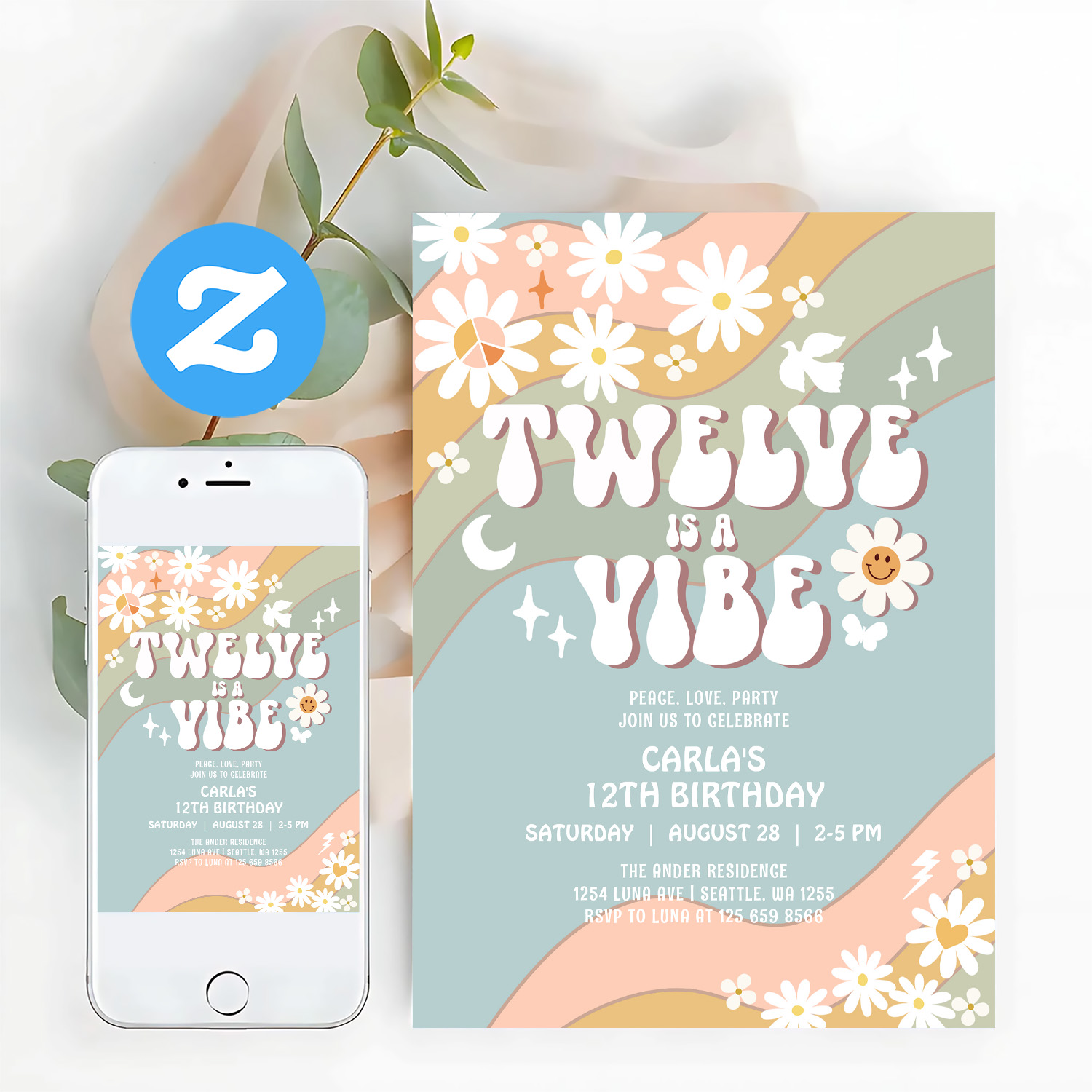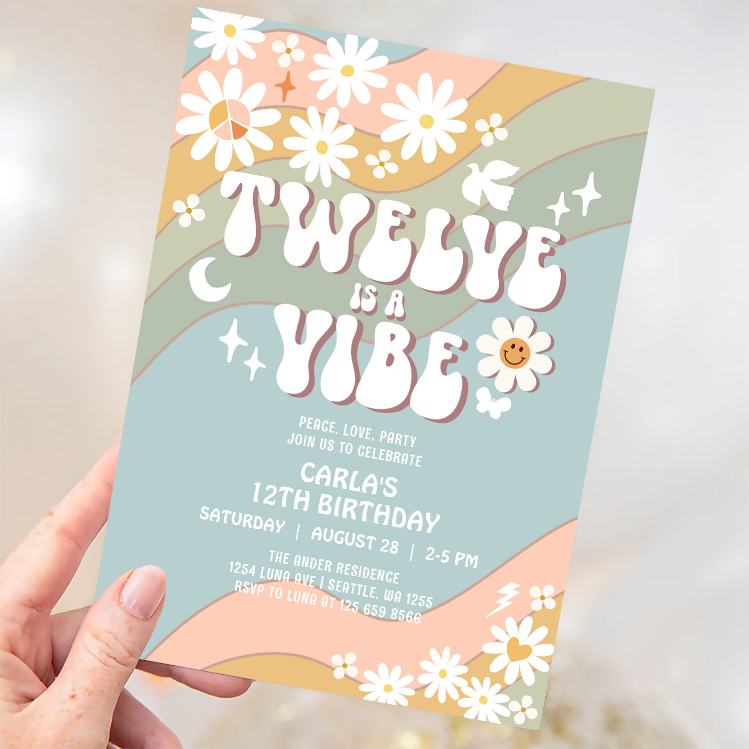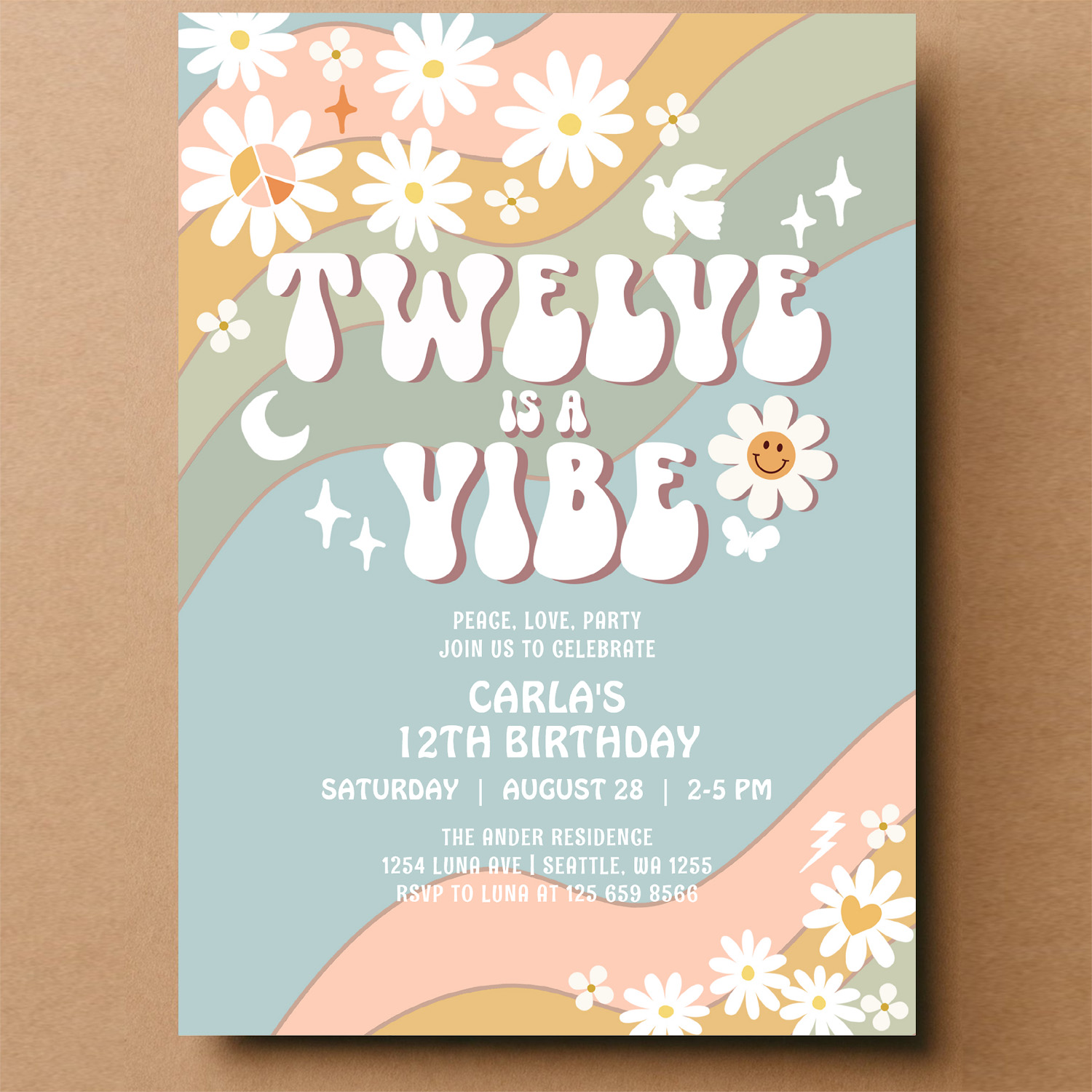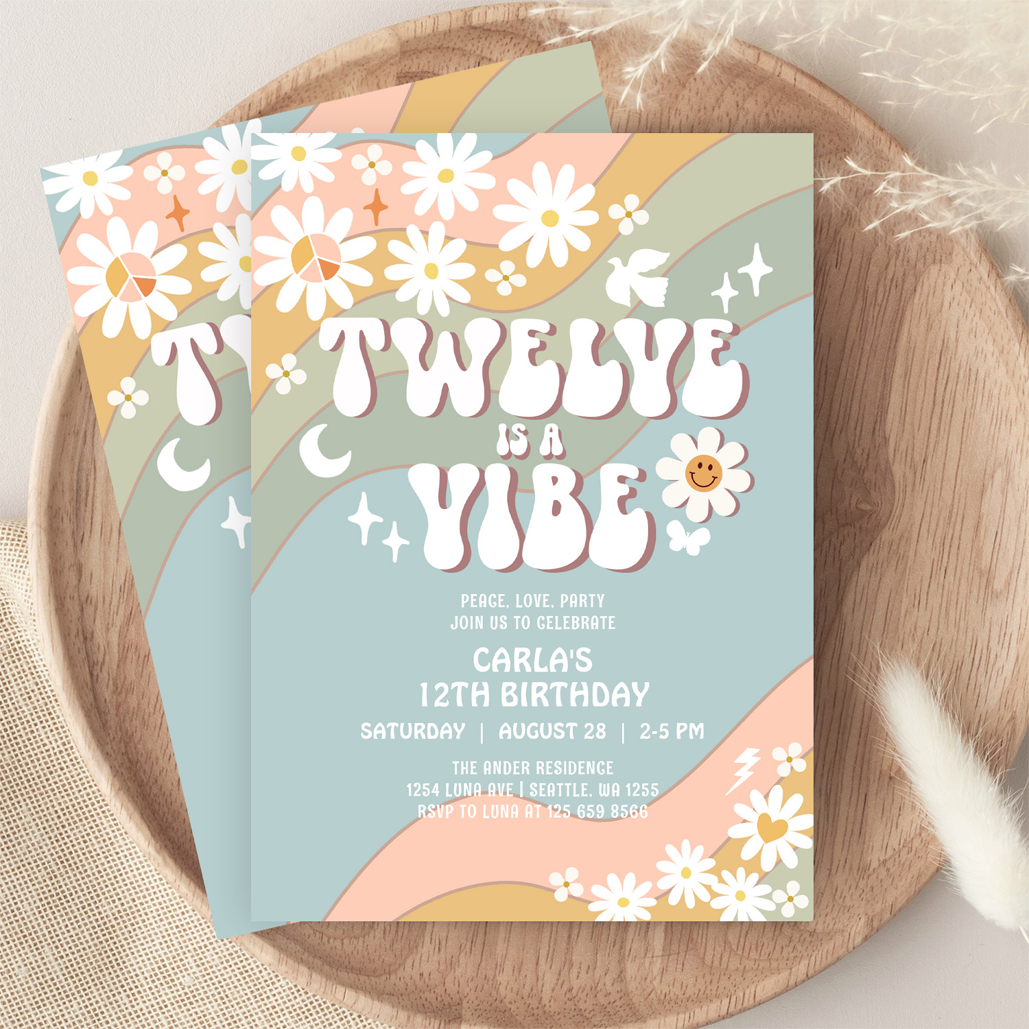 Twelve Is A Vibe Daisy Hippie 70S Retro Birthday Invitation