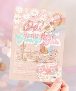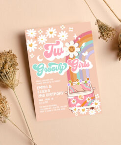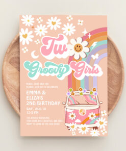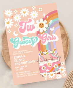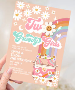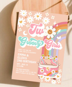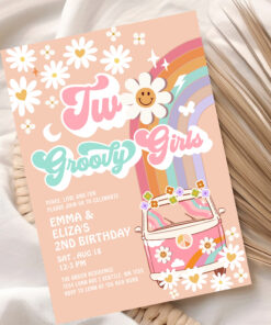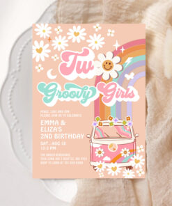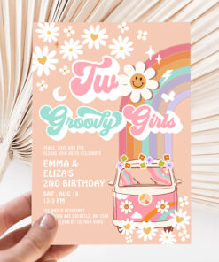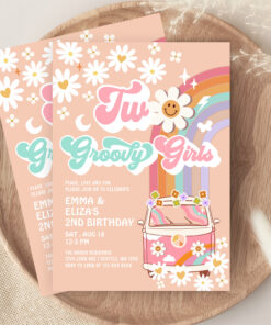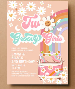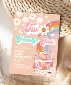 Two Groovy Girls Twin Daisy Rainbow Van Birthday Invitation