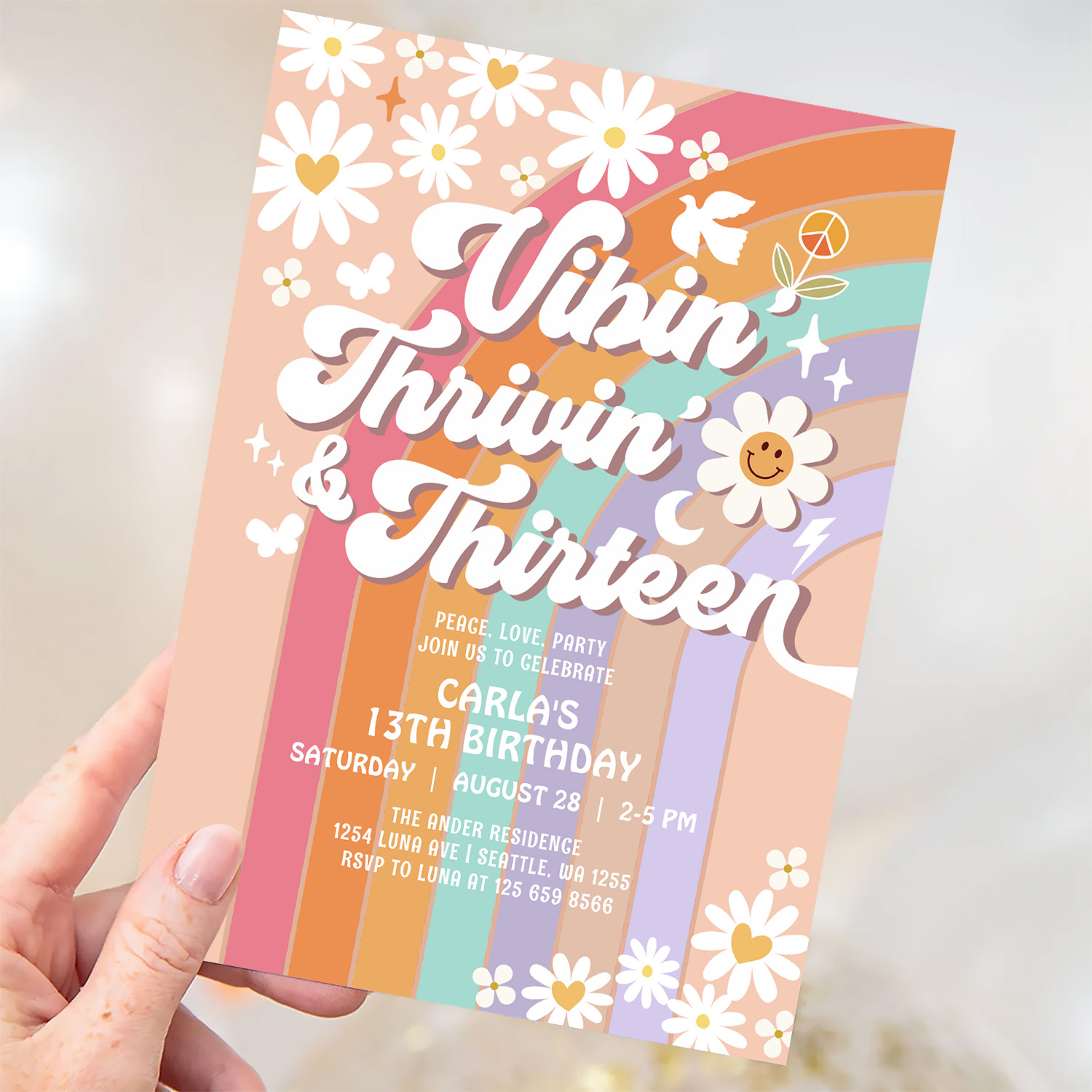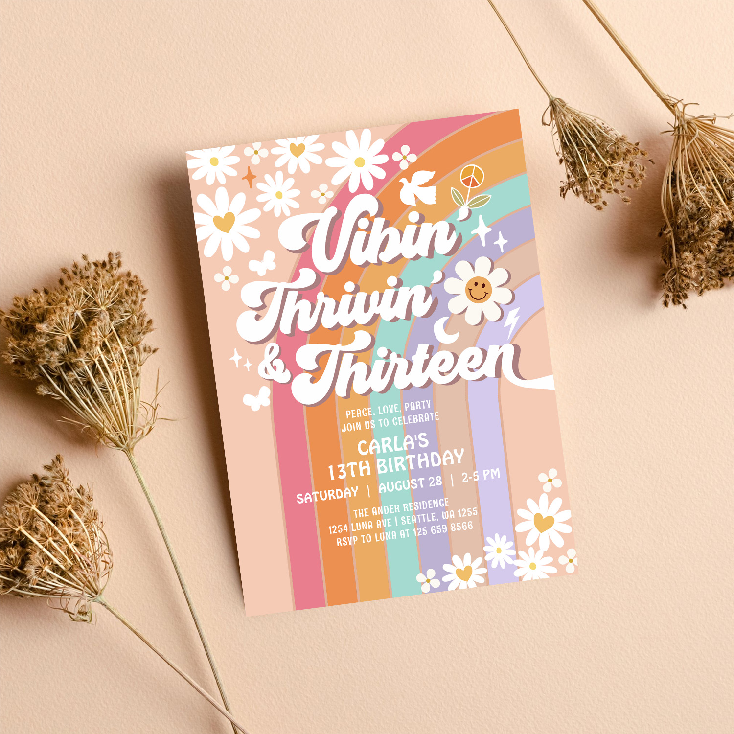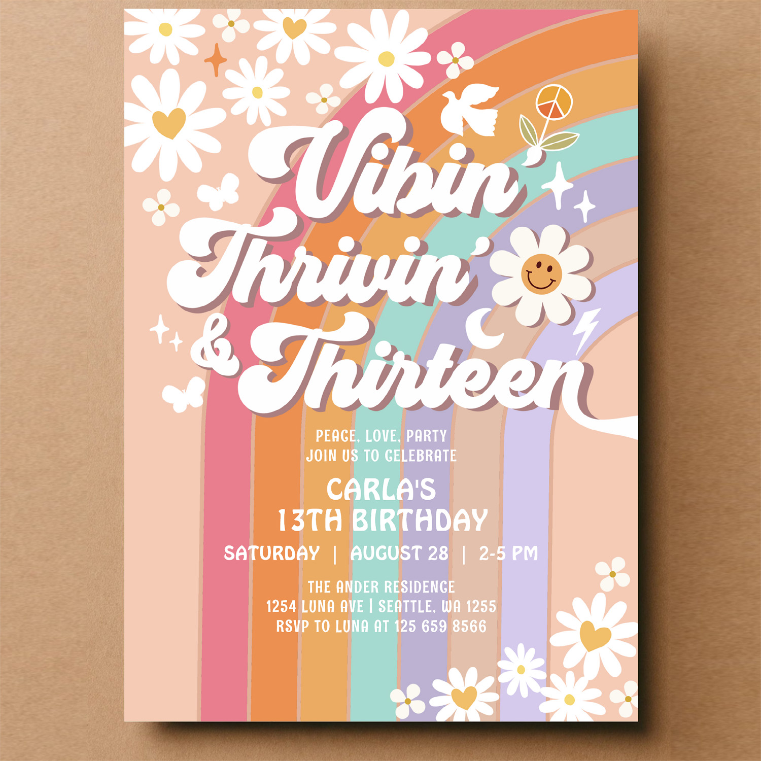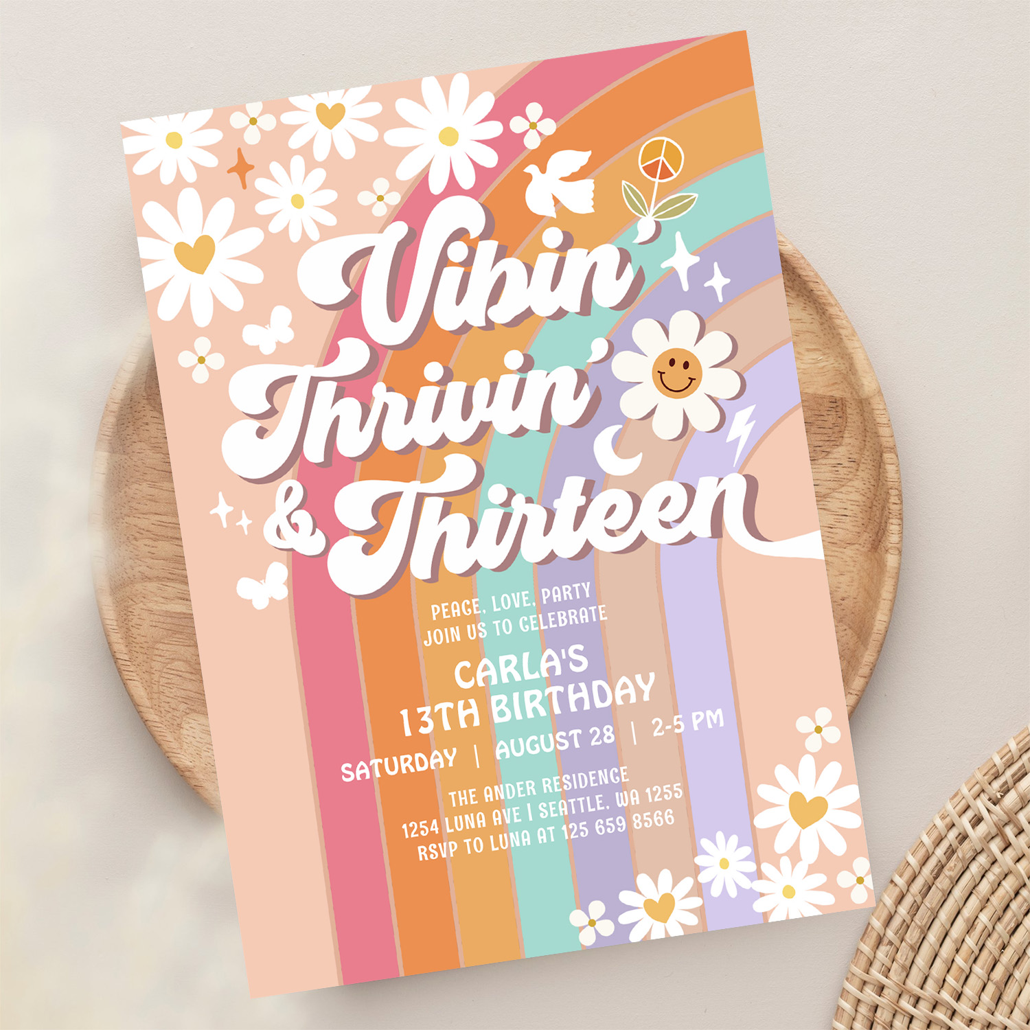 Vibin Thrivin And Thirteen Hippie 70S Birthday Invitation
