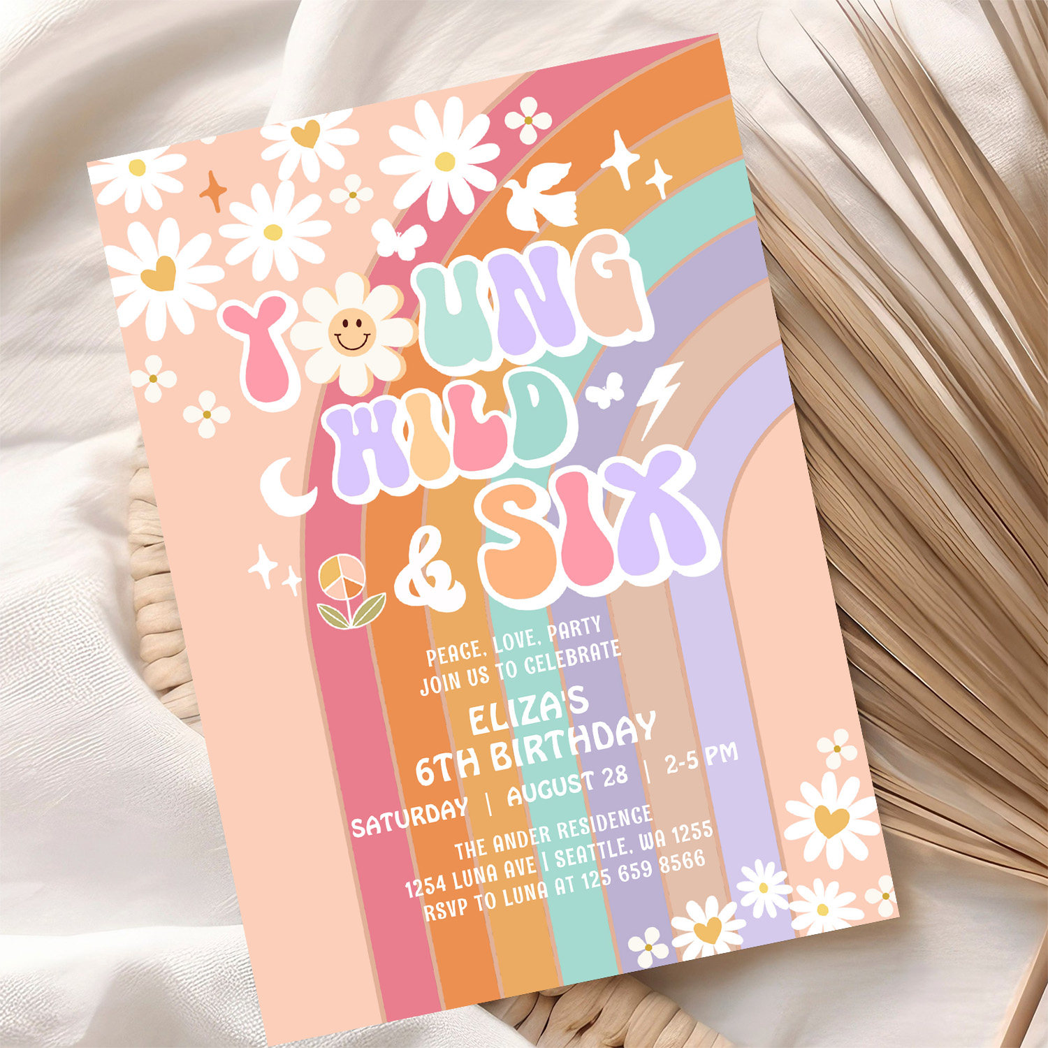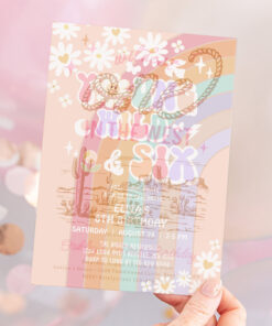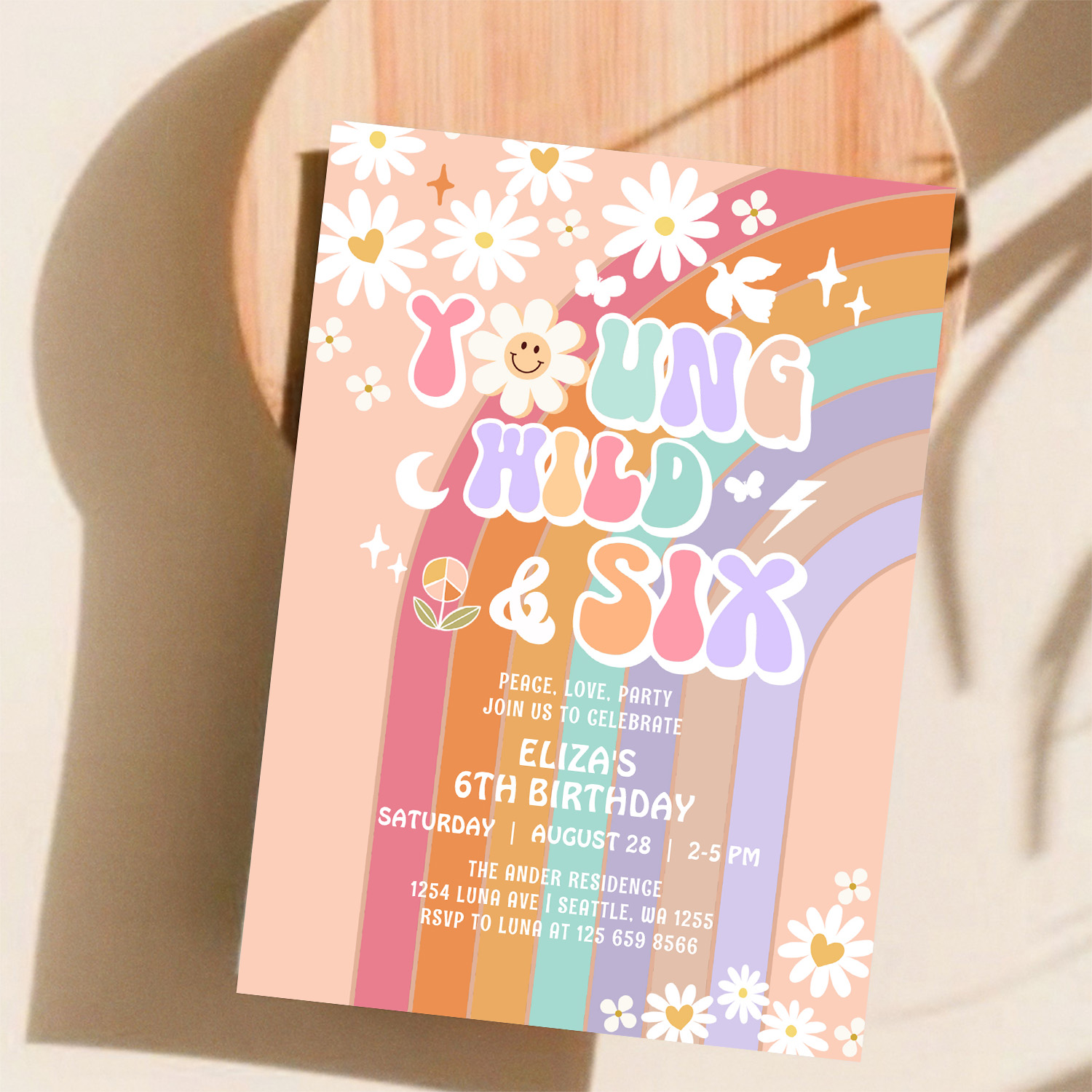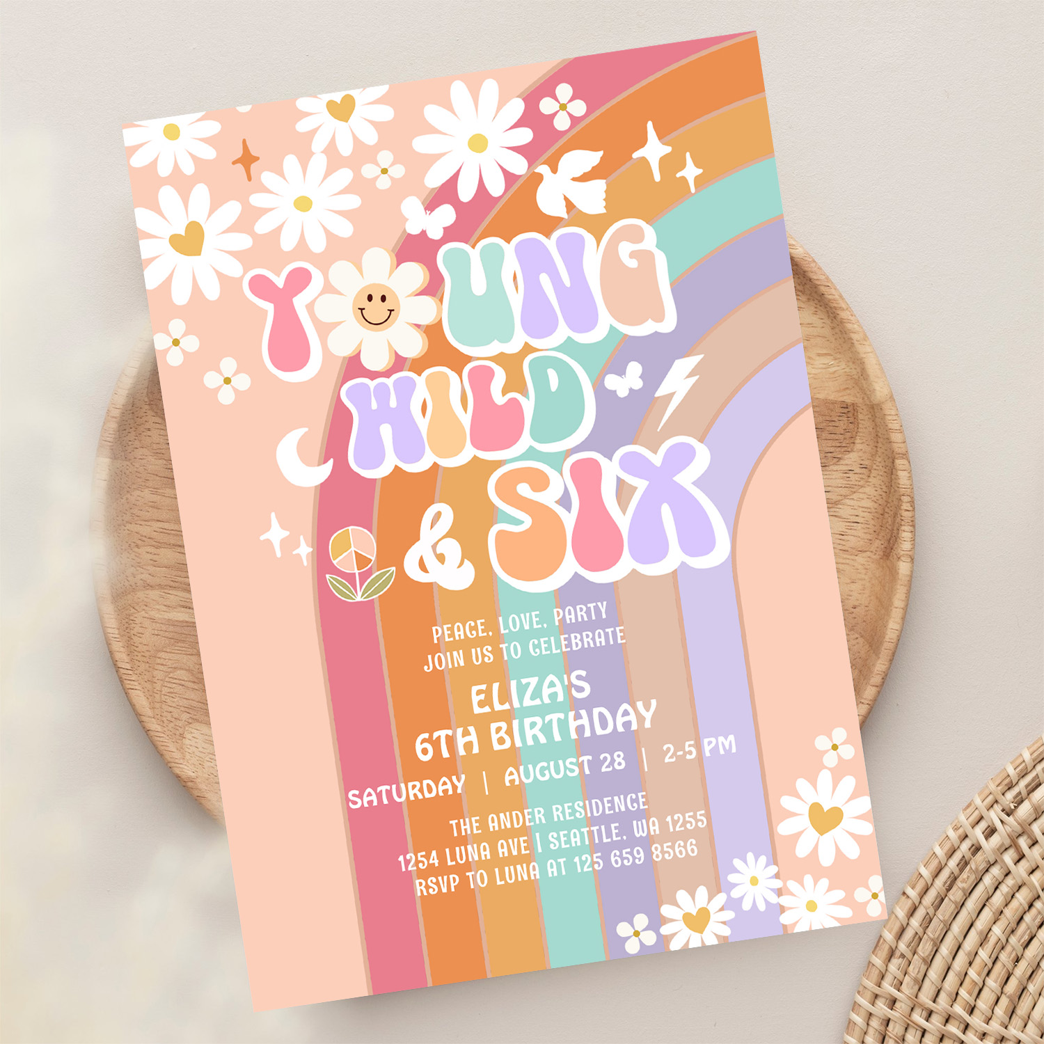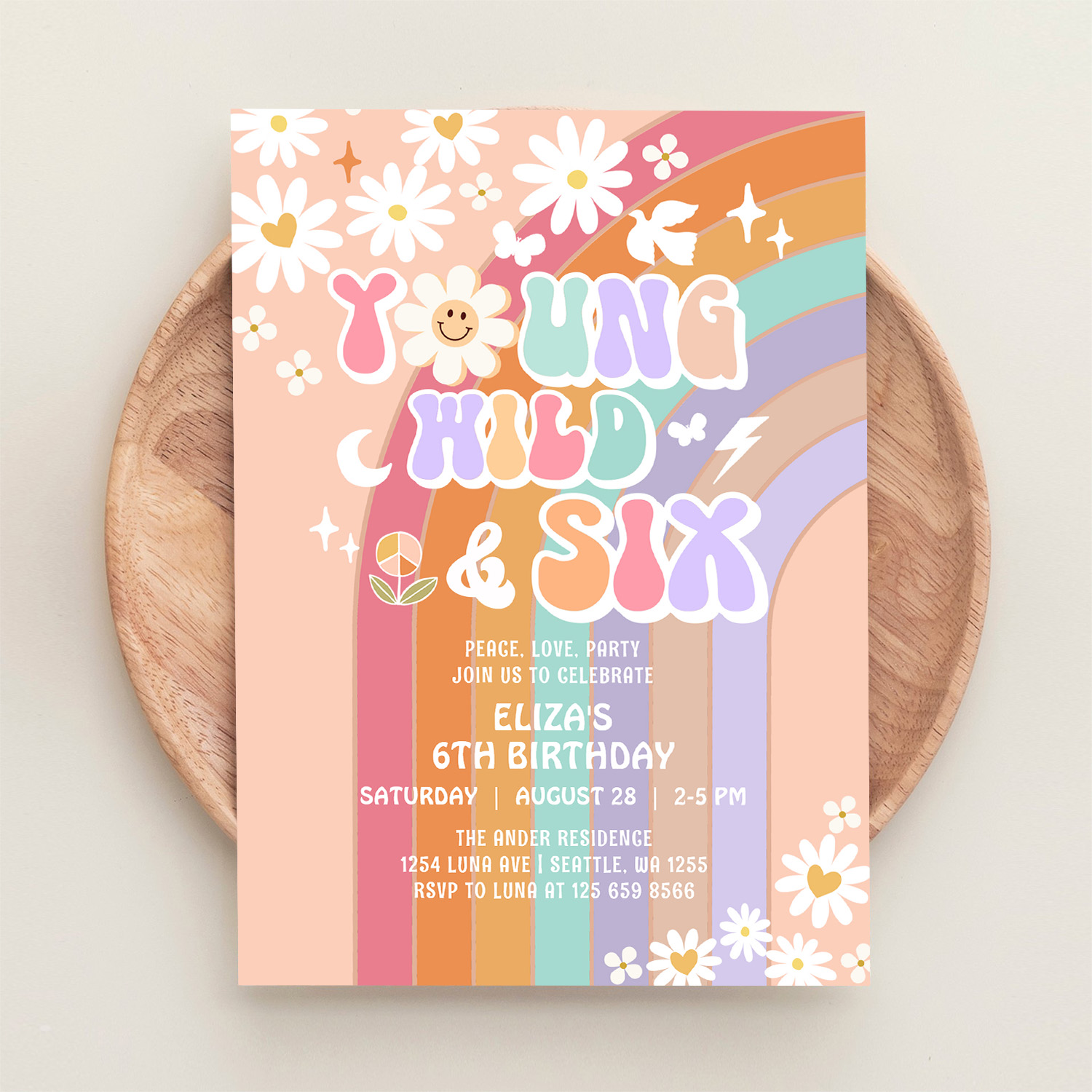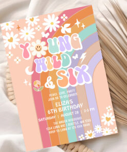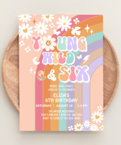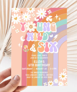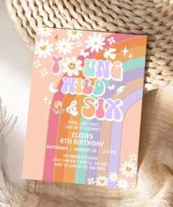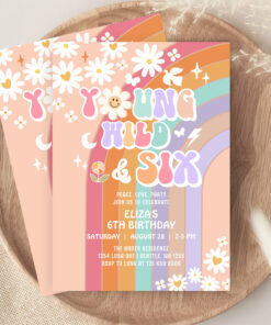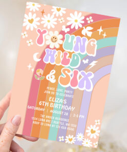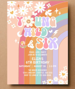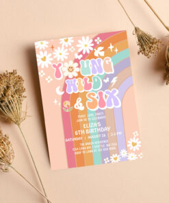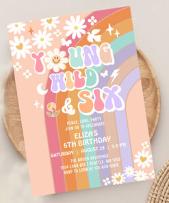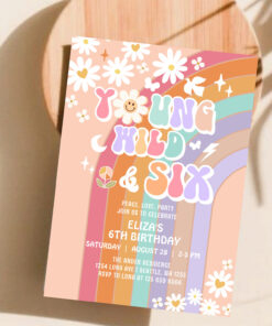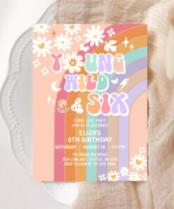 Young Wild Six Groovy Hippie Retro 6th Birthday Invitation