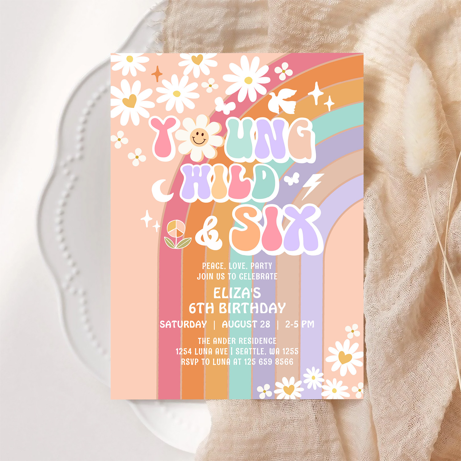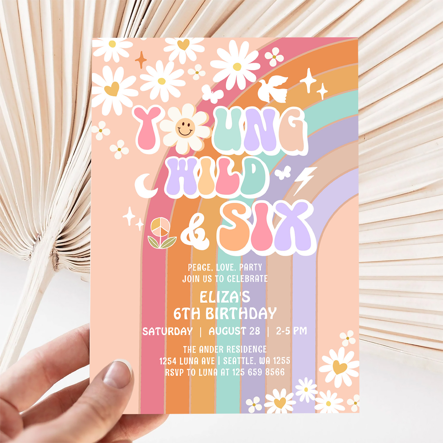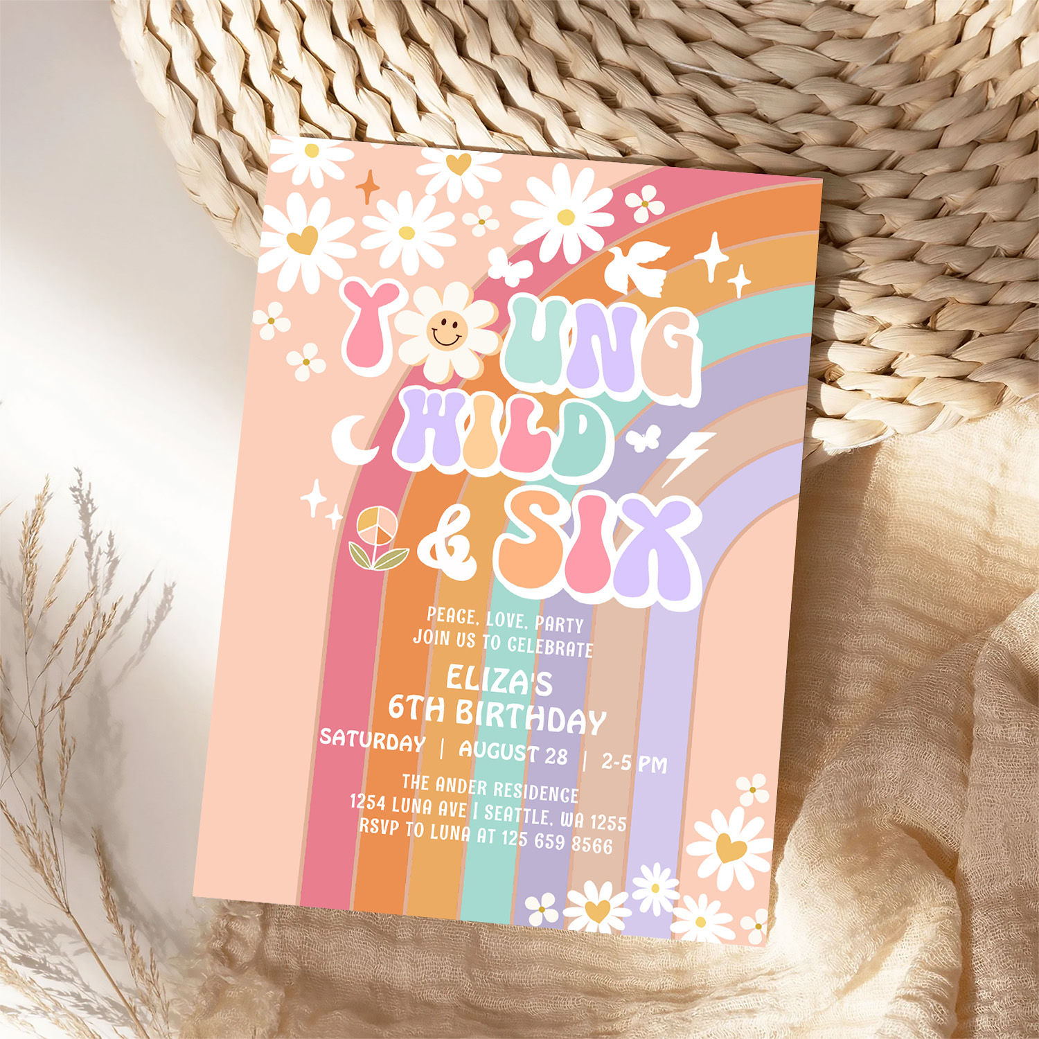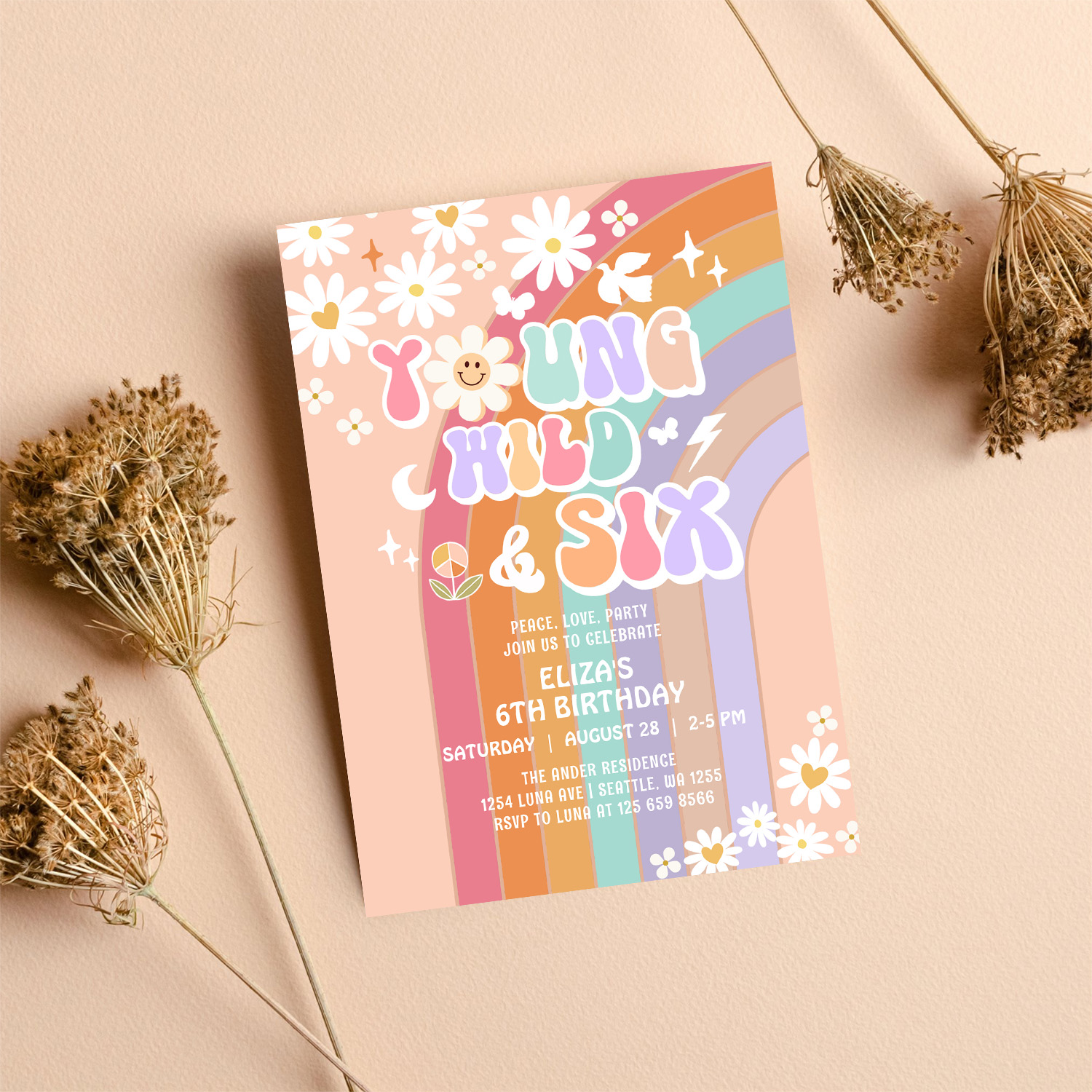 Young Wild Six Groovy Hippie Retro 6th Birthday Invitation