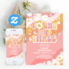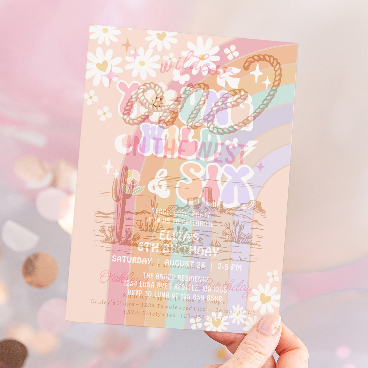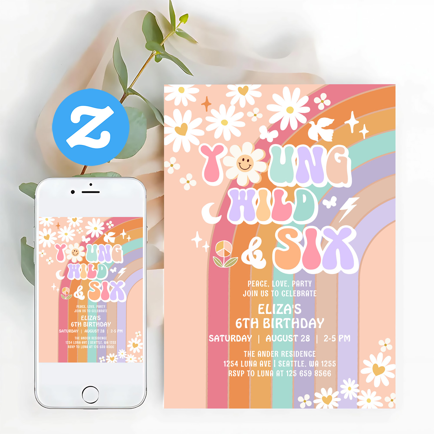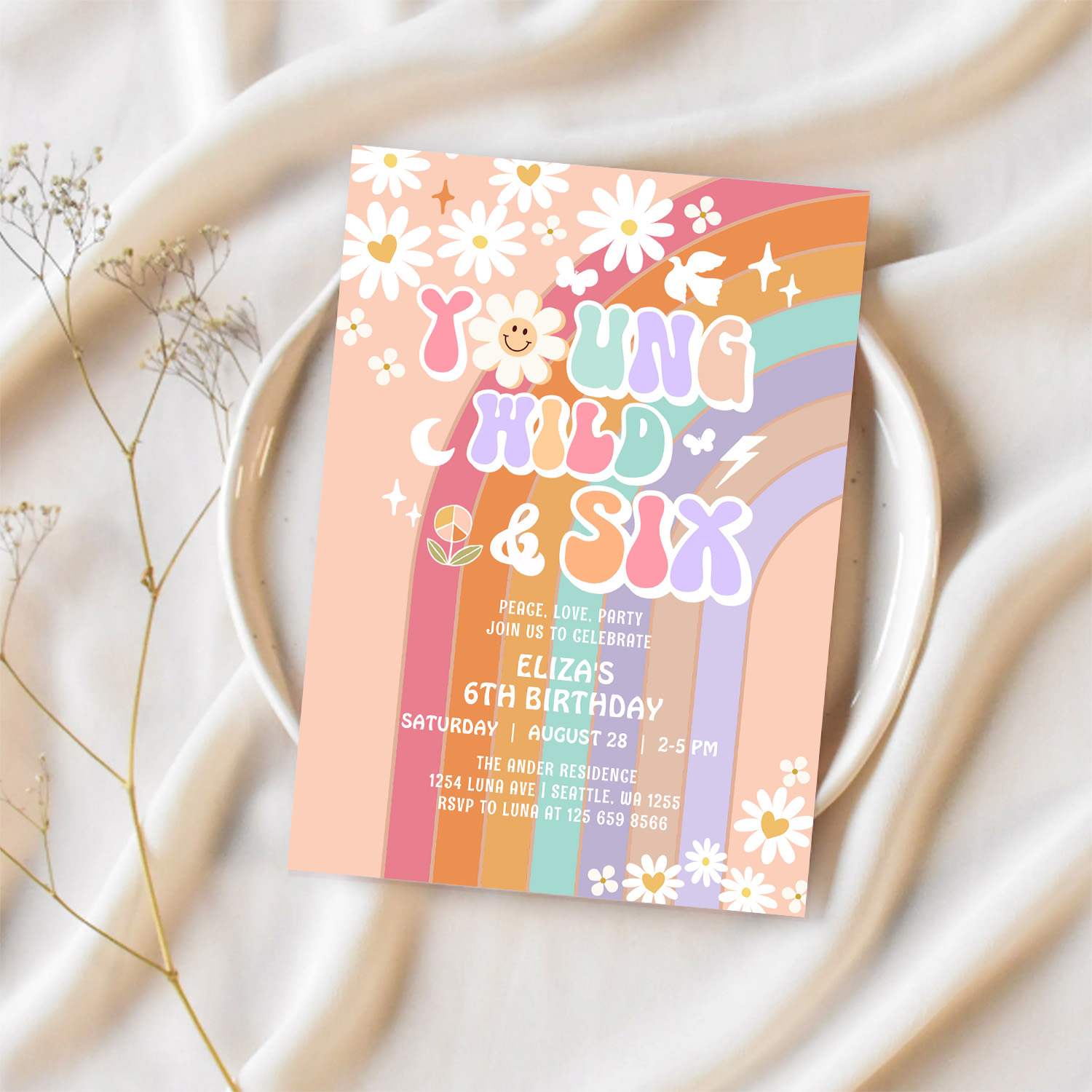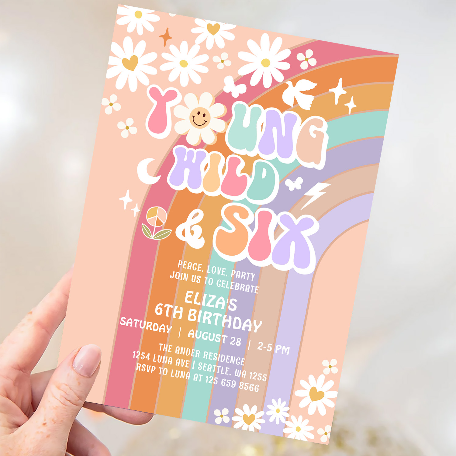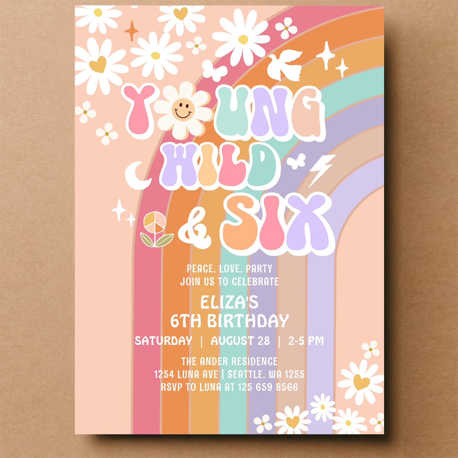 Young Wild Six Groovy Hippie Retro 6th Birthday Invitation
